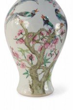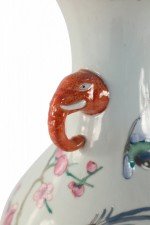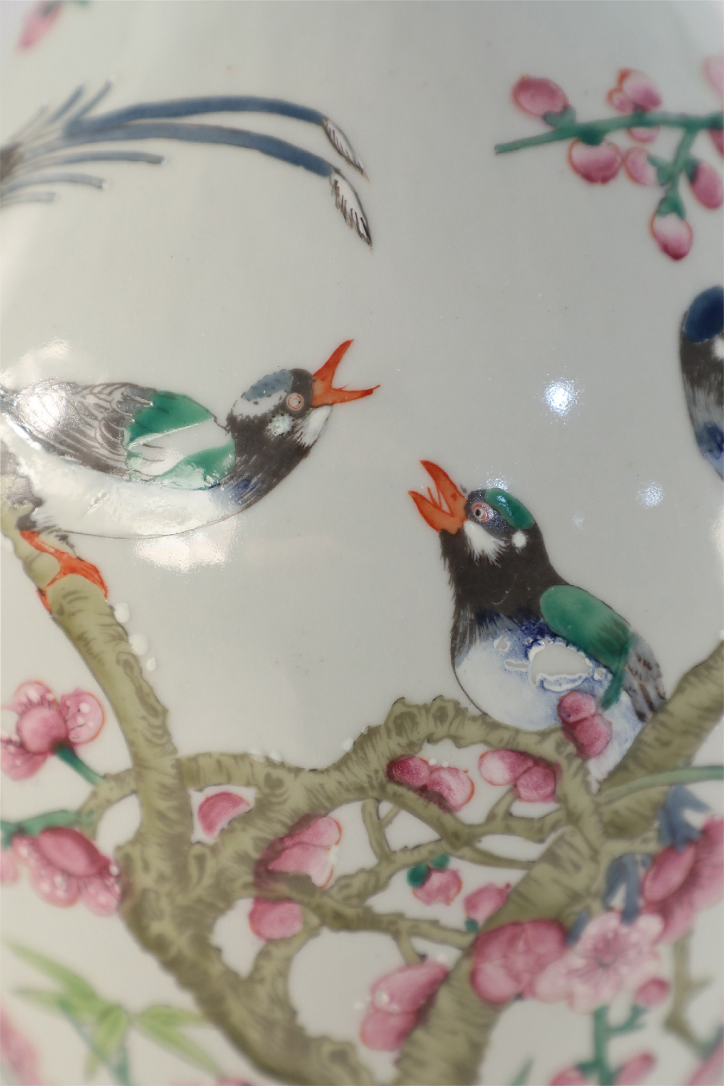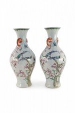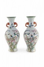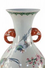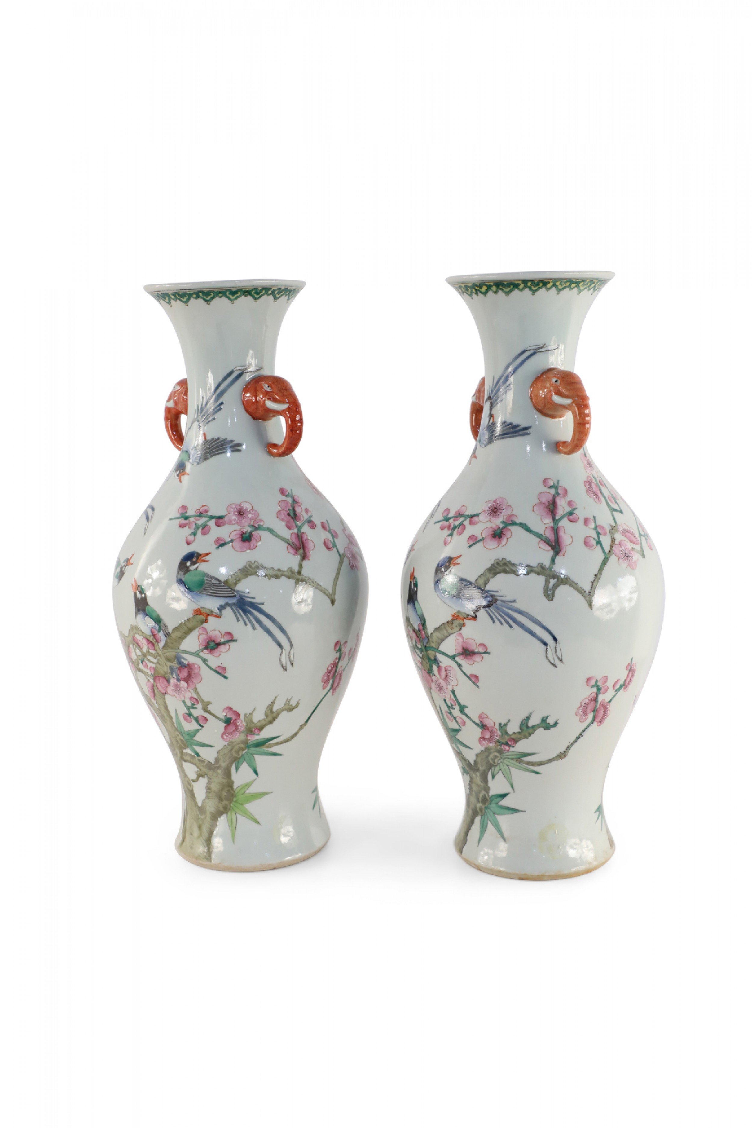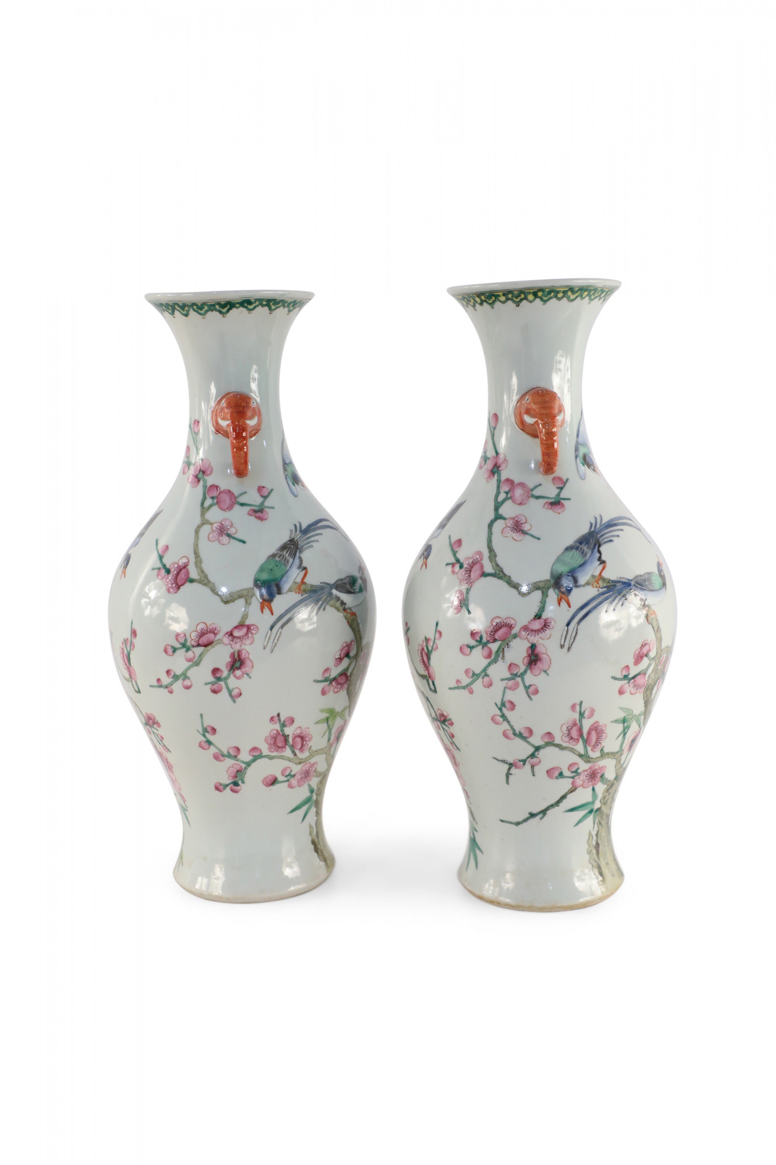 PAIR of Chinese off-white urn-shaped porcelain vases depicting groups of birds perched on flowering branches of cherry blossom trees and one bird flying above, positioned between two orange, elephant handles that adorn the necks (PRICED AS PAIR).