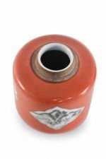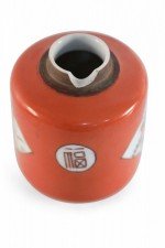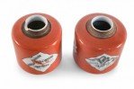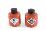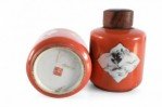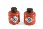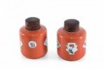 PAIR of Antique Chinese (Early 20th Century) orange porcelain jars depicting white medallions with imagery of fish, seaweed and pastoral scenes and topped with wooden lids (date mark on bottom, see photos) (PRICED AS PAIR).