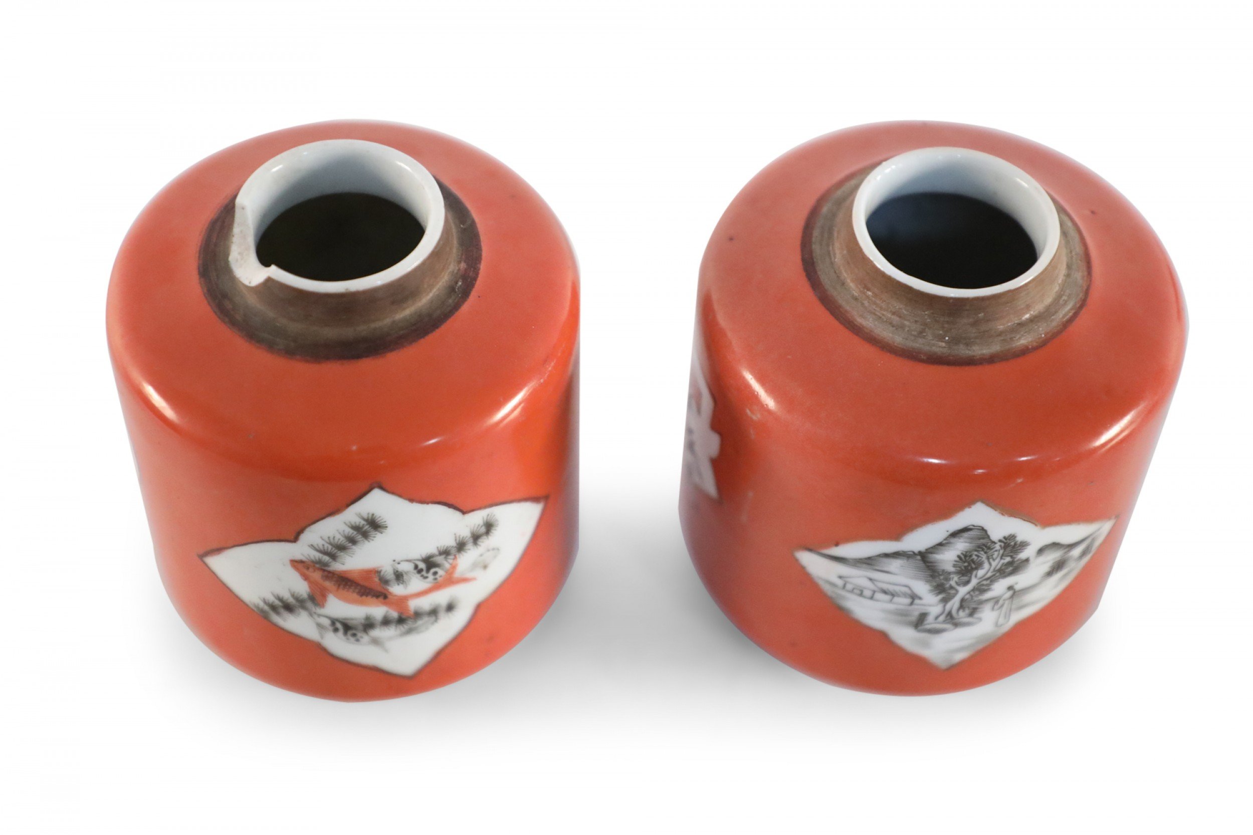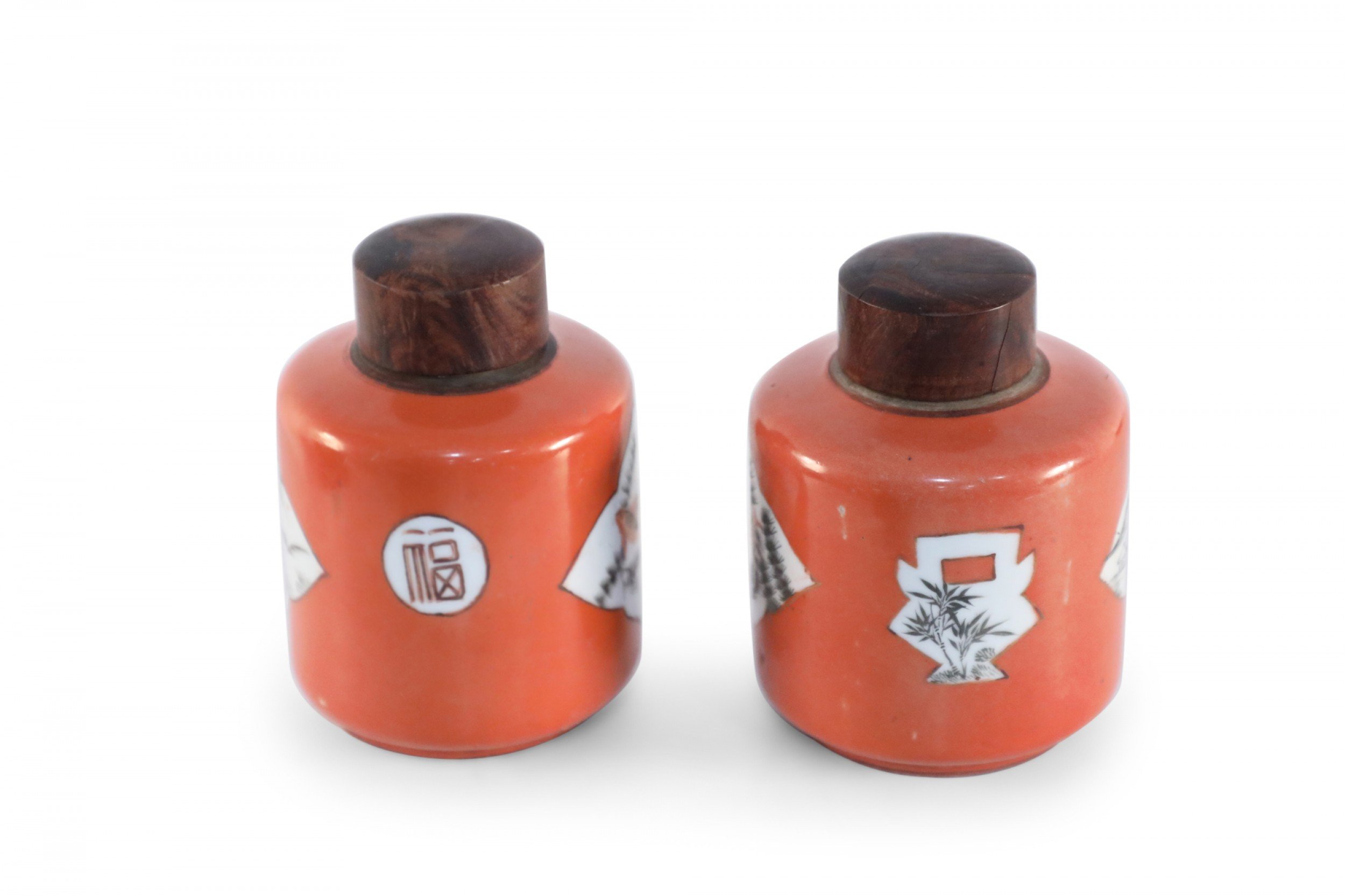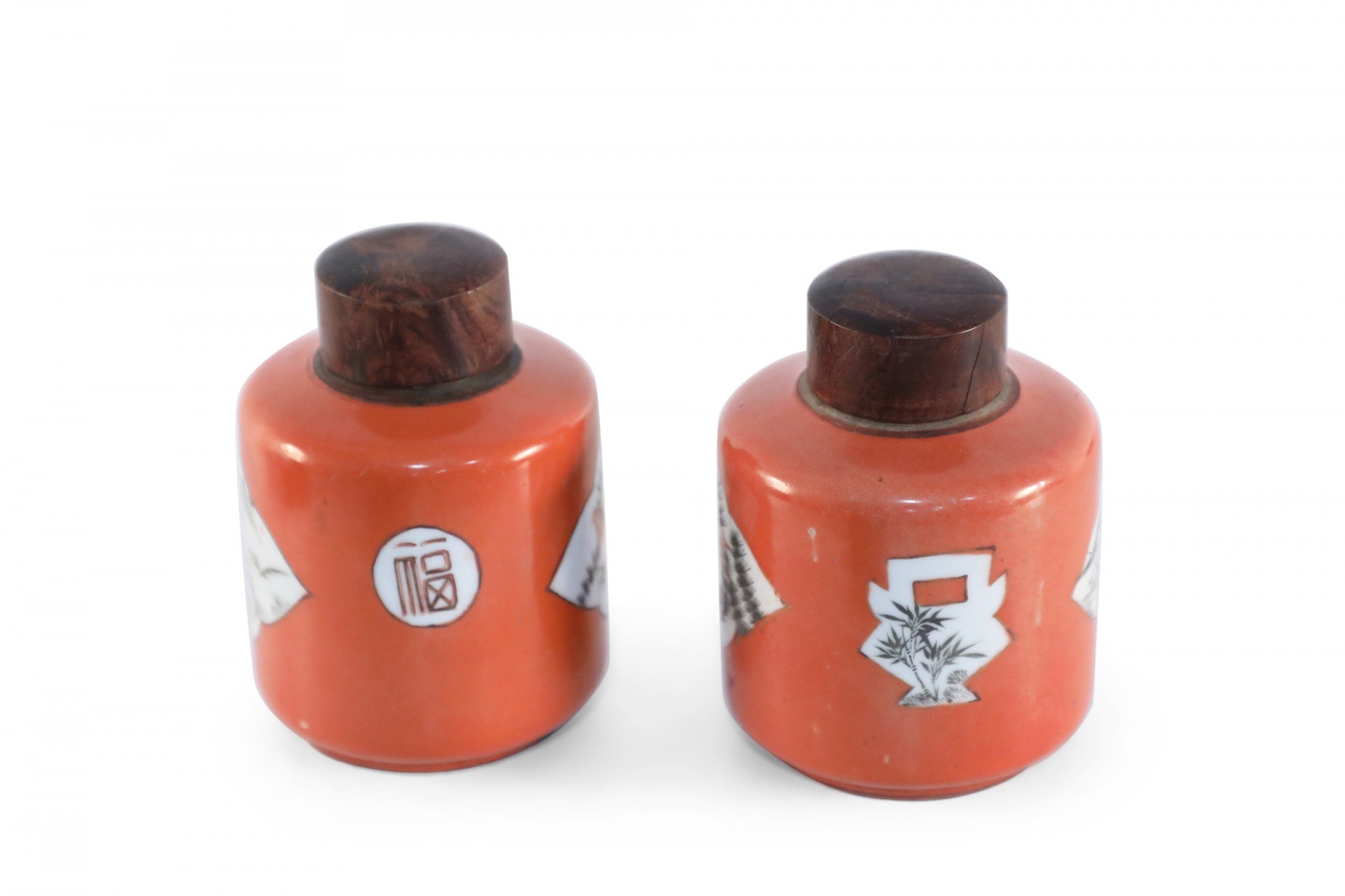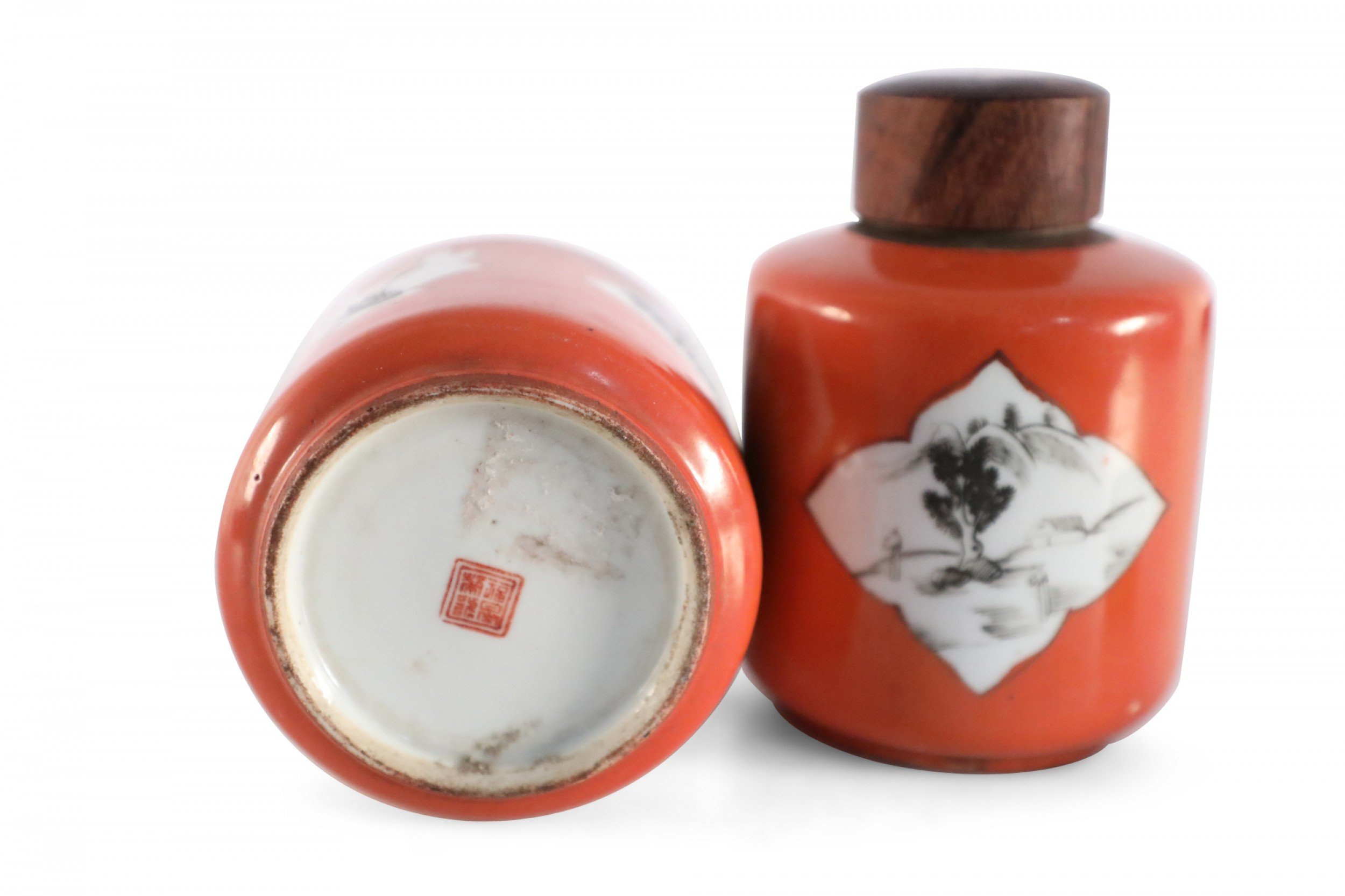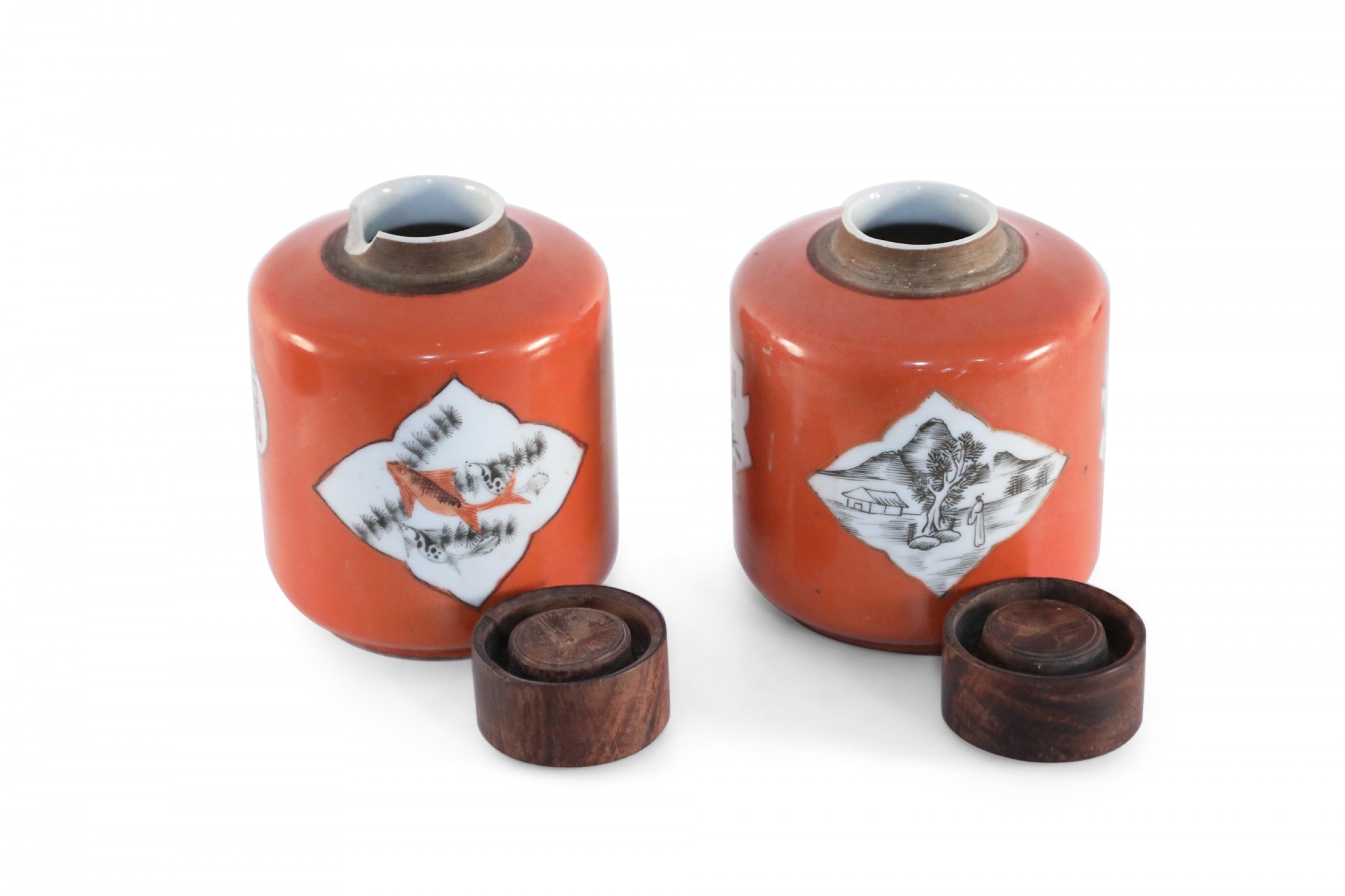 PAIR of Antique Chinese (Early 20th Century) orange porcelain jars depicting white medallions with imagery of fish, seaweed and pastoral scenes and topped with wooden lids (date mark on bottom, see photos) (PRICED AS PAIR)..