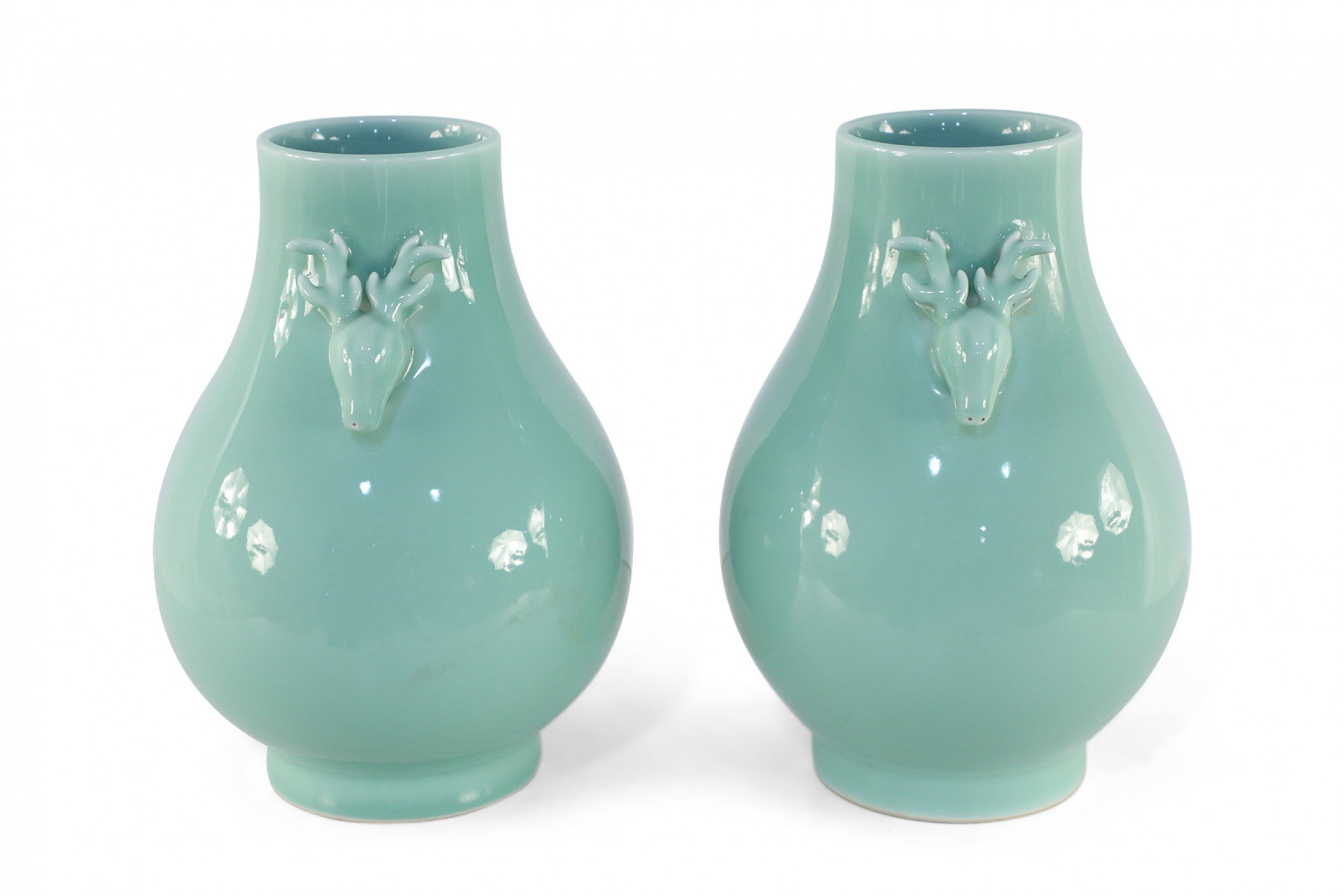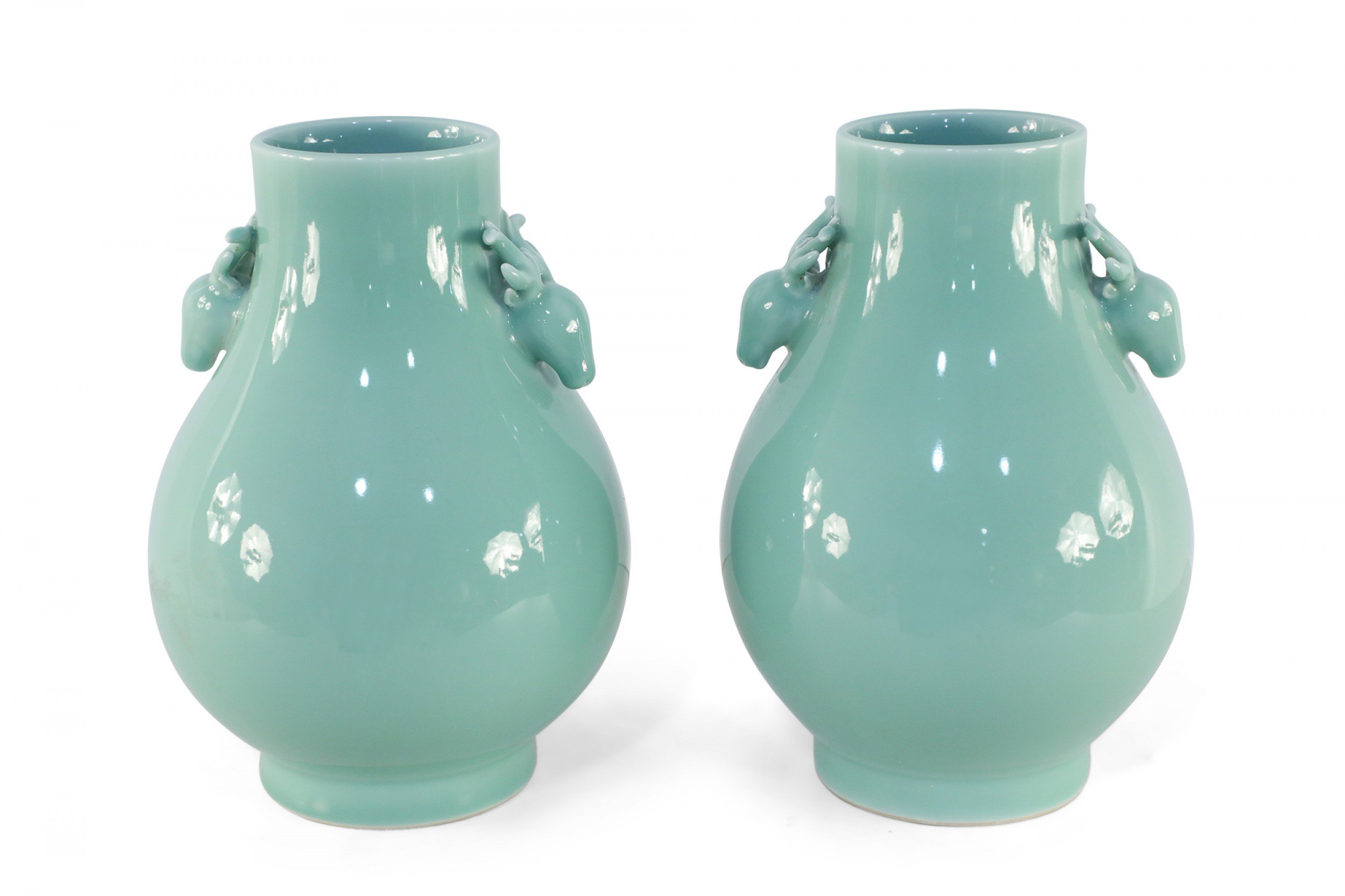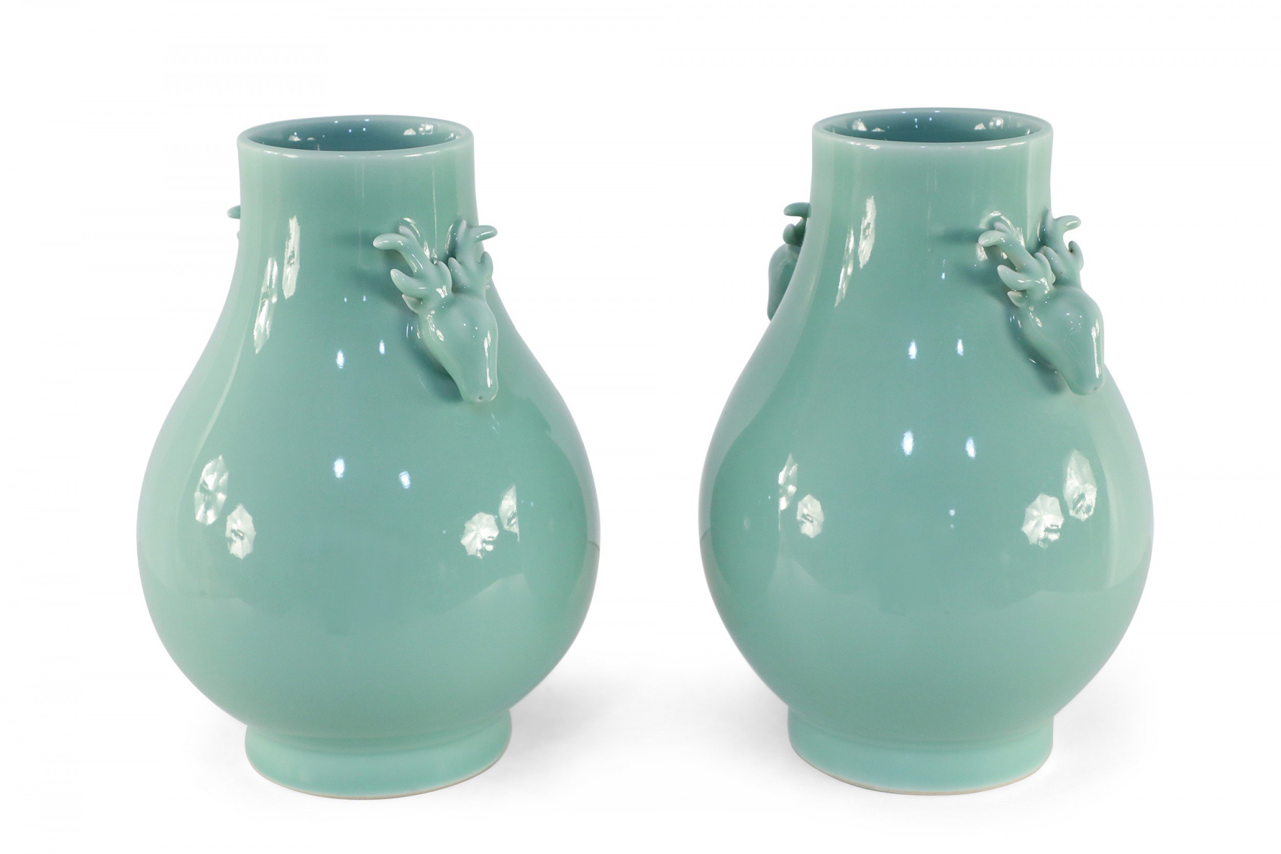 PAIR of Chinese Qing Dynasty Qianlong Period-style (early 20th Century) pear-shaped porcelain vases in celadon with antlered animal ornamentation on each side (mark on bottom) (PRICED AS PAIR).
