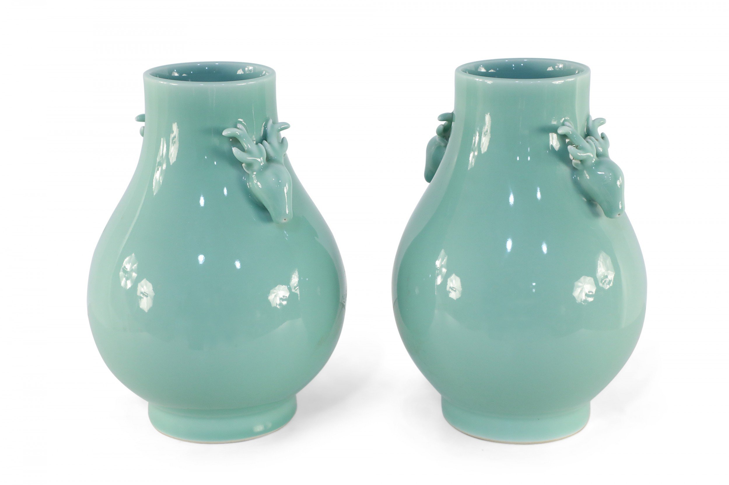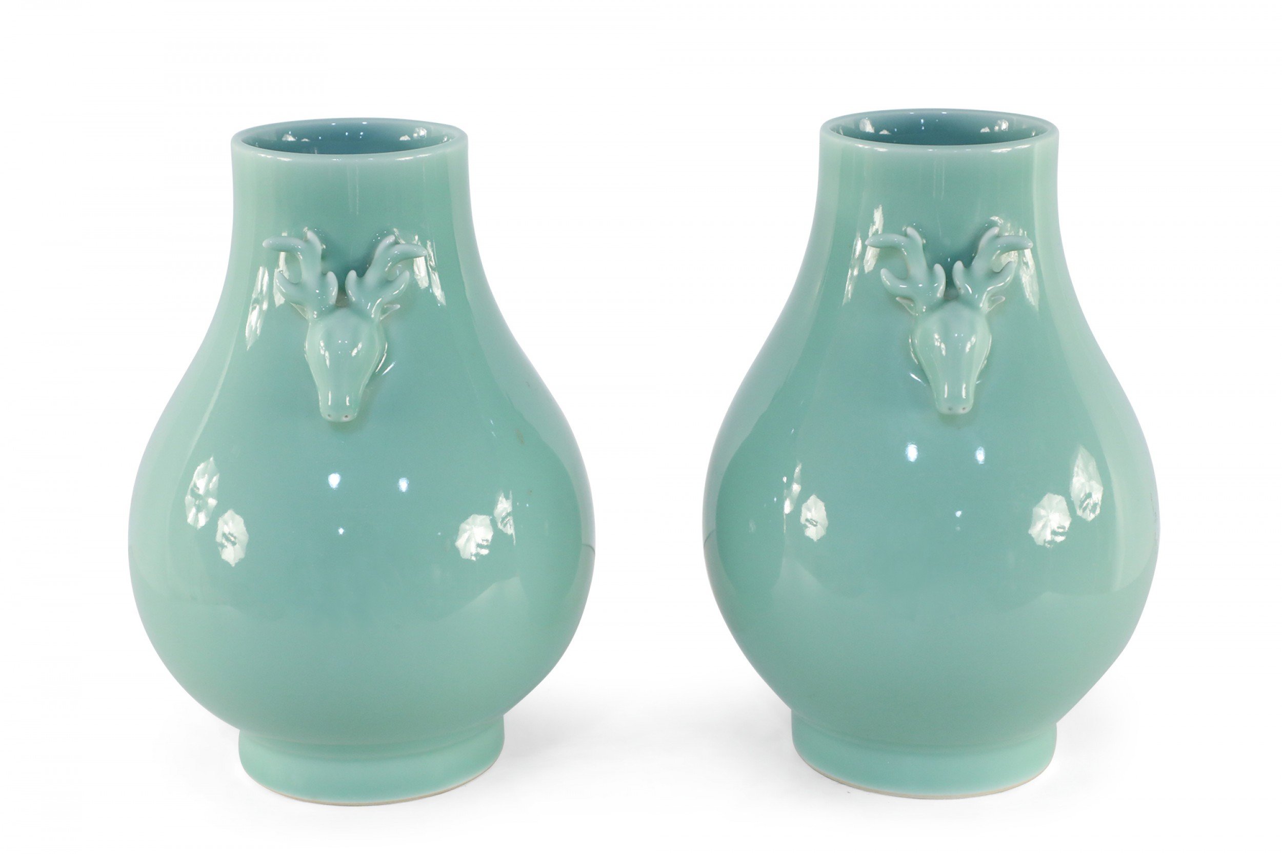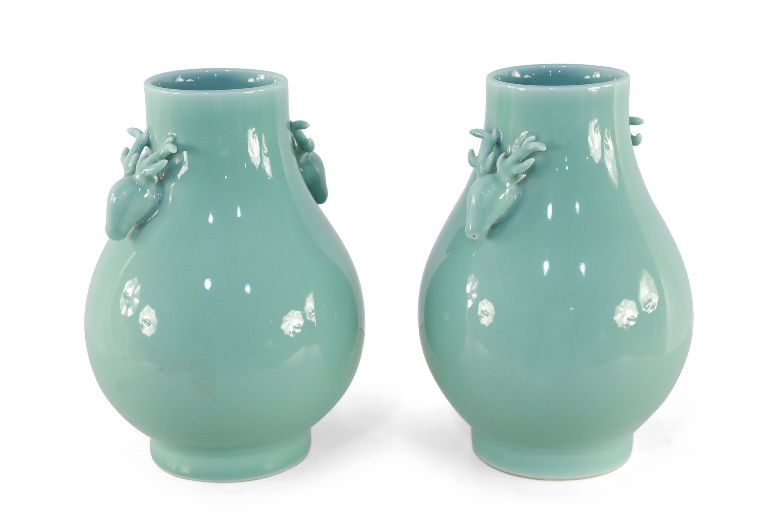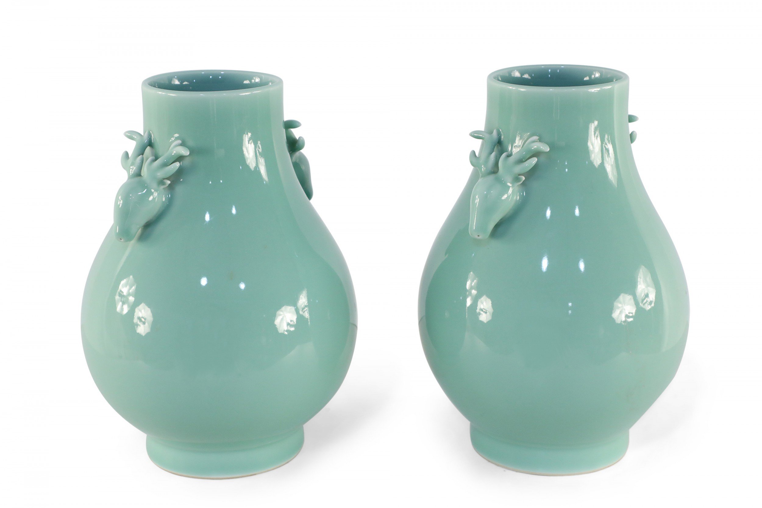 PAIR of Chinese Qing Dynasty Qianlong Period-style (early 20th Century) pear-shaped porcelain vases in celadon with antlered animal ornamentation on each side (mark on bottom) (PRICED AS PAIR).