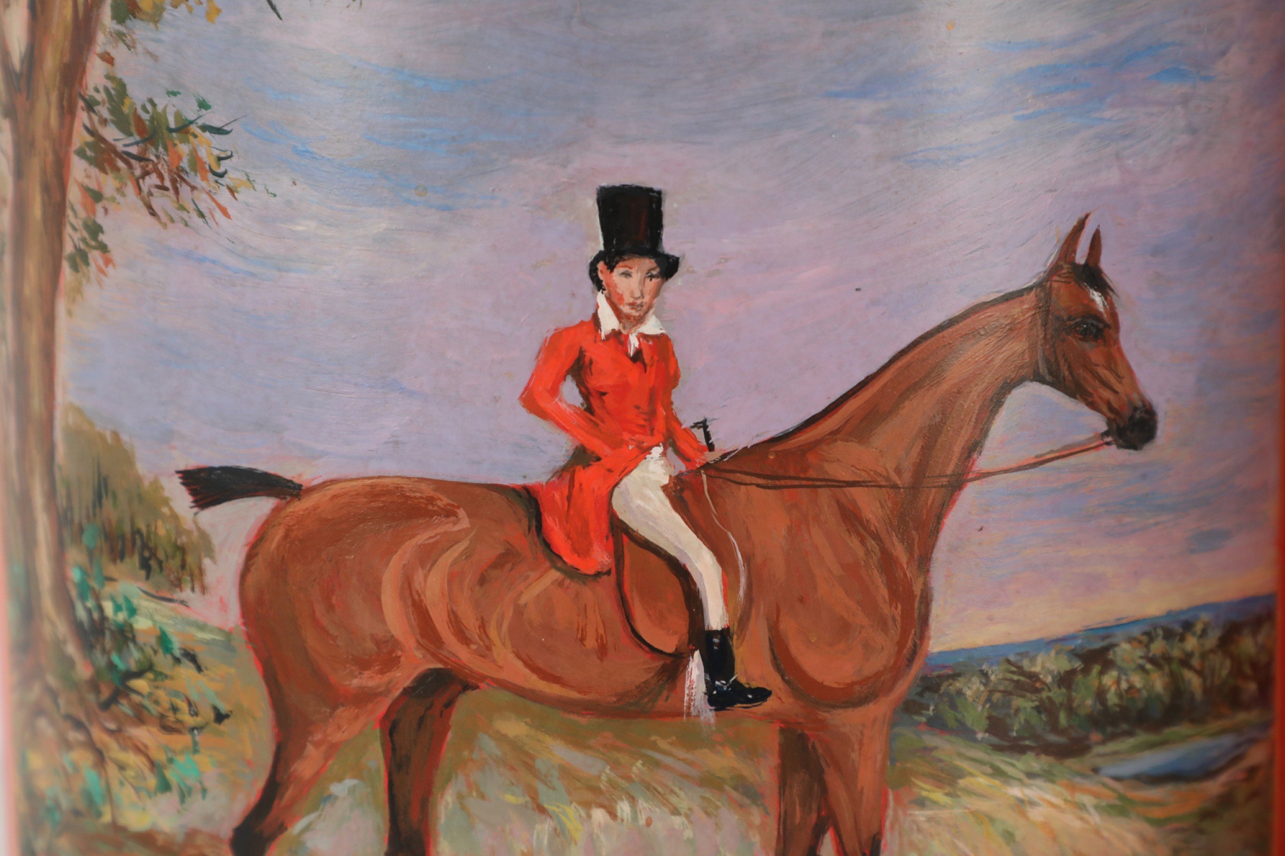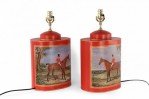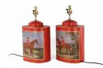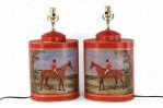 Pair of Chinese Red Tole Equestrian Scene Table Lamps