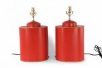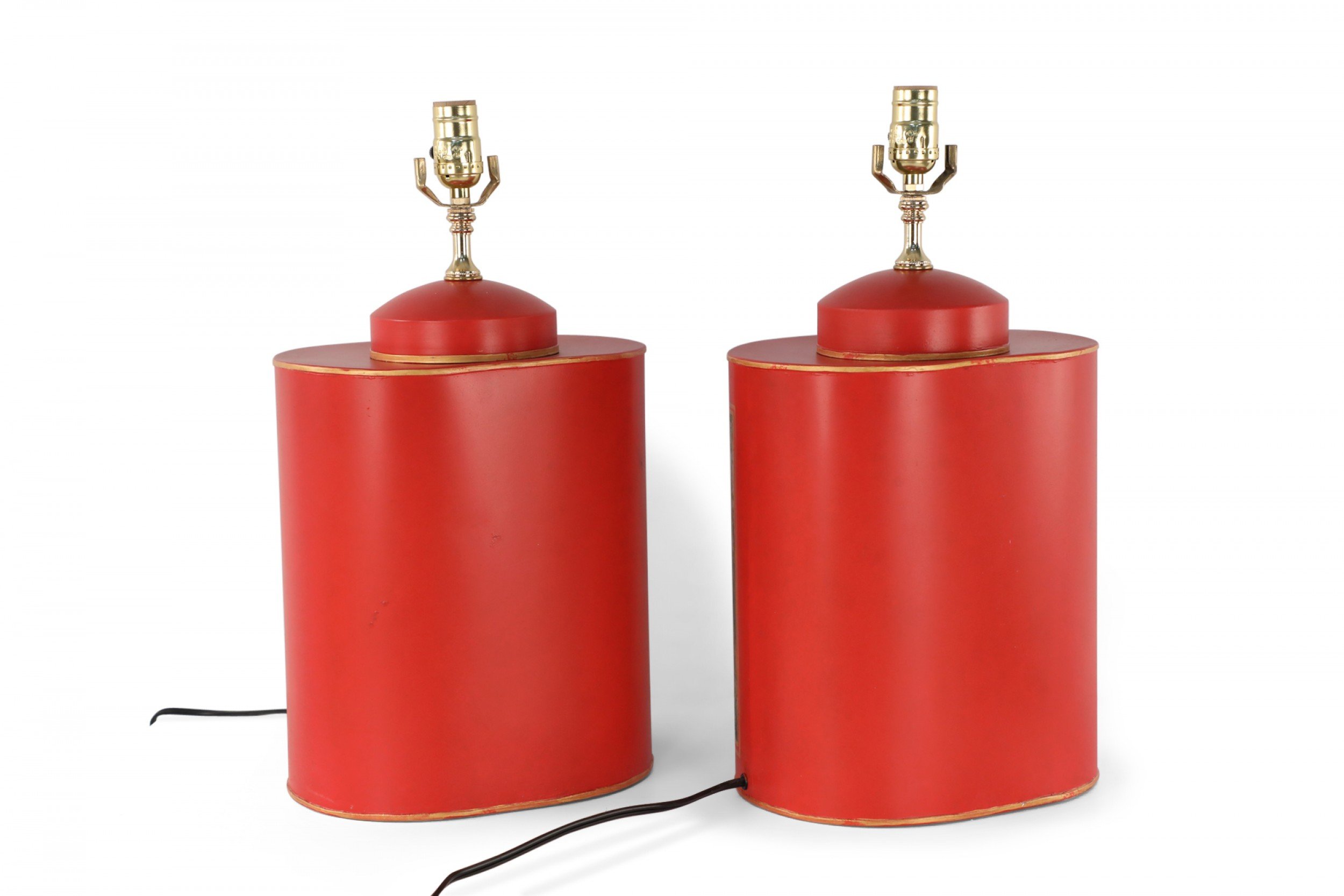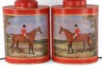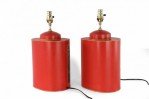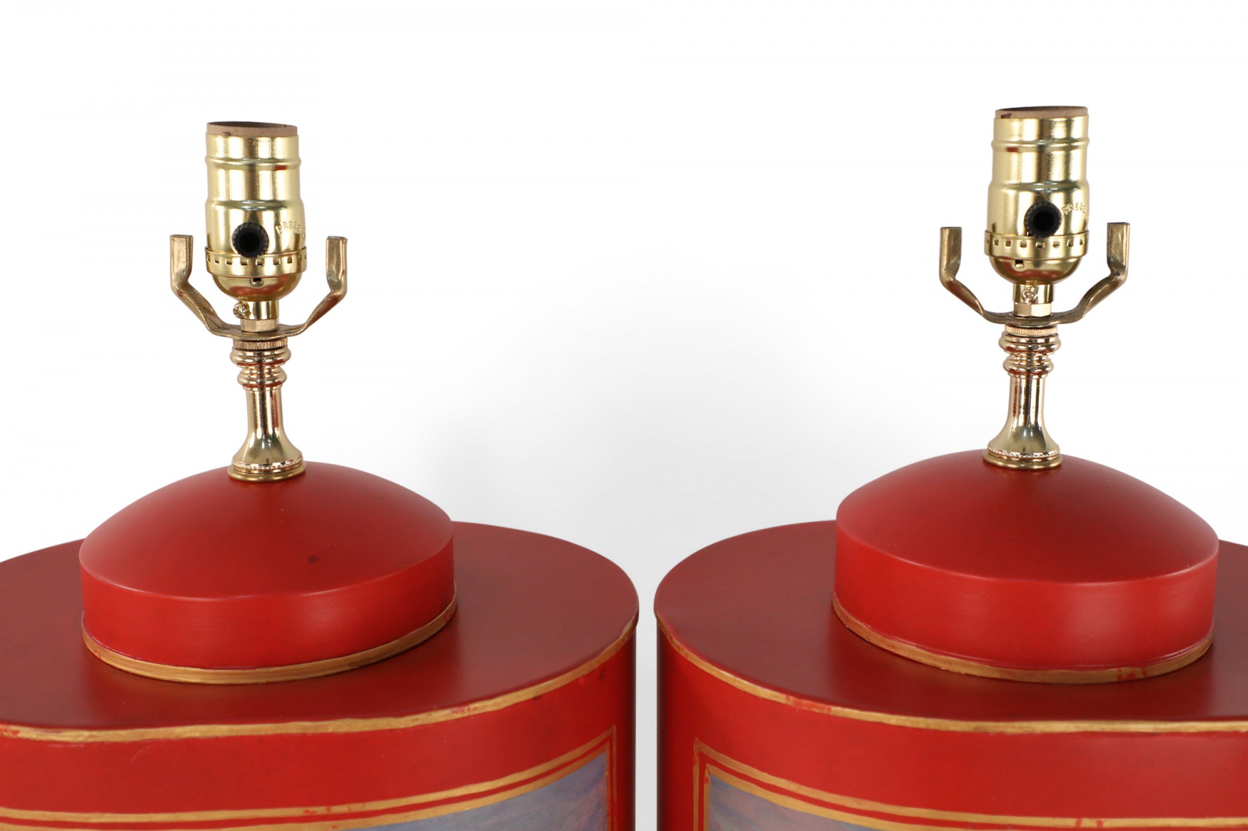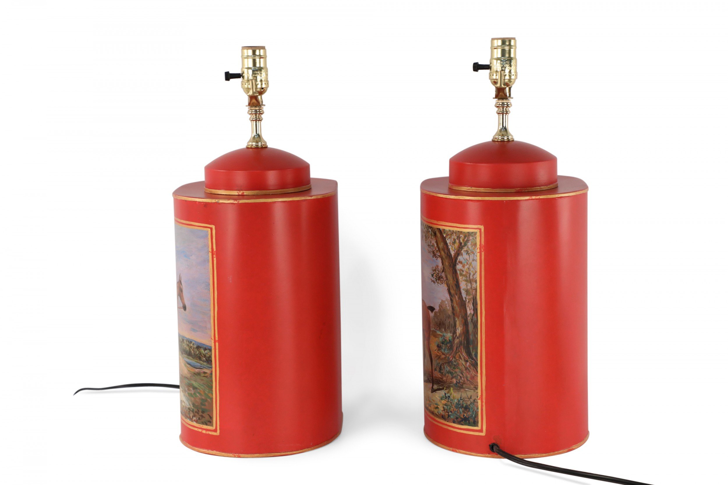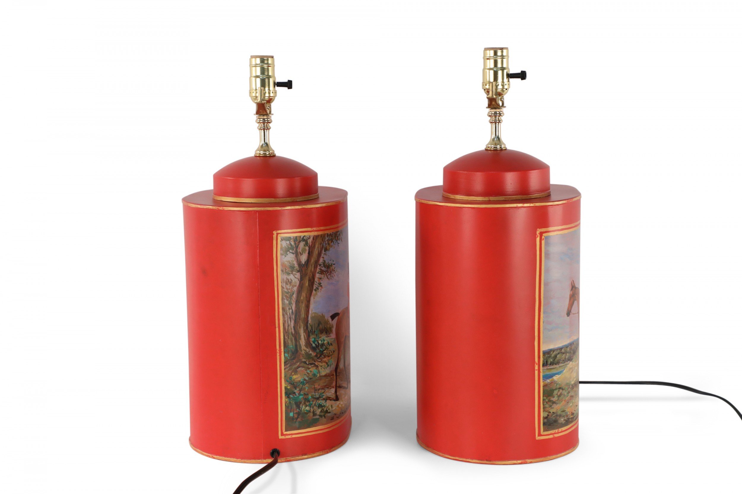 PAIR of Chinese red and gold tole table lamps with canister-shaped bodies and brass hardware featuring an equestrian scene typical of 19th century European paintings (PRICED AS PAIR).