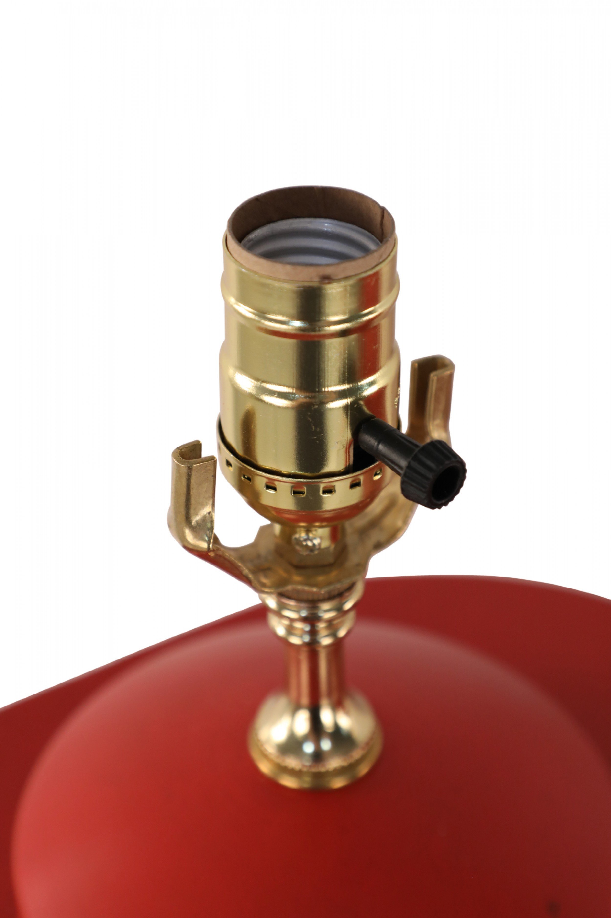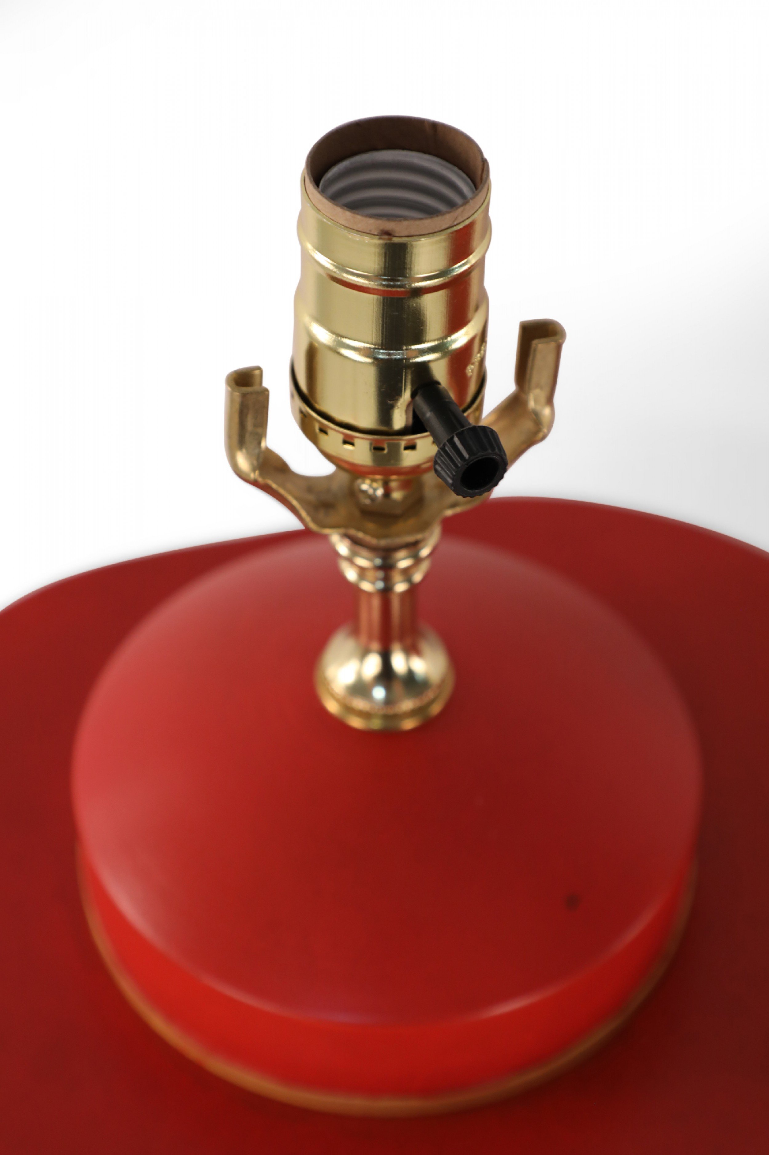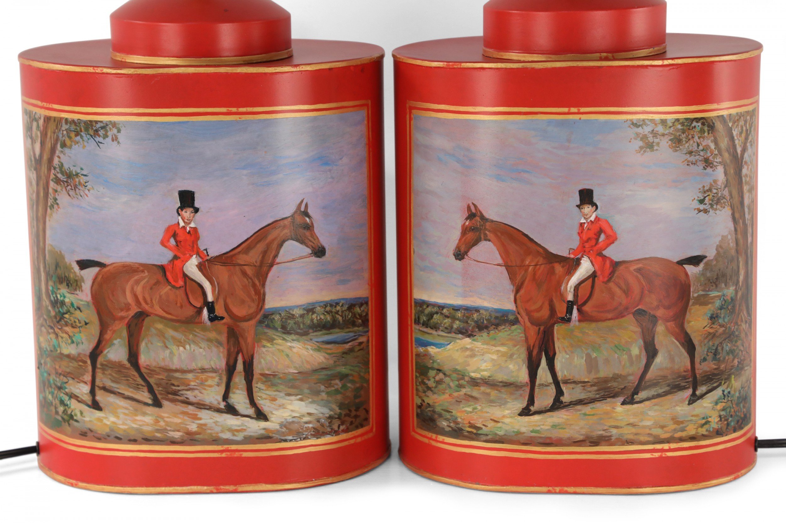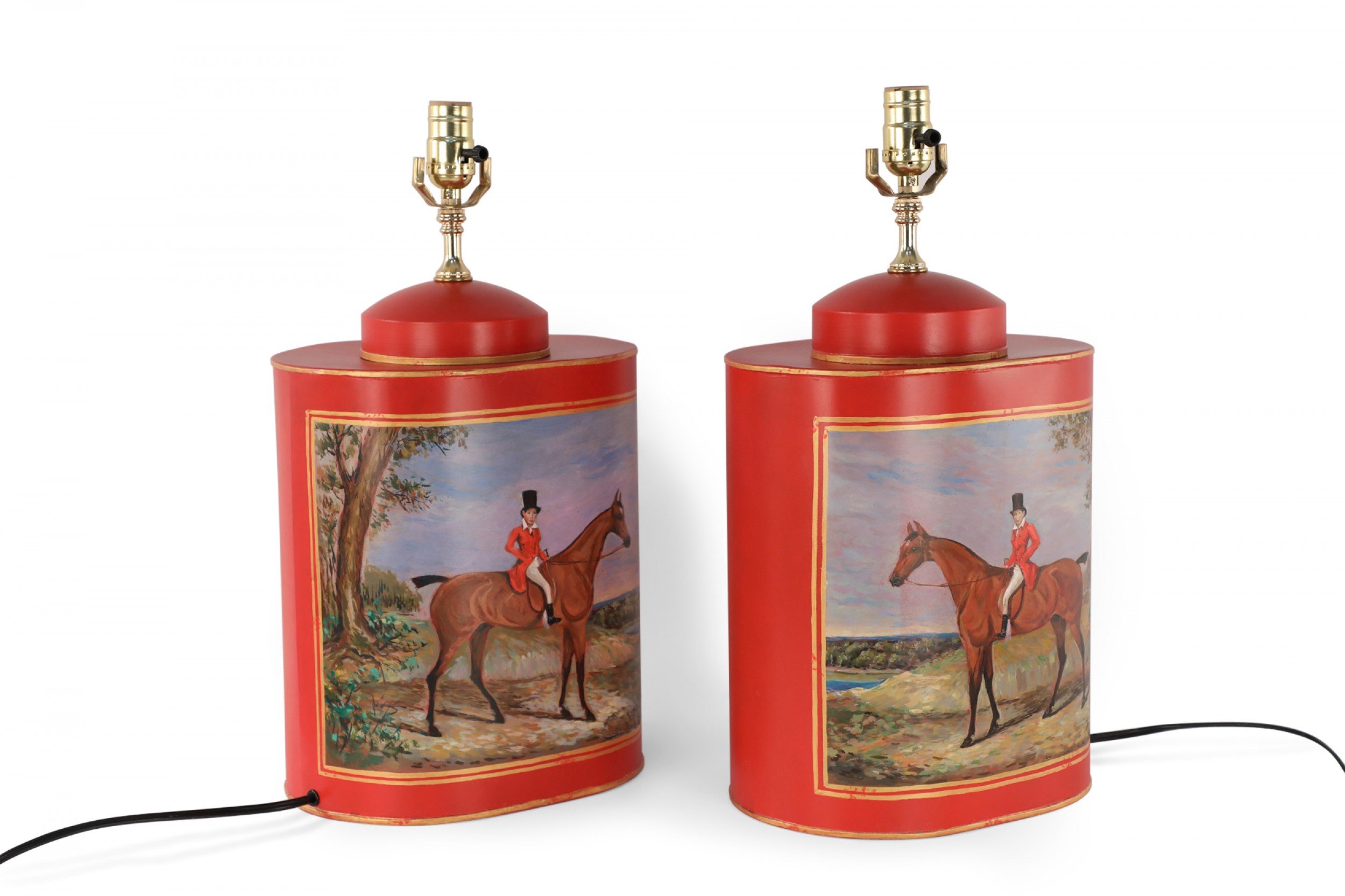 PAIR of Chinese red and gold tole table lamps with canister-shaped bodies and brass hardware featuring an equestrian scene typical of 19th century European paintings (PRICED AS PAIR)..