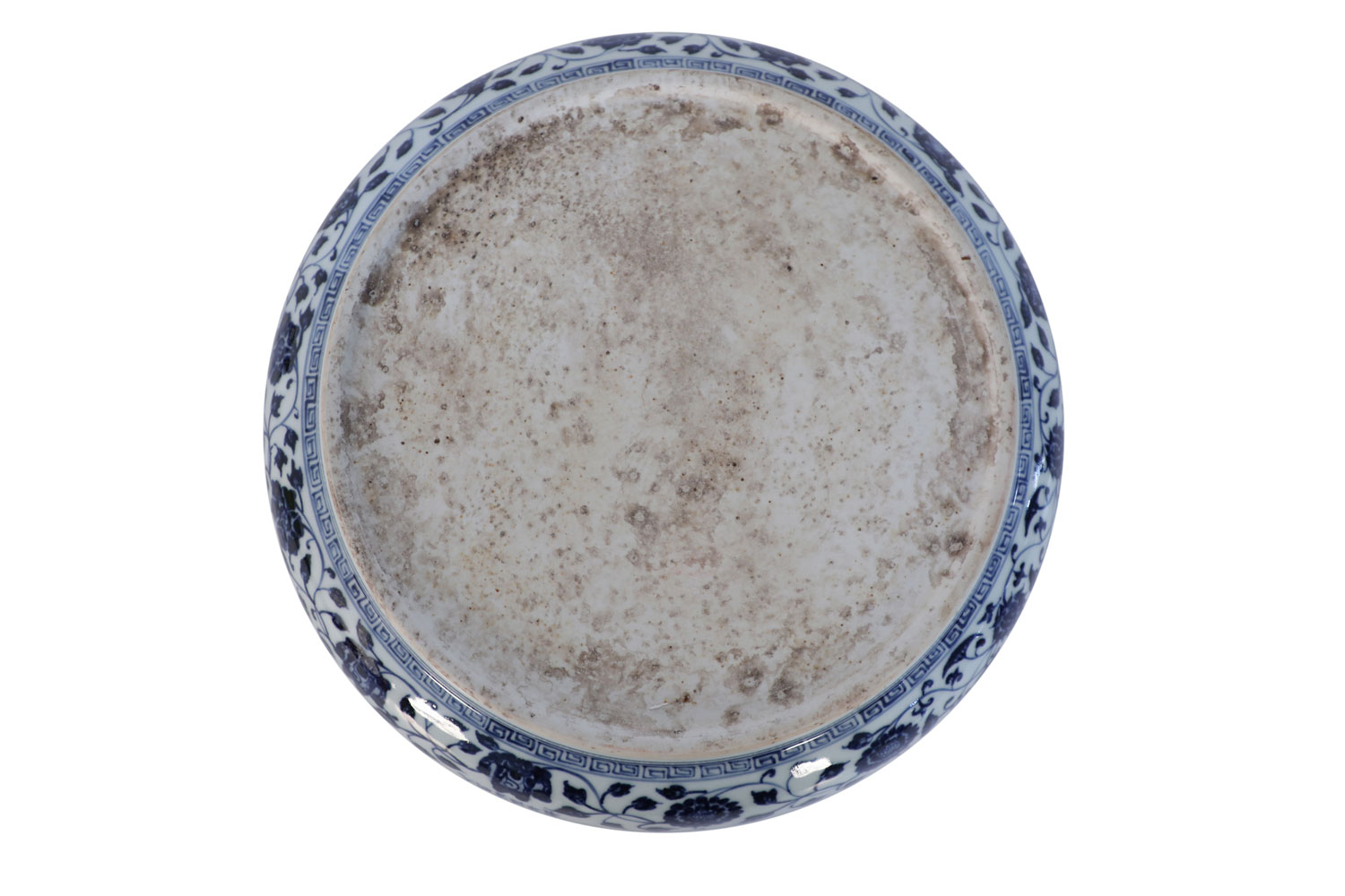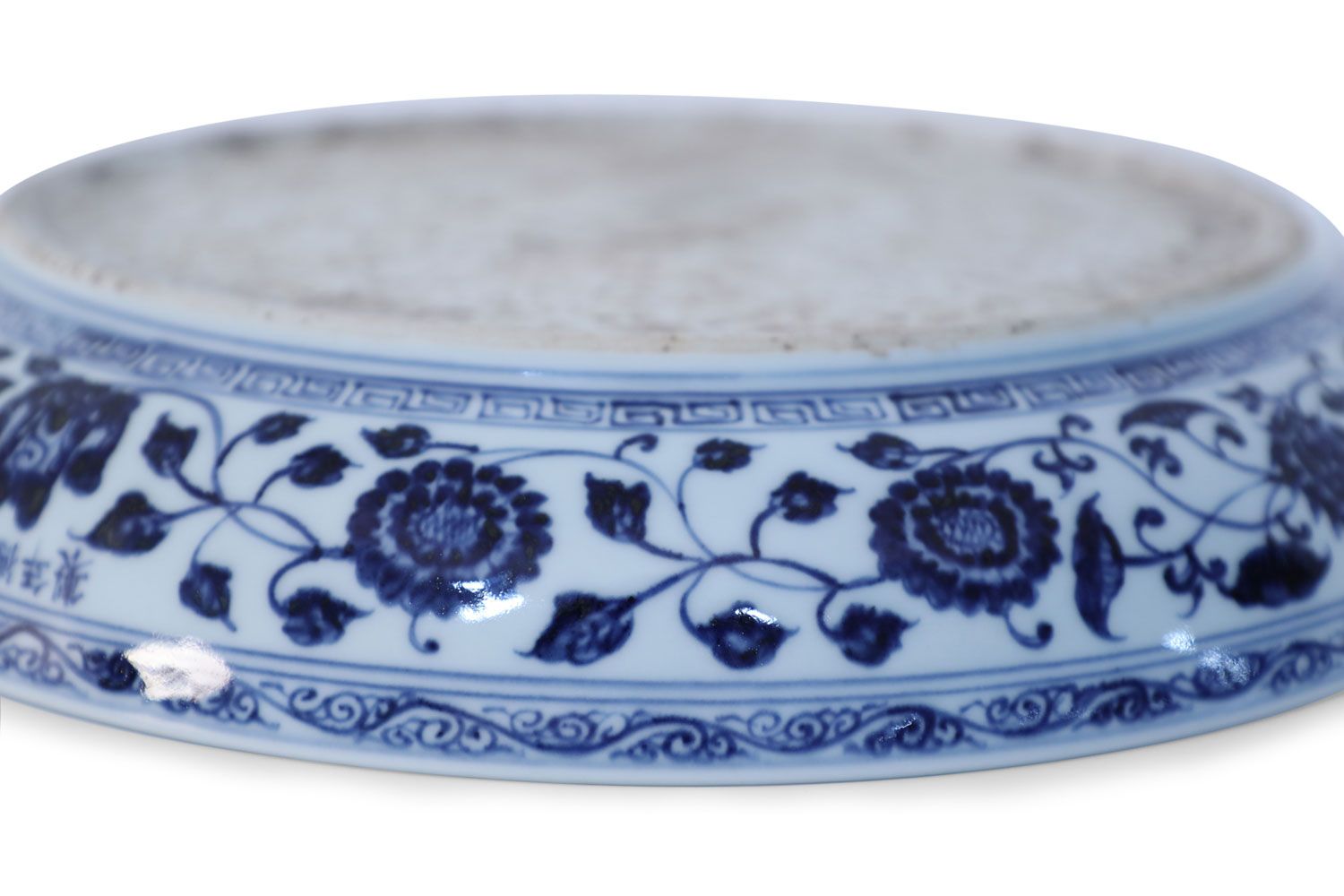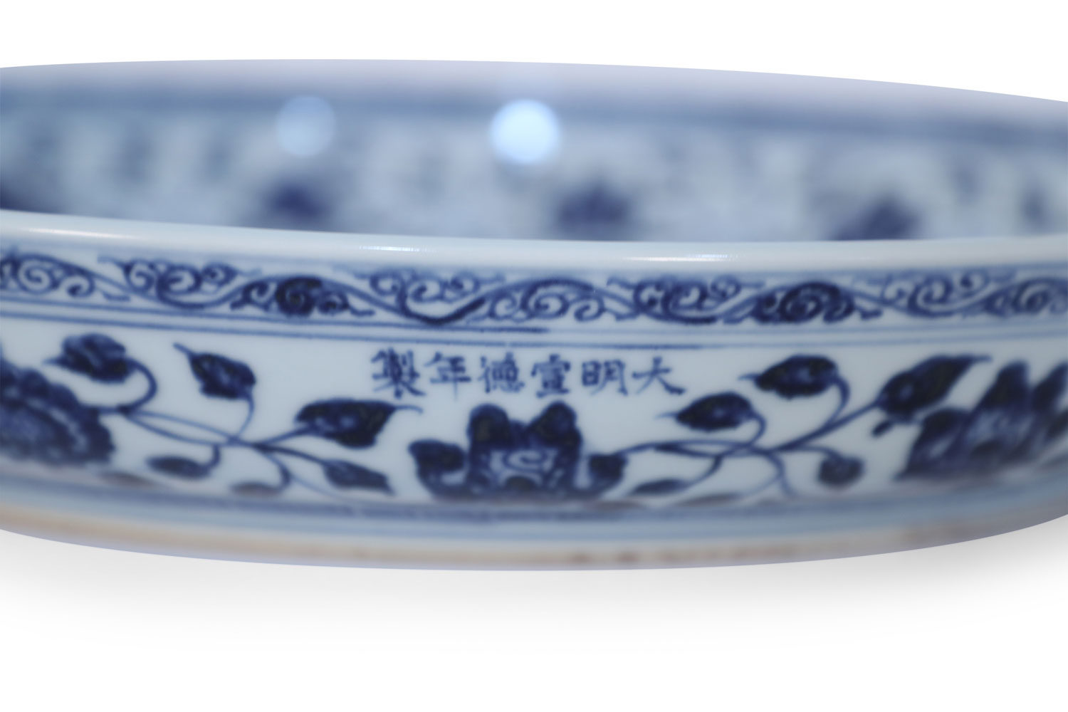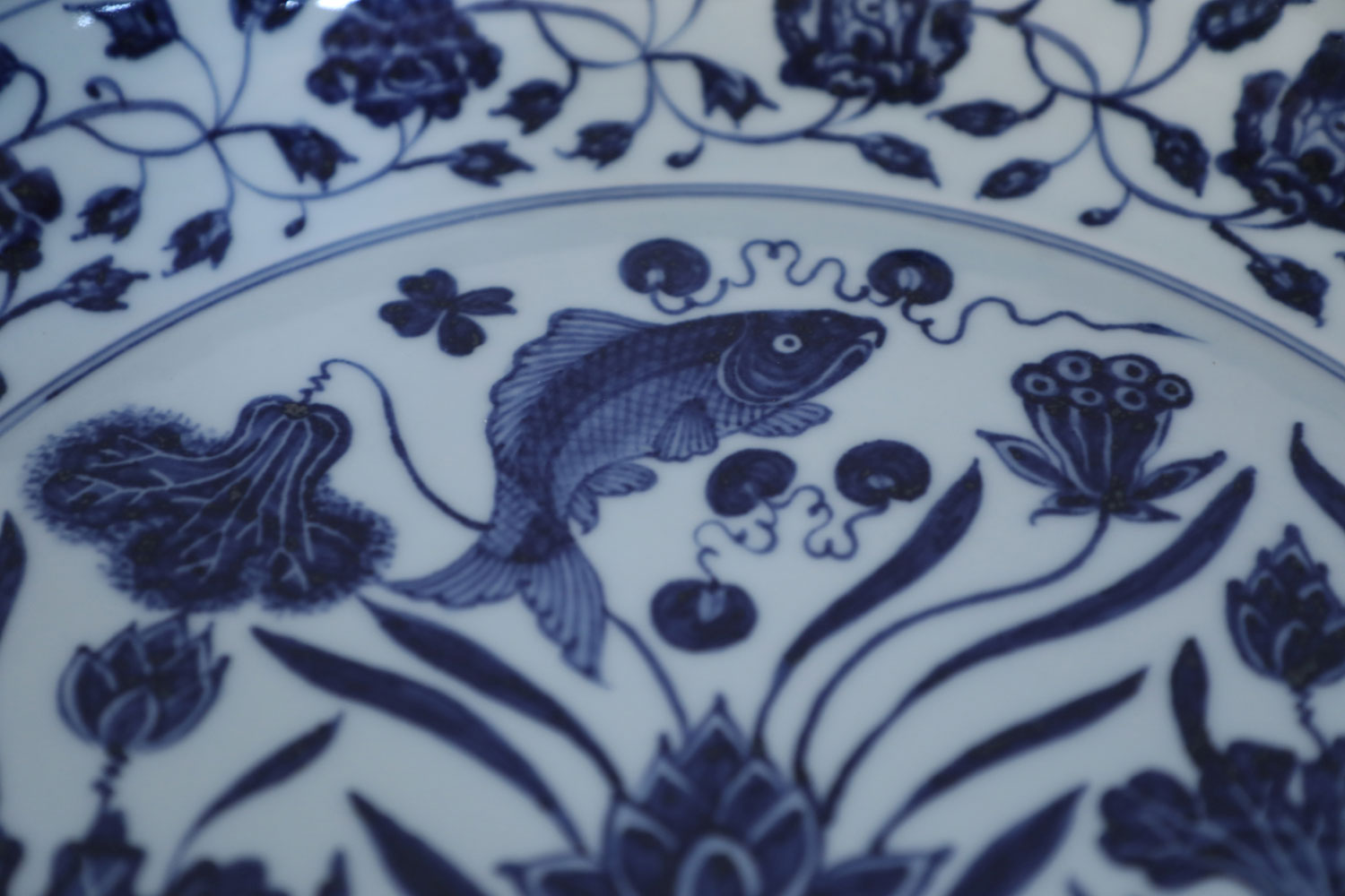 PAIR of Chinese blue and white porcelain decorative plates painted with thin blue patterned bands along the rims, opening to wider floral motifs on the interiors that surround central underwater vignettes of fish, vegetation and seaweed (PRICED AS PAIR)..