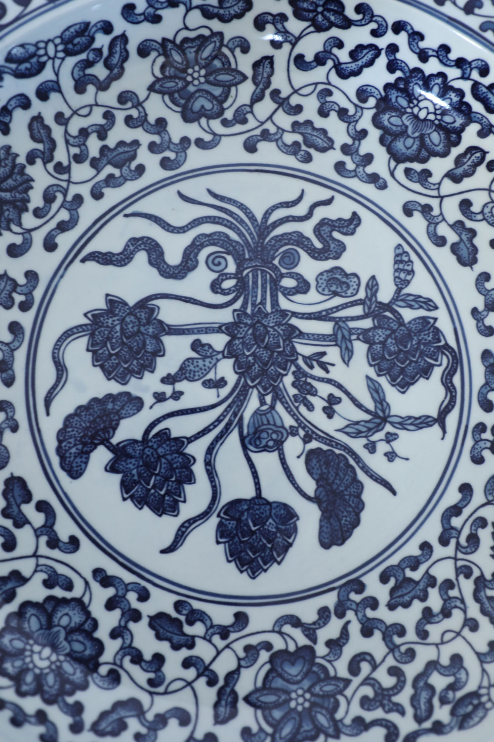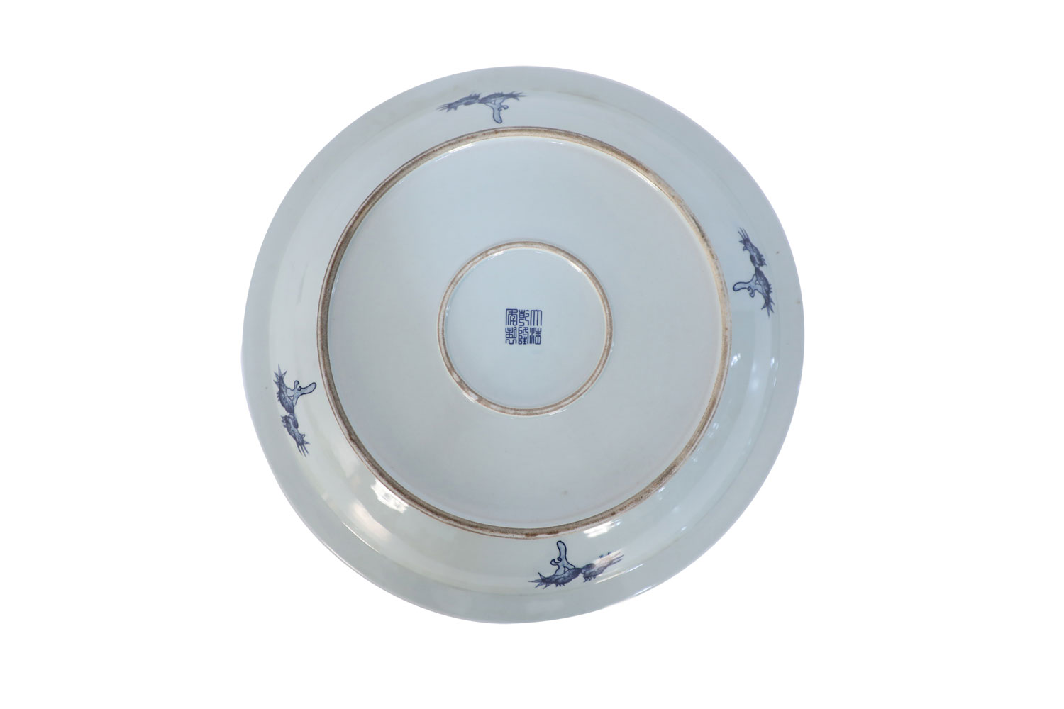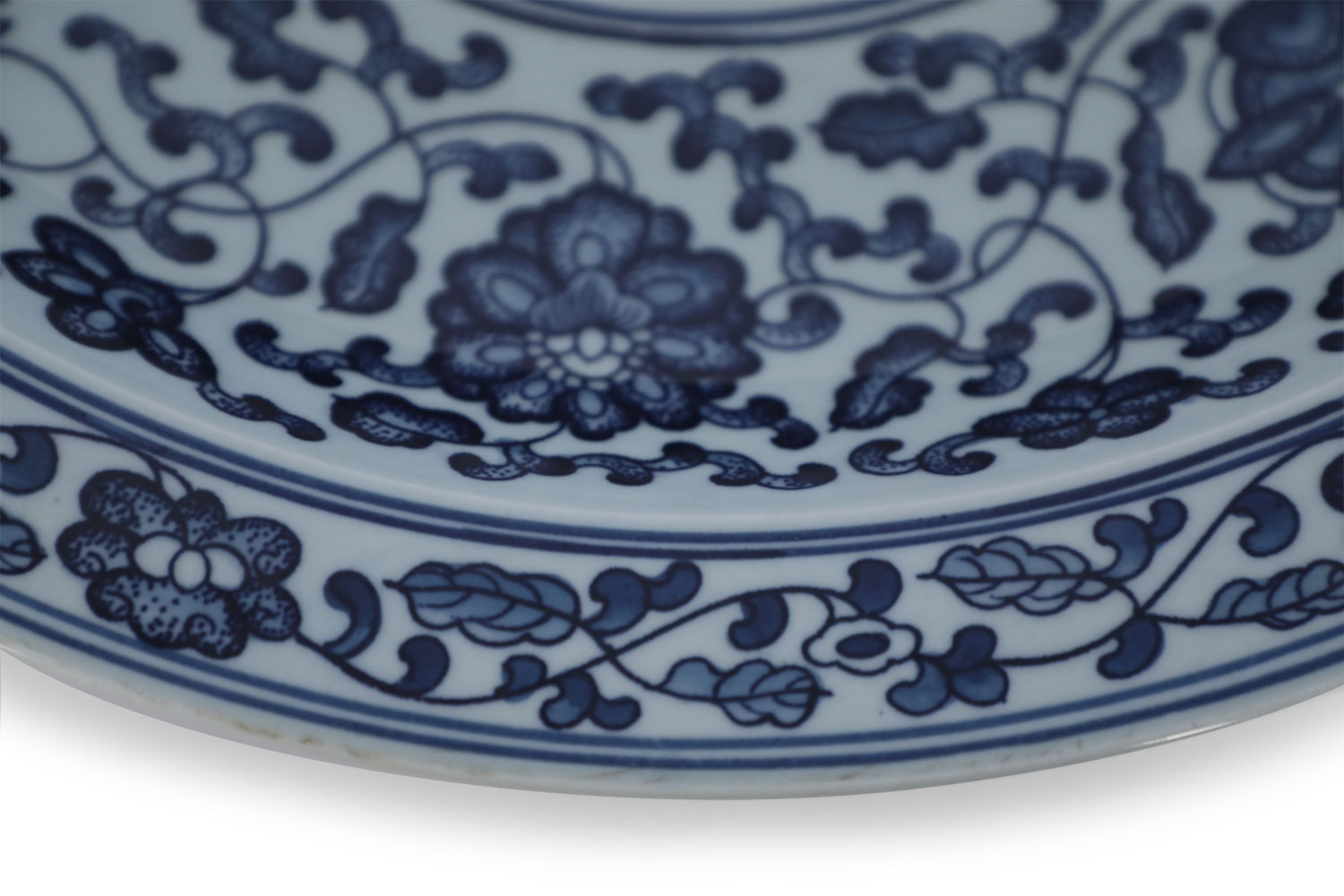PAIR of Chinese blue and white porcelain decorative plate painted with thin blue double lines surrounding a floral garland along the rim, opening to a wider floral and swirling vine motif on the interior that surrounds a central floral bouquet, and featuring four spaced flowers on the underside of the plate (mark on bottom, see photos).