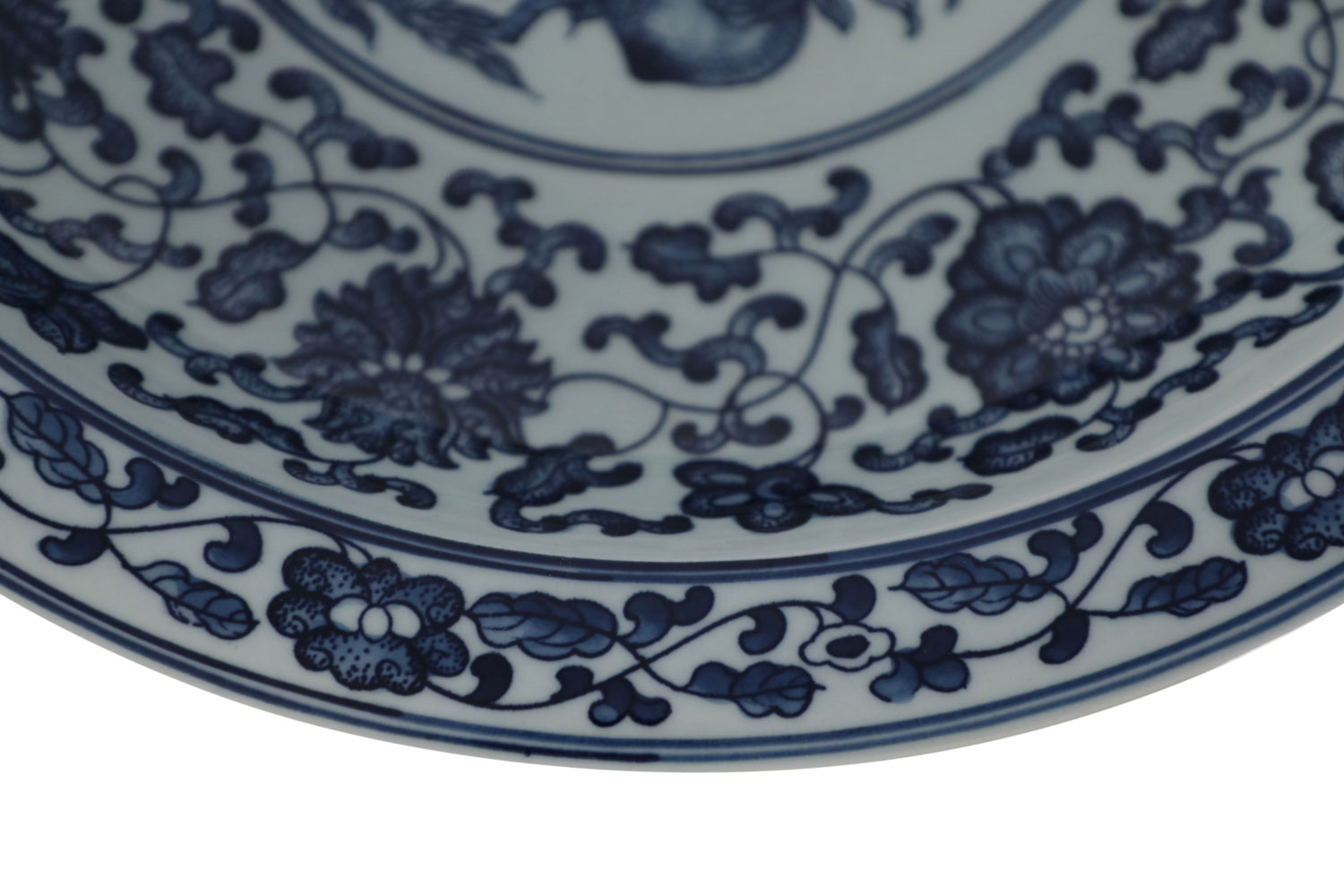 PAIR of Chinese blue and white porcelain decorative plates painted with thin blue double lines surrounding floral garlands along the rims, opening to wider florals and swirling vine motifs on the interiors that surround central vignettes of peaches on tree limbs, and featuring four spaced flowers on the undersides of the plates (mark on bottom, see photos) (PRICED AS PAIR).