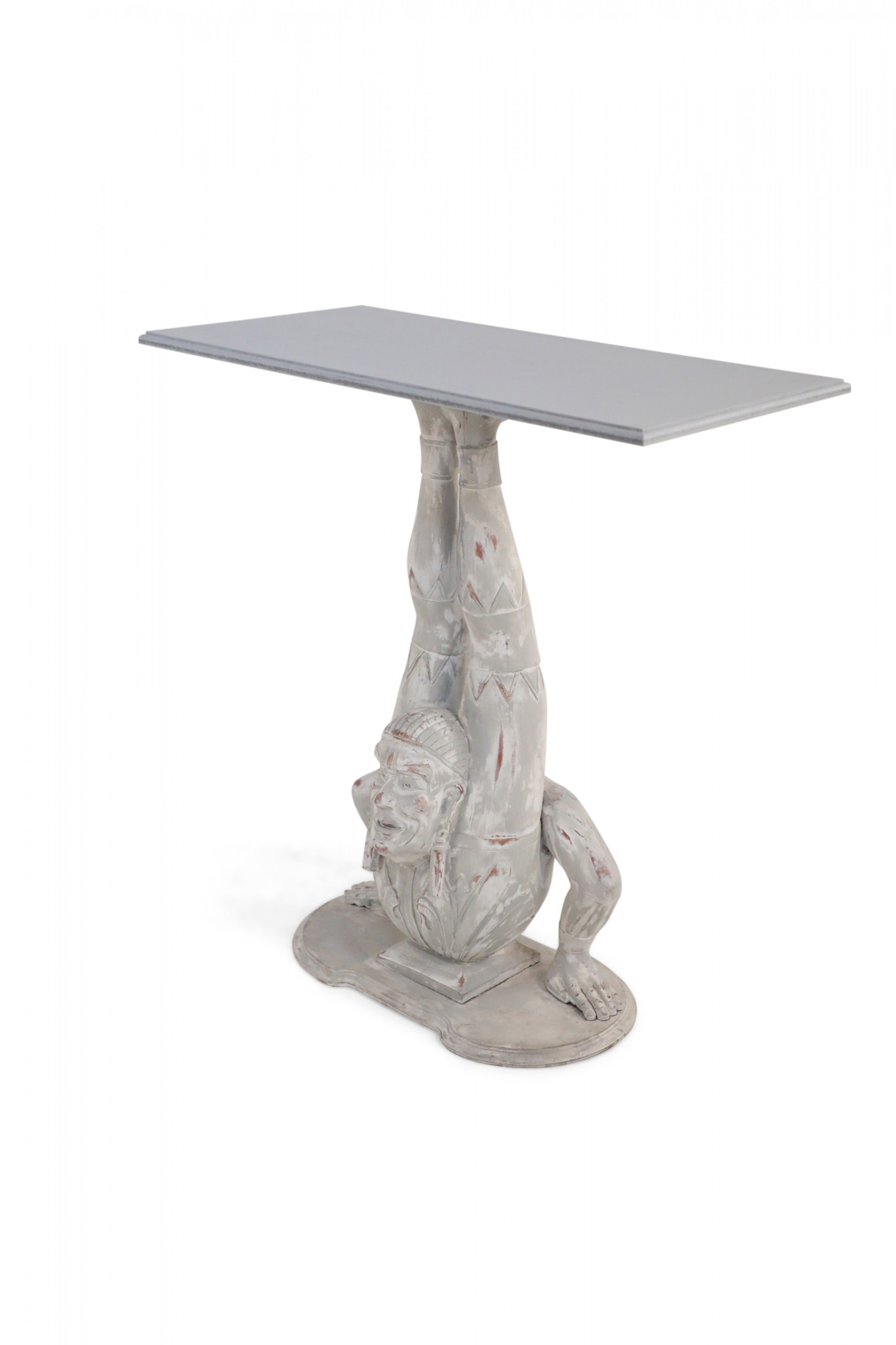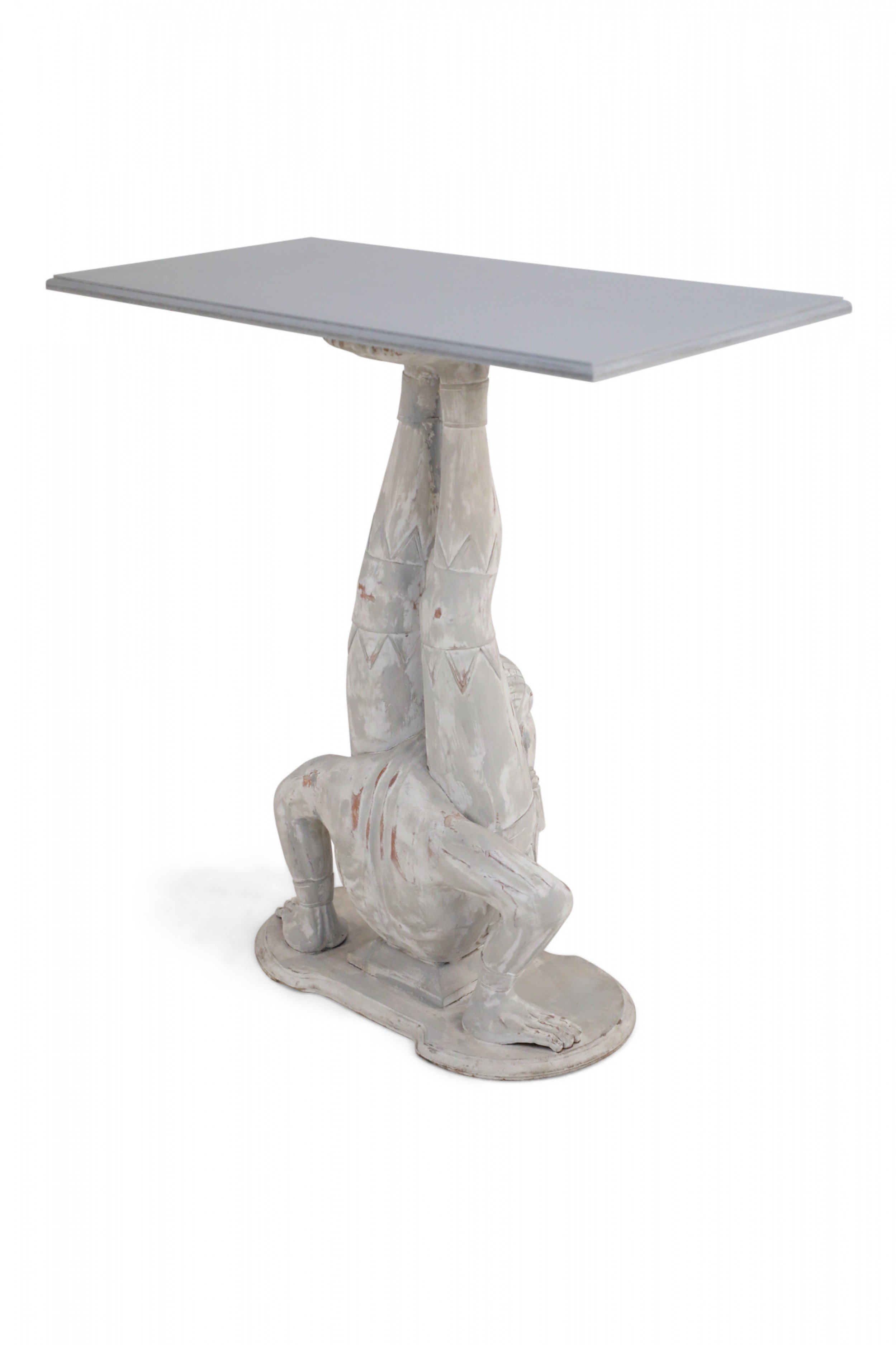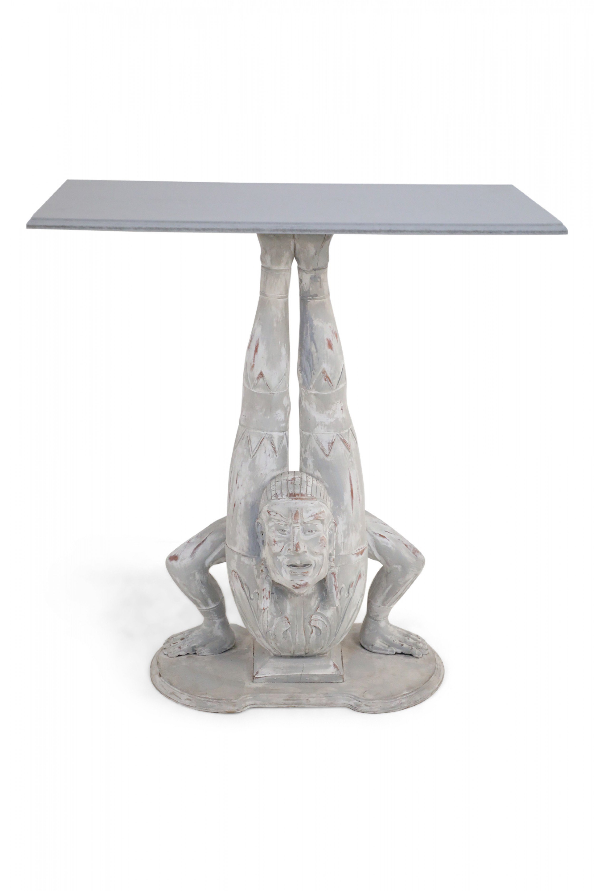 PAIR of Chinese console tables comprised of whitewashed wooden bases carved to resemble acrobatic figures supporting gray, rectangular tops (PRICED AS PAIR).