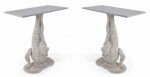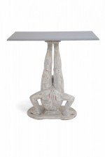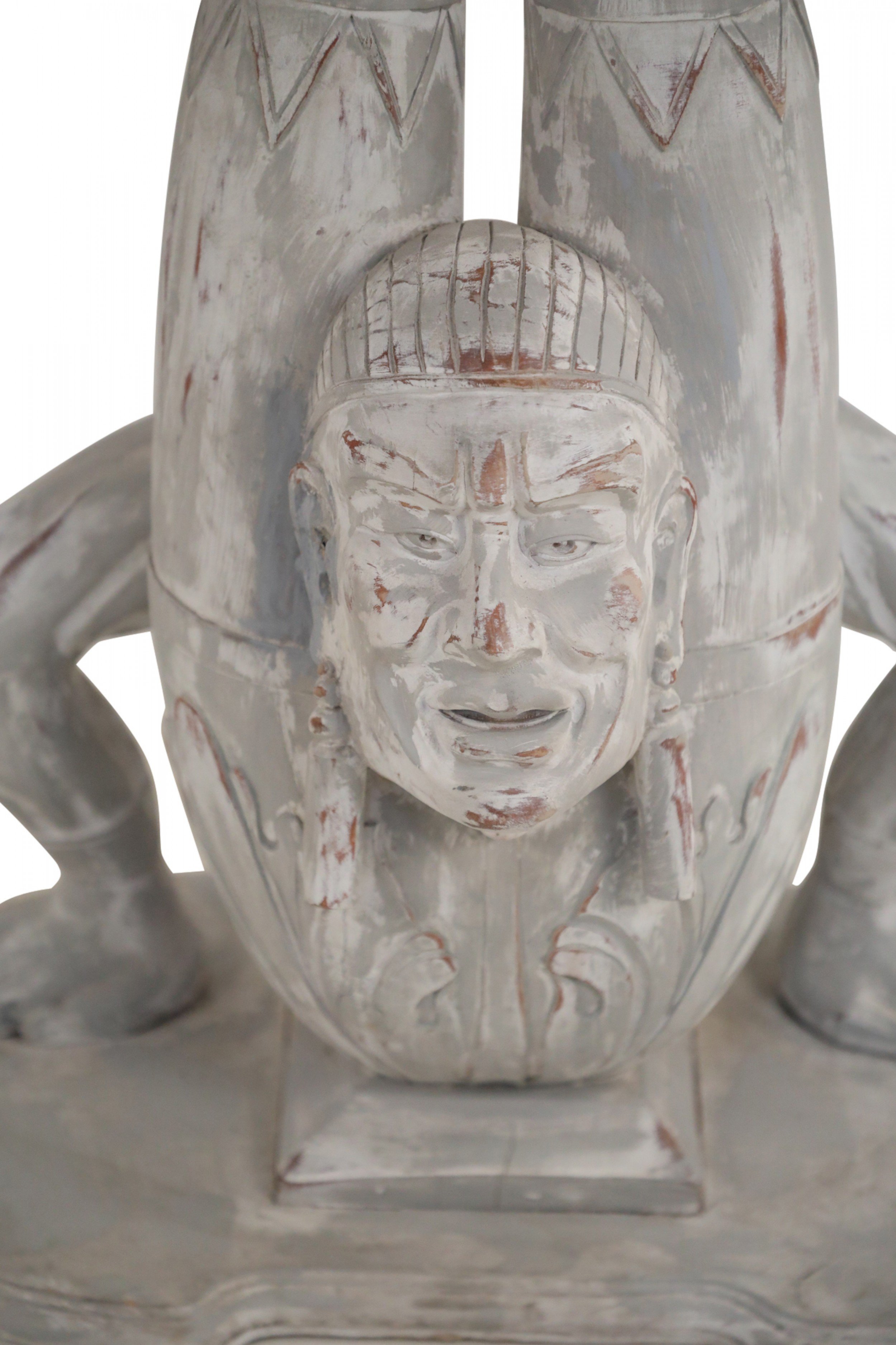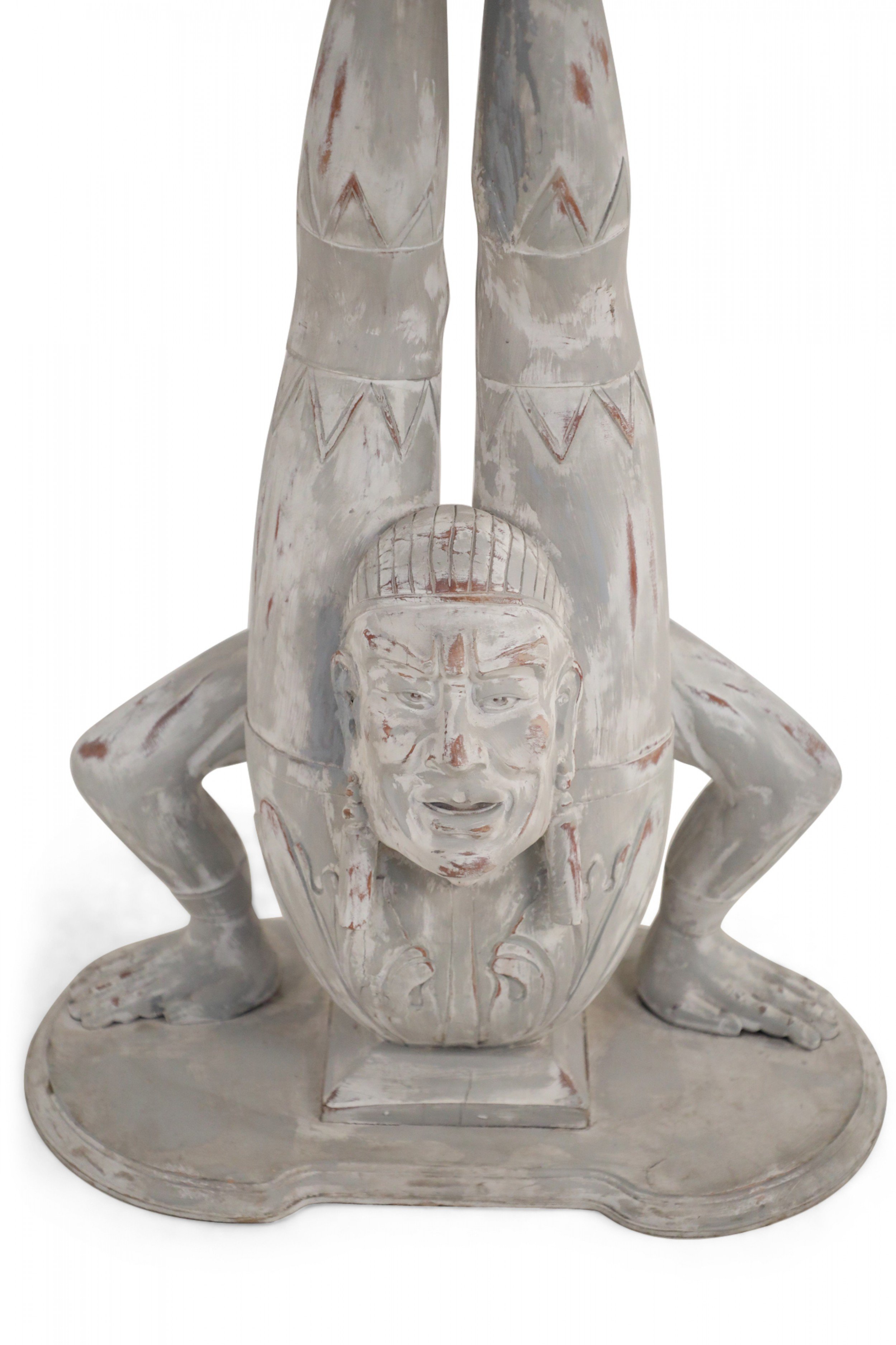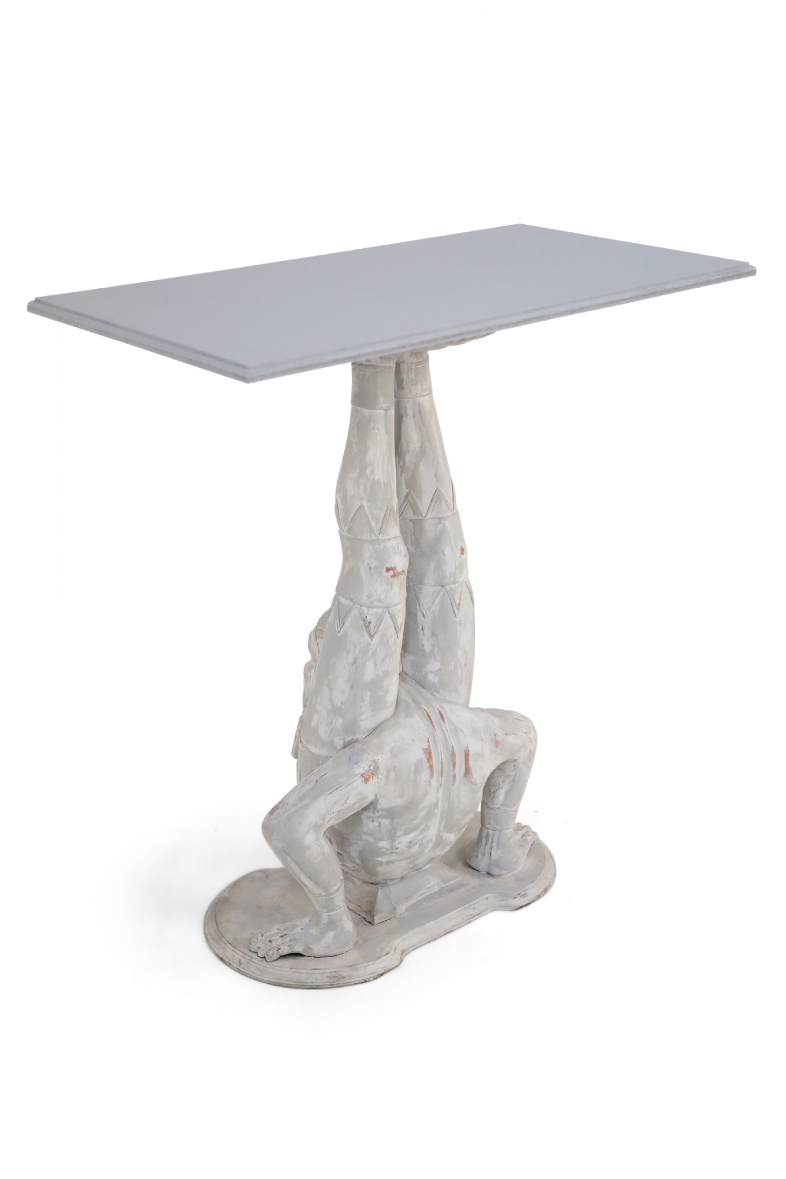 PAIR of Chinese console tables comprised of whitewashed wooden bases carved to resemble acrobatic figures supporting gray, rectangular tops (PRICED AS PAIR).