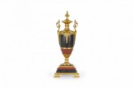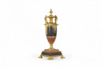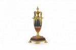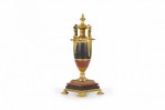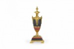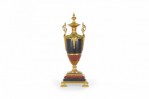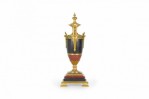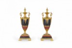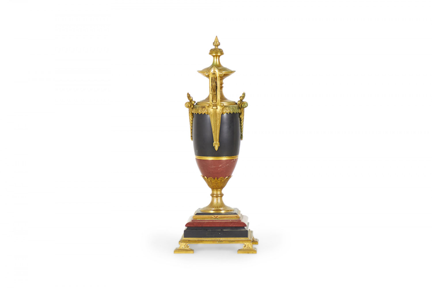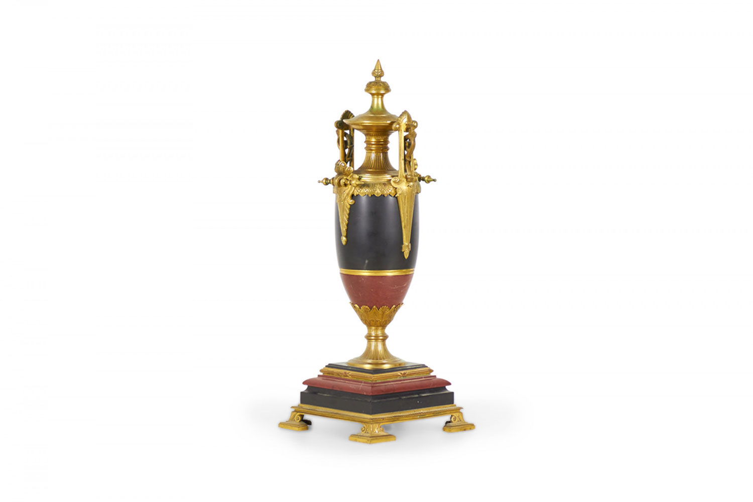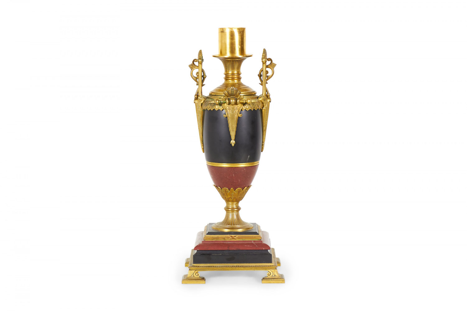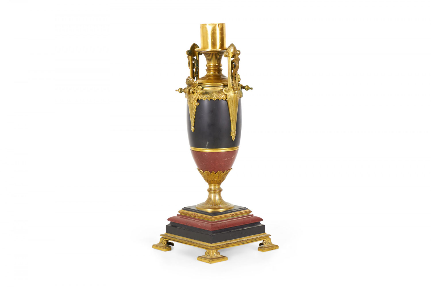 PAIR of French Empire Revival (mid-19th Century) urns / candleholders with rouge and black marble bodies, gilt bronze ornamentation and a removable top piece that flips to reveal a candleholder, resting on tiered base and gilt bronze feet. (PRICED AS PAIR)