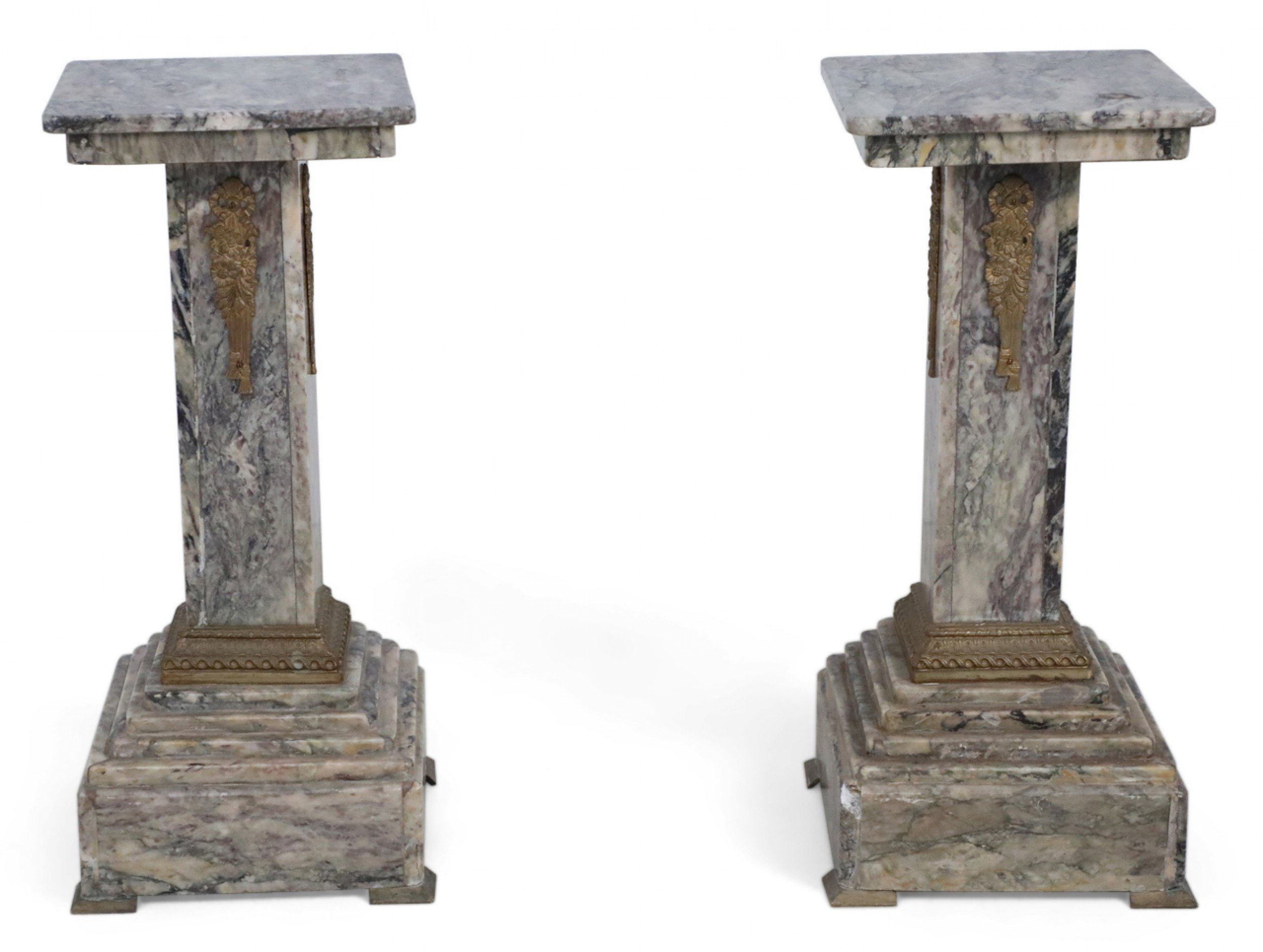 PAIR of French Louis XVI-style (19th Century) gray marble pedestals with square tops and bases, bronze bow-knot and tassel embellishments on the sides, and a decorative bronze band around the bases (PRICED AS PAIR)..