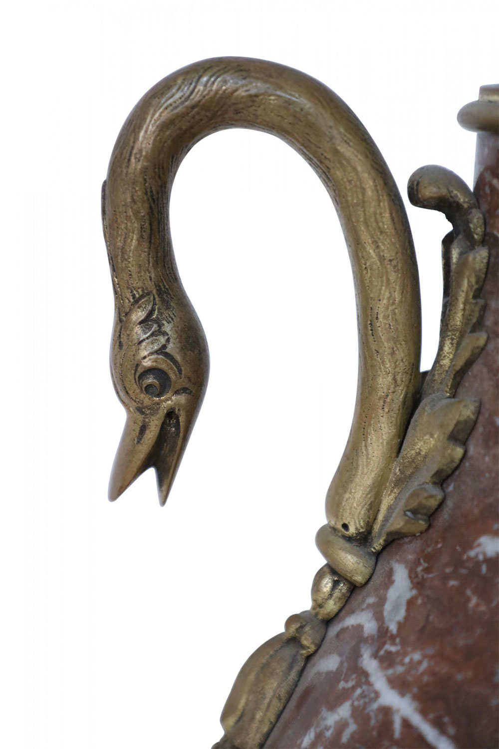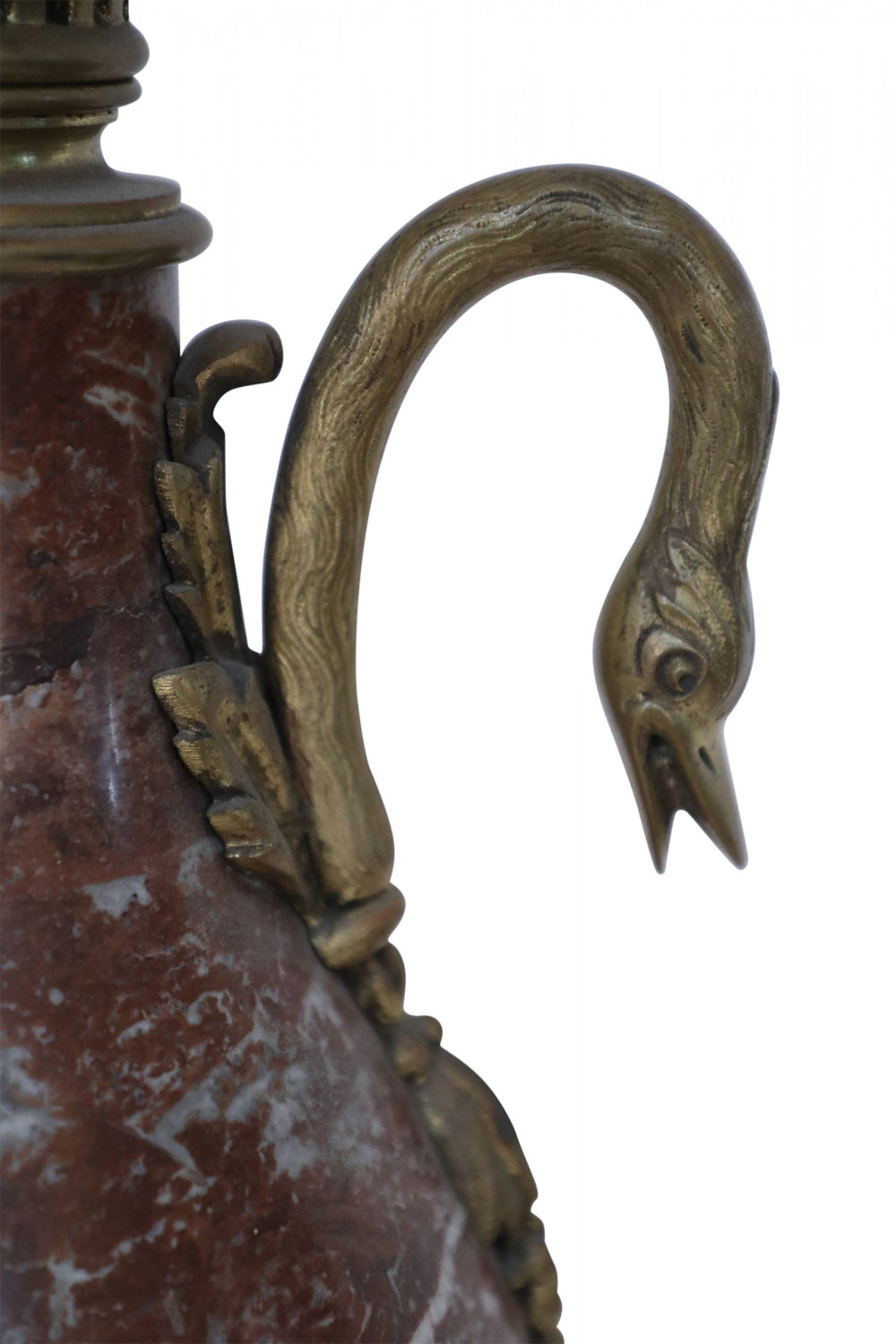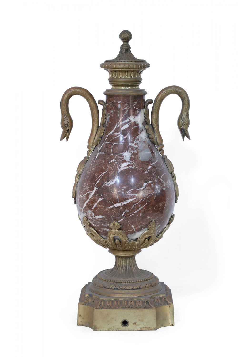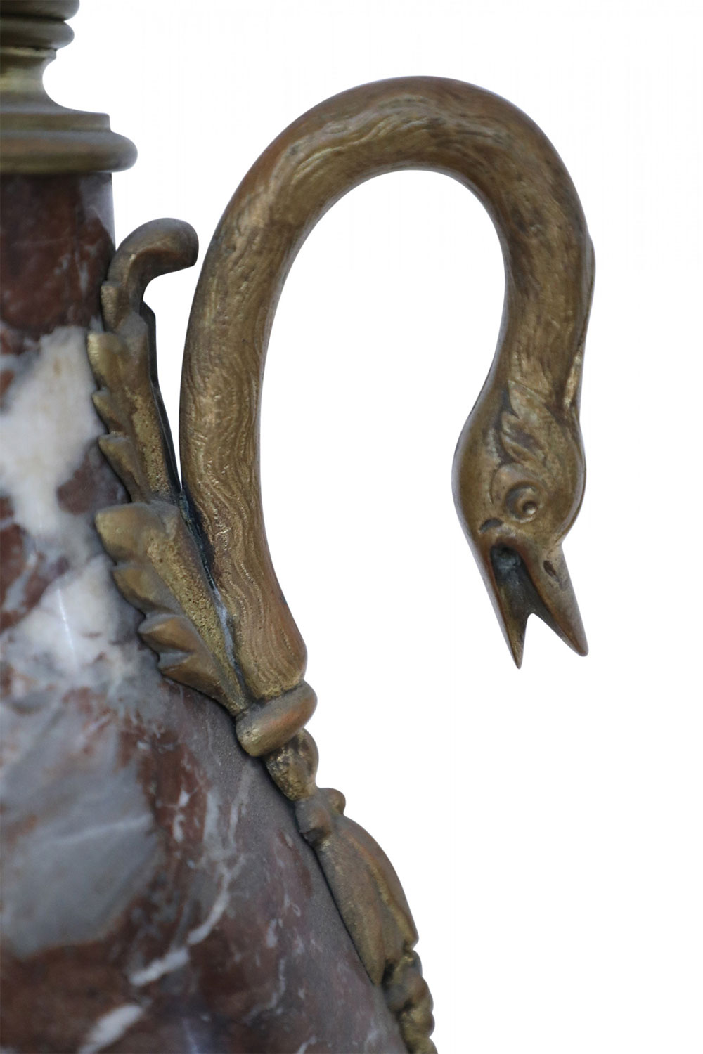 PAIR of French Neoclassical decorative urns made from globular, burgundy marble bodies nestled within decorative bronze cradles held by square bases, accented in two swooping bronze duck handles and topped with ornate bronze finials (PRICED AS PAIR).