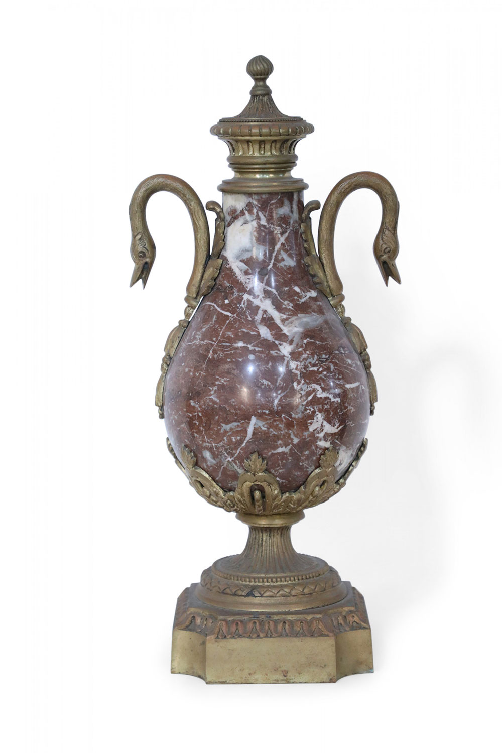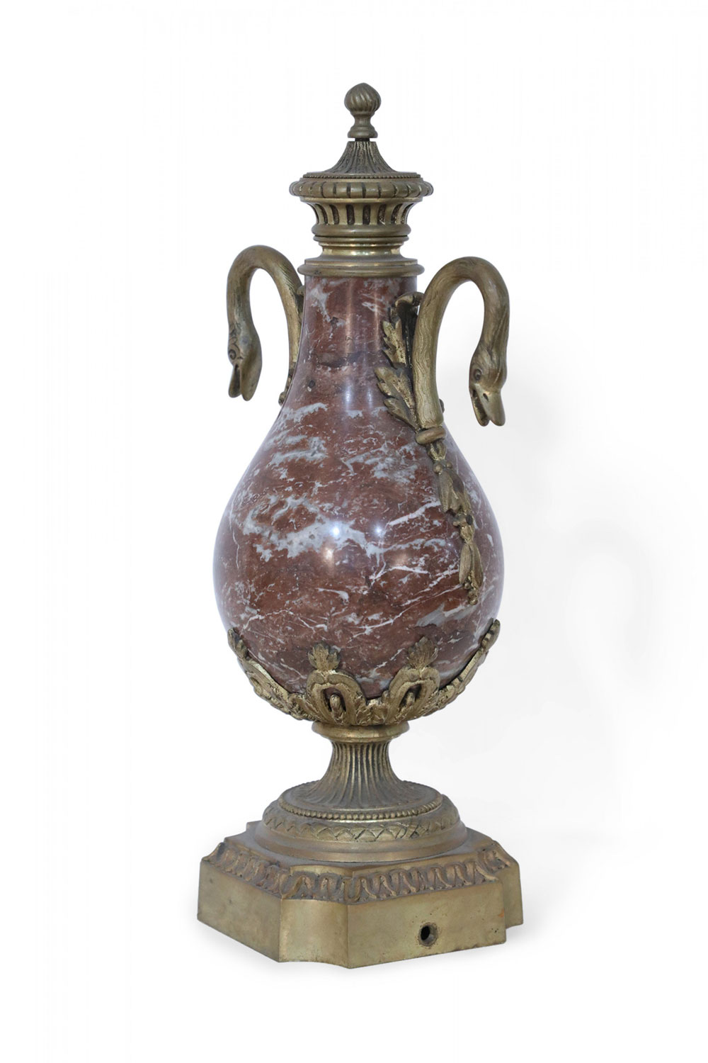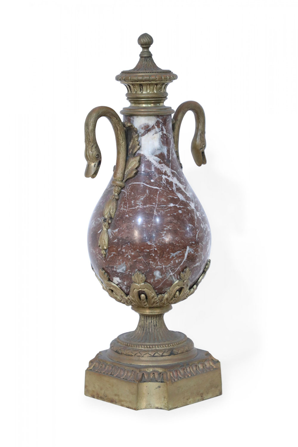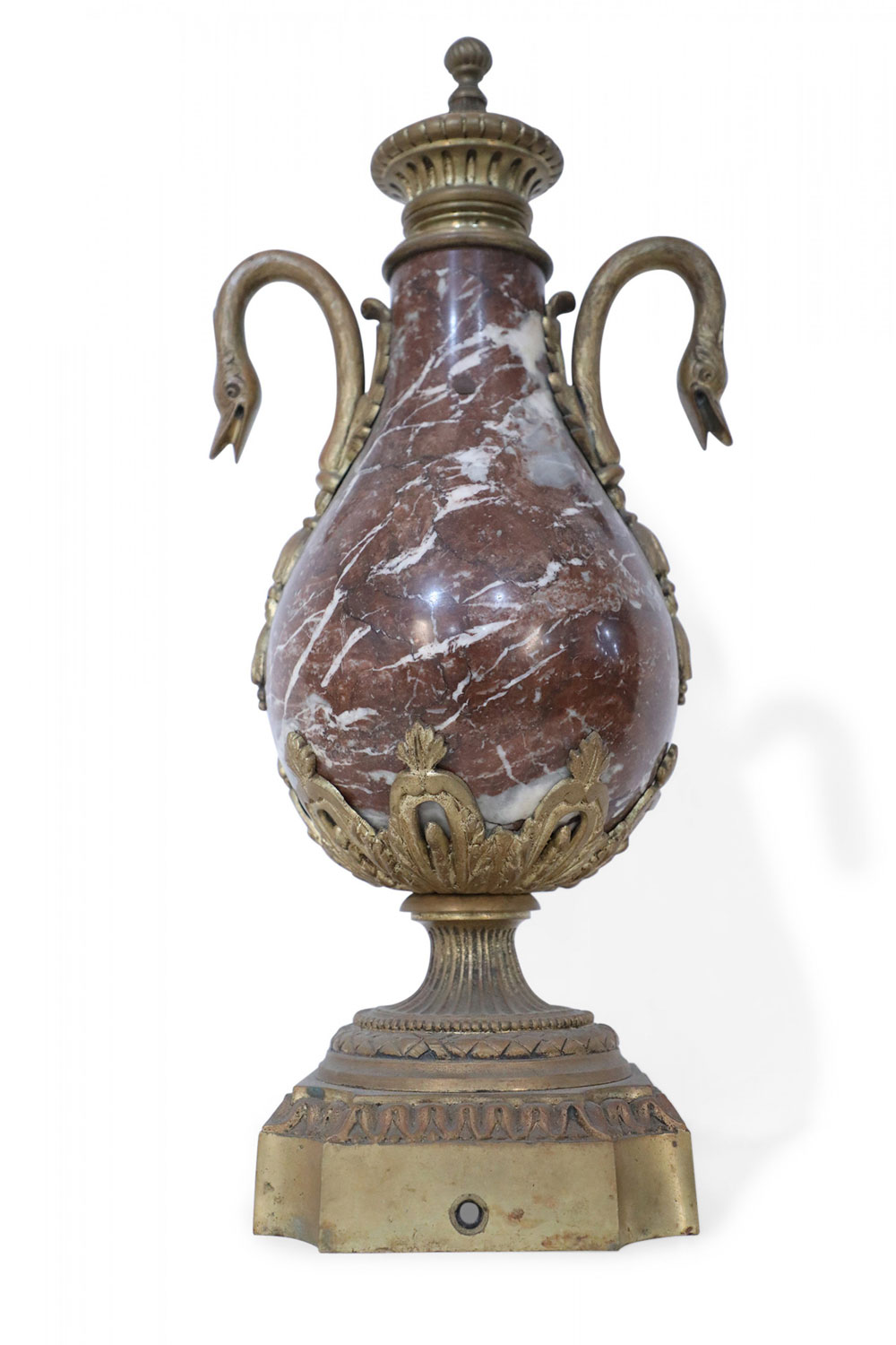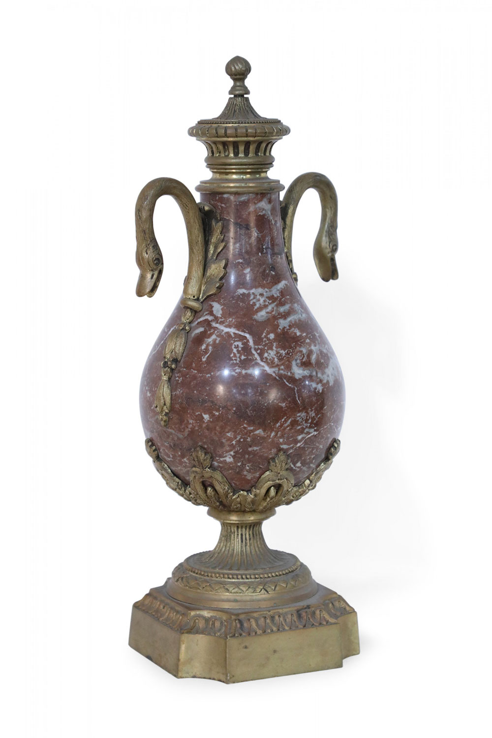 PAIR of French Neoclassical decorative urns made from globular, burgundy marble bodies nestled within decorative bronze cradles held by square bases, accented in two swooping bronze duck handles and topped with ornate bronze finials (PRICED AS PAIR).