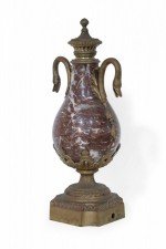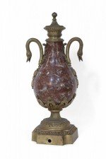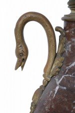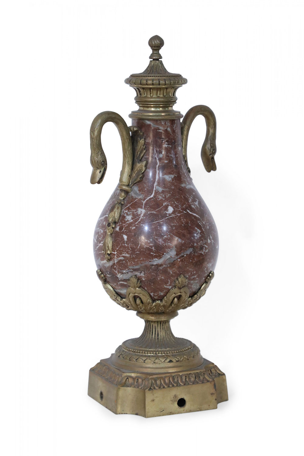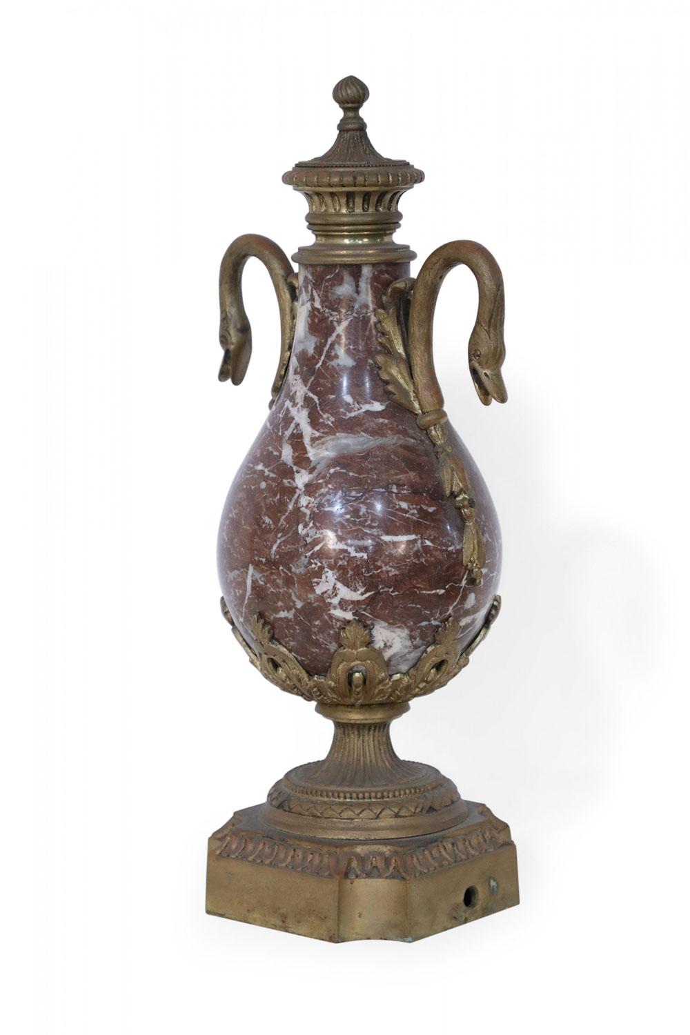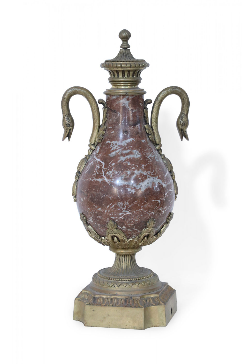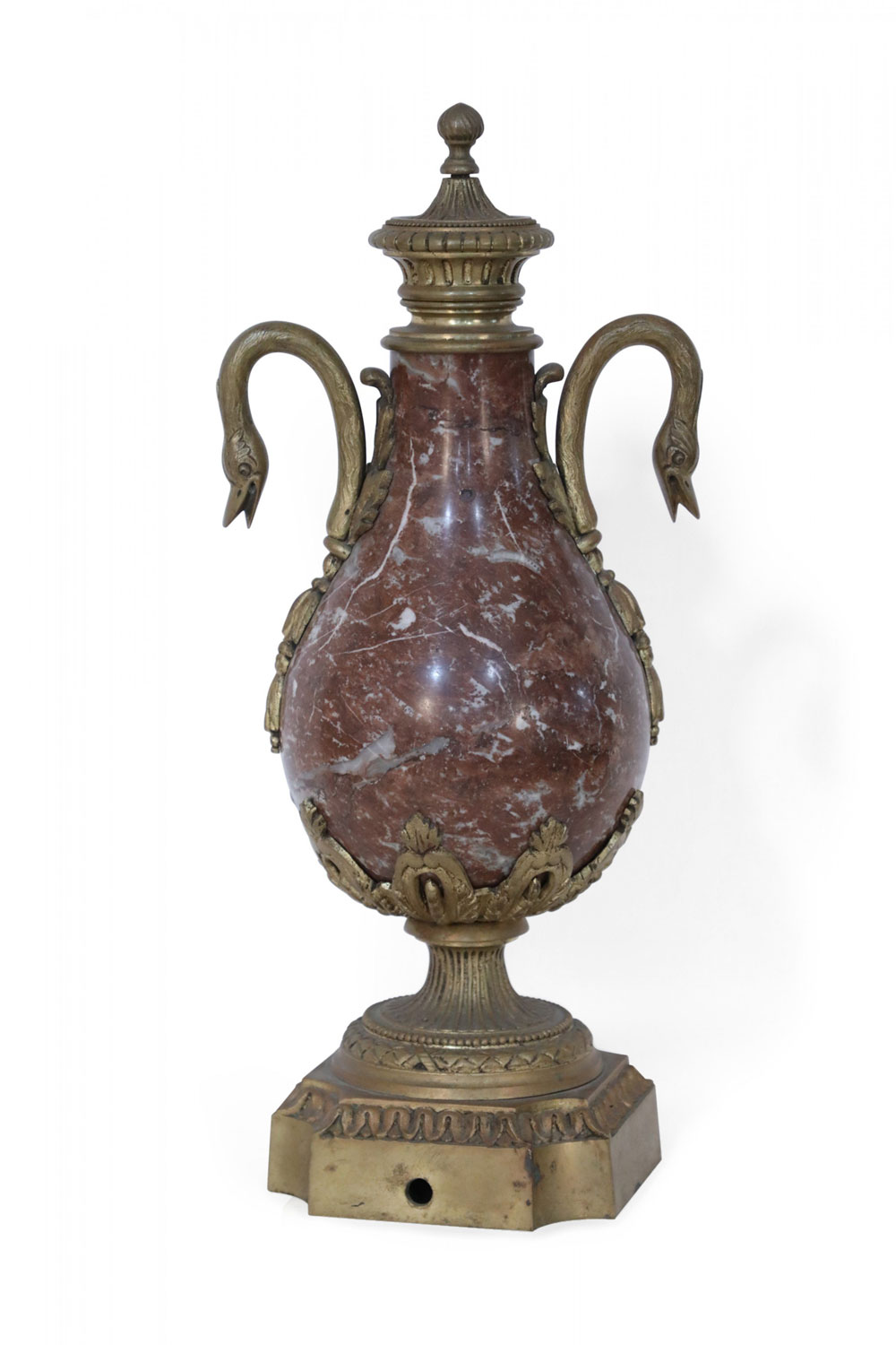 PAIR of French Neoclassical decorative urns made from globular, burgundy marble bodies nestled within decorative bronze cradles held by square bases, accented in two swooping bronze duck handles and topped with ornate bronze finials (PRICED AS PAIR).