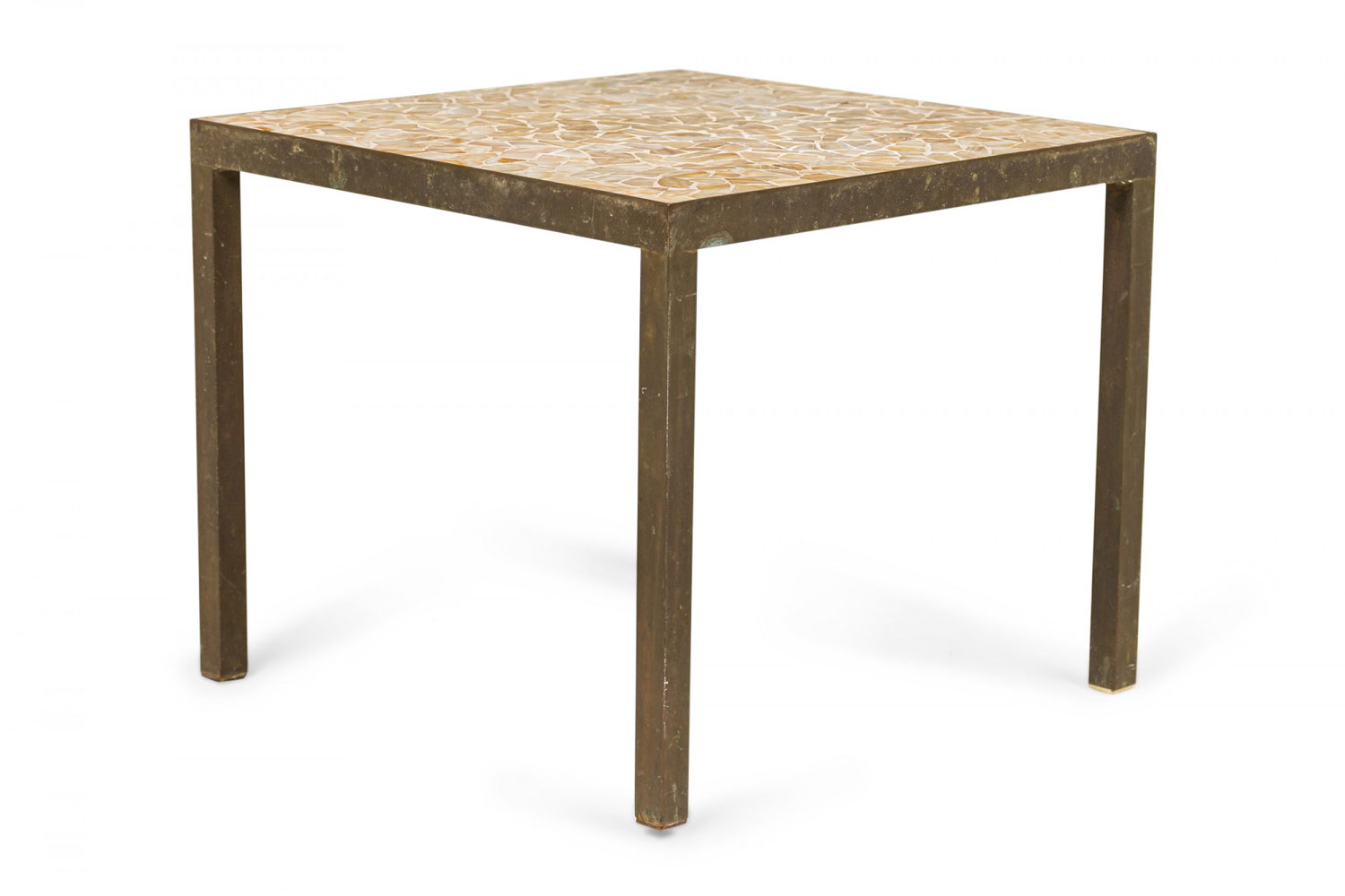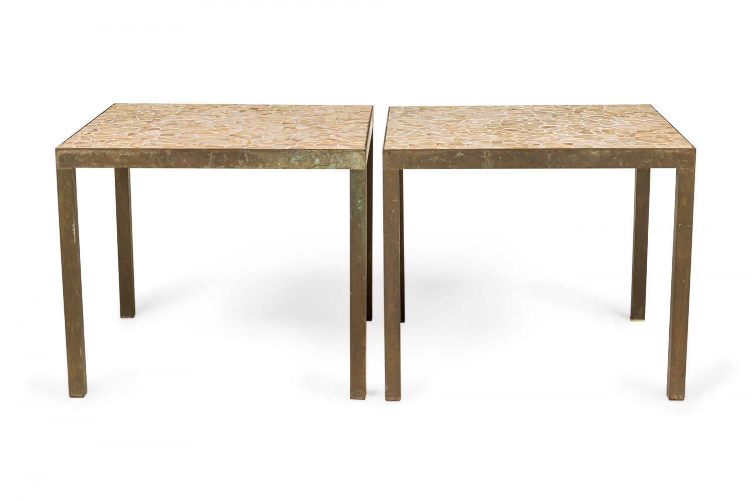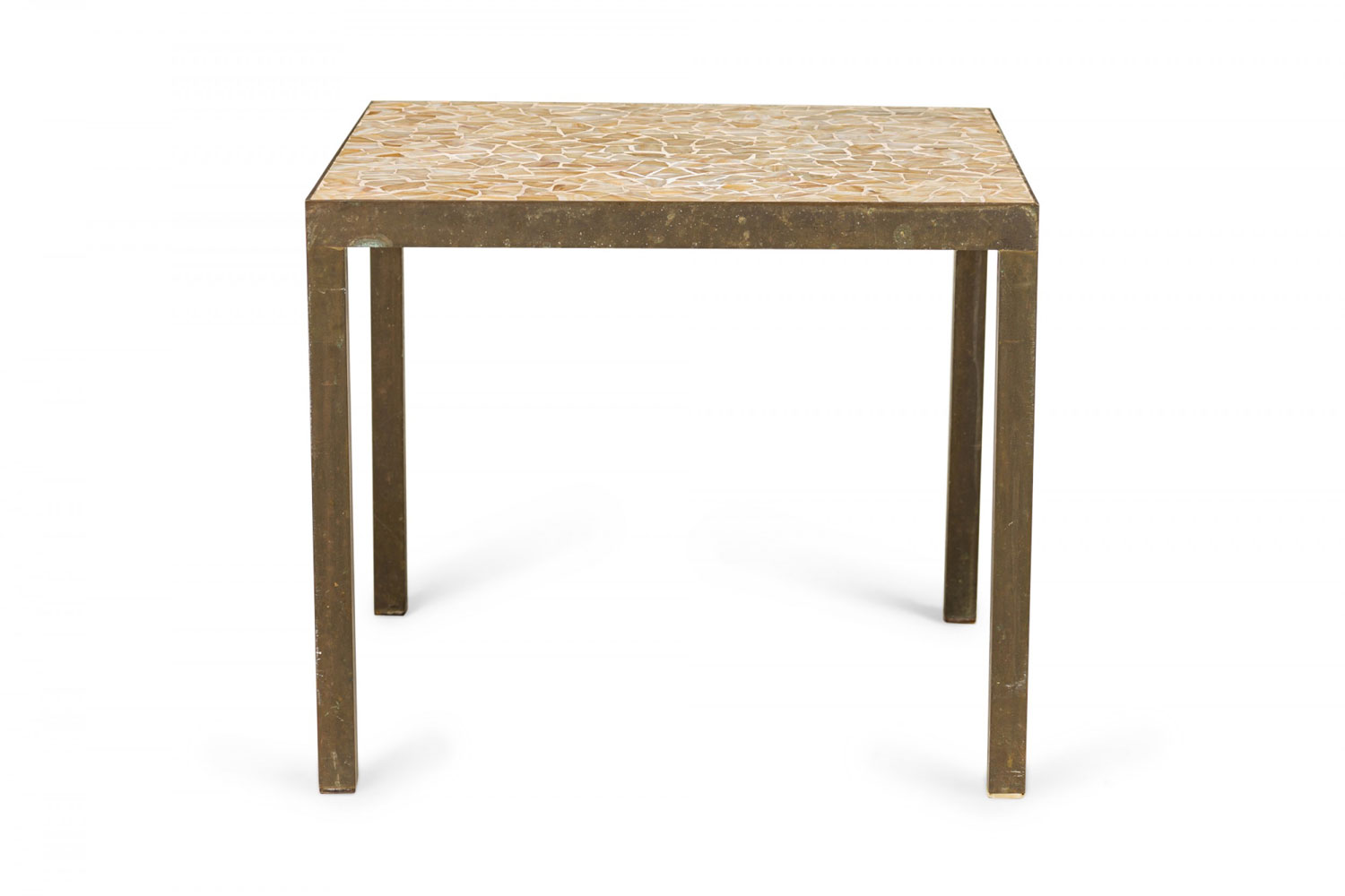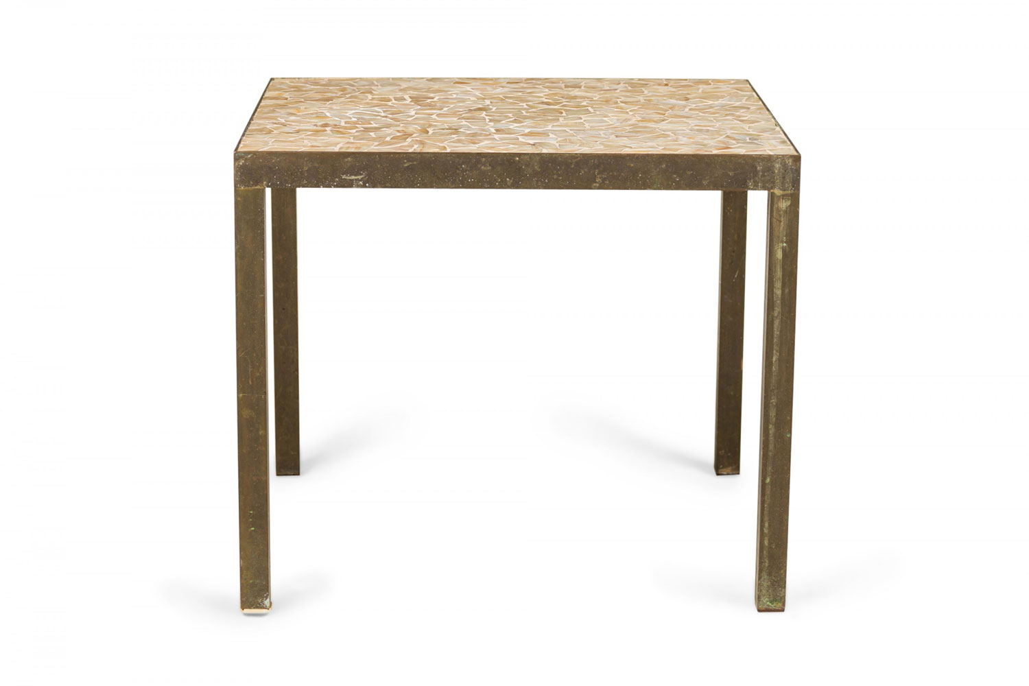PAIR of American Mid-Century square end / side tables with beige mosaic tile tops resting on patinated brass frames with four square legs. (JACK STEWART)(PRICED AS PAIR)
