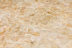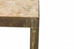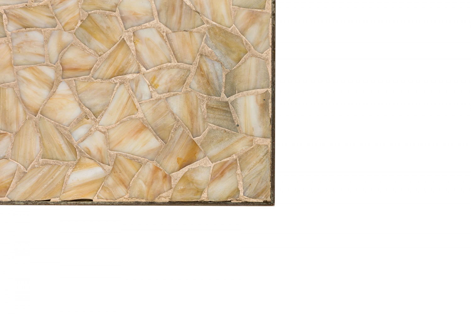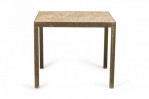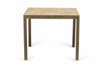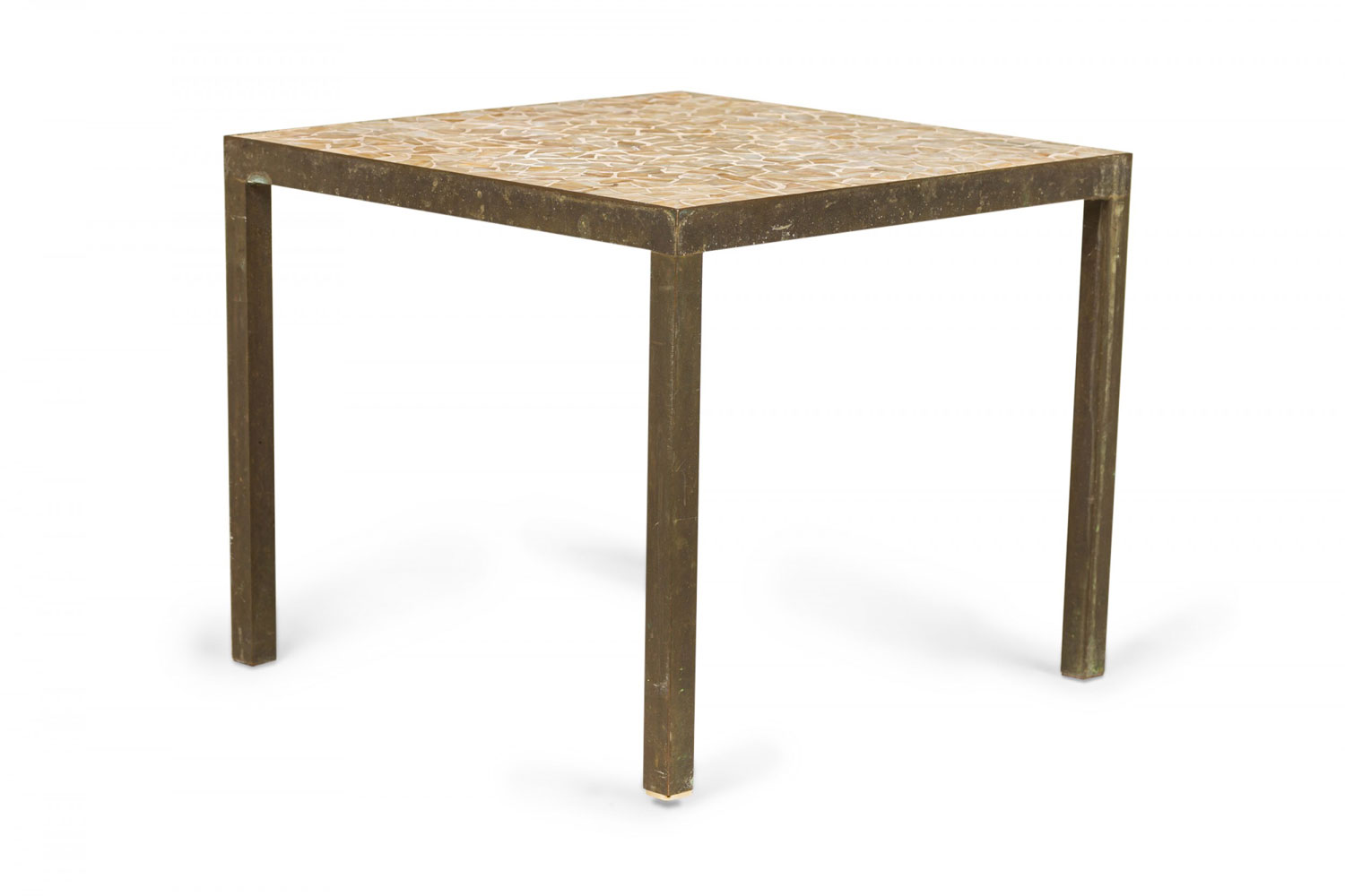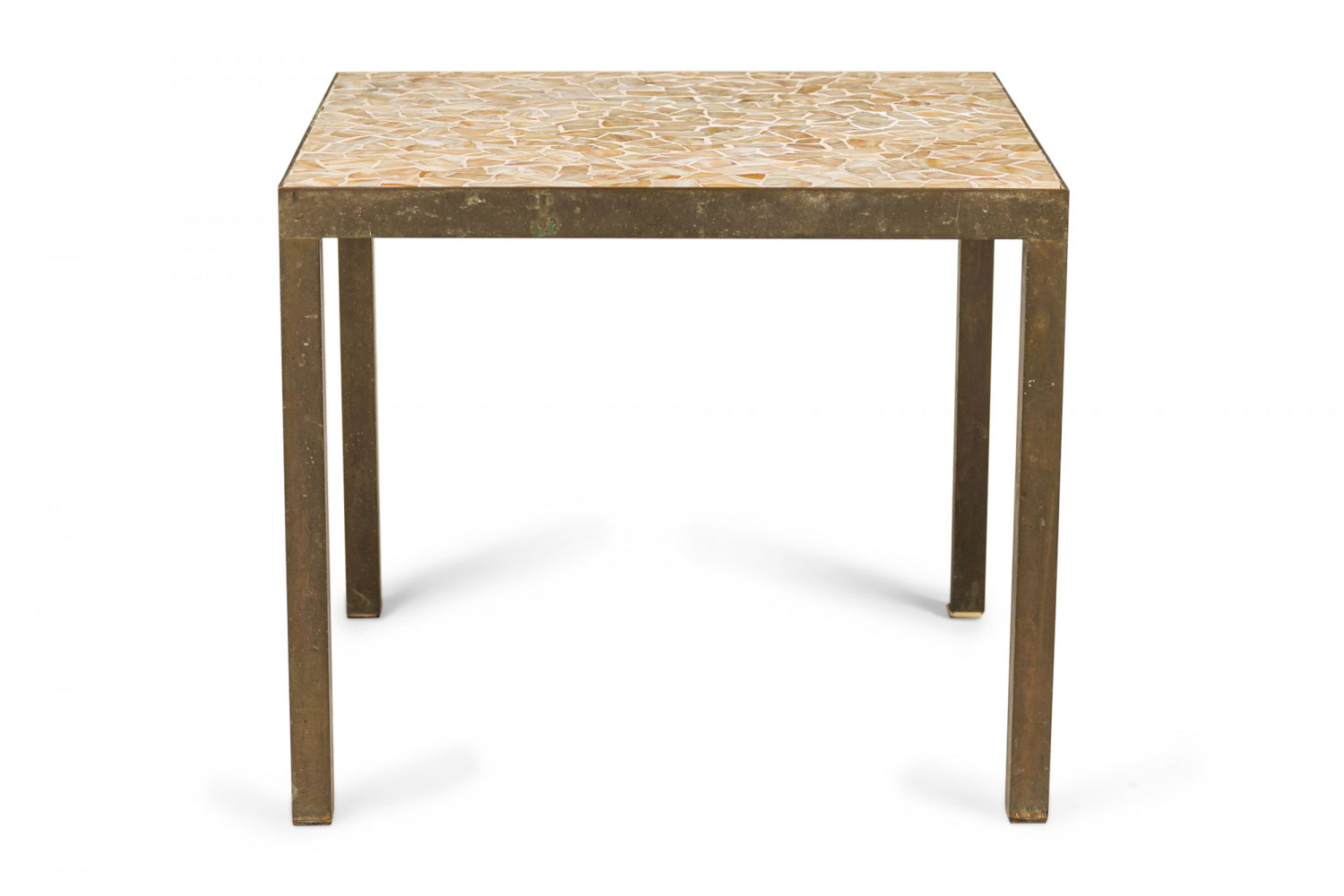 PAIR of American Mid-Century square end / side tables with beige mosaic tile tops resting on patinated brass frames with four square legs. (JACK STEWART)(PRICED AS PAIR)