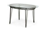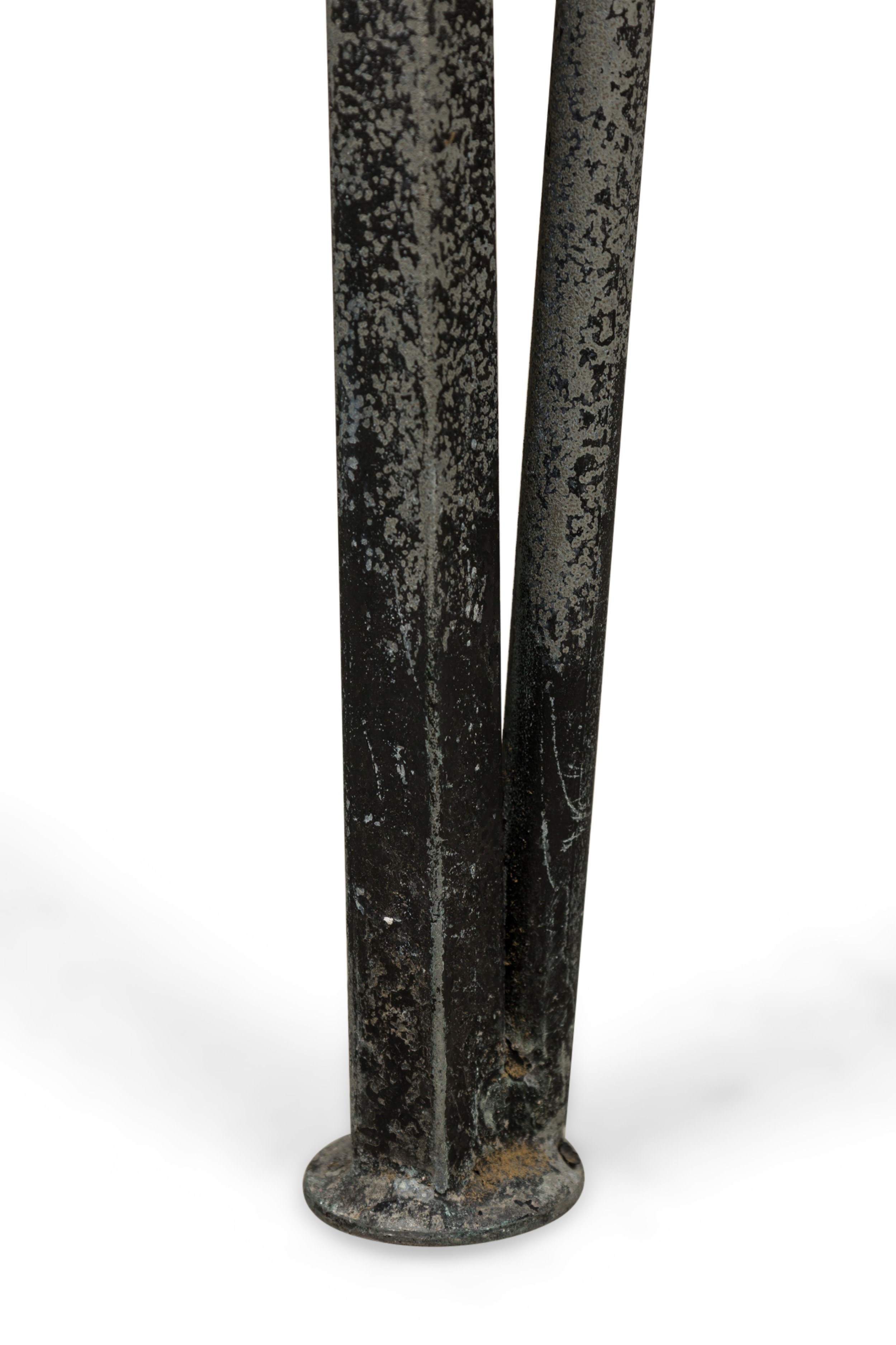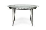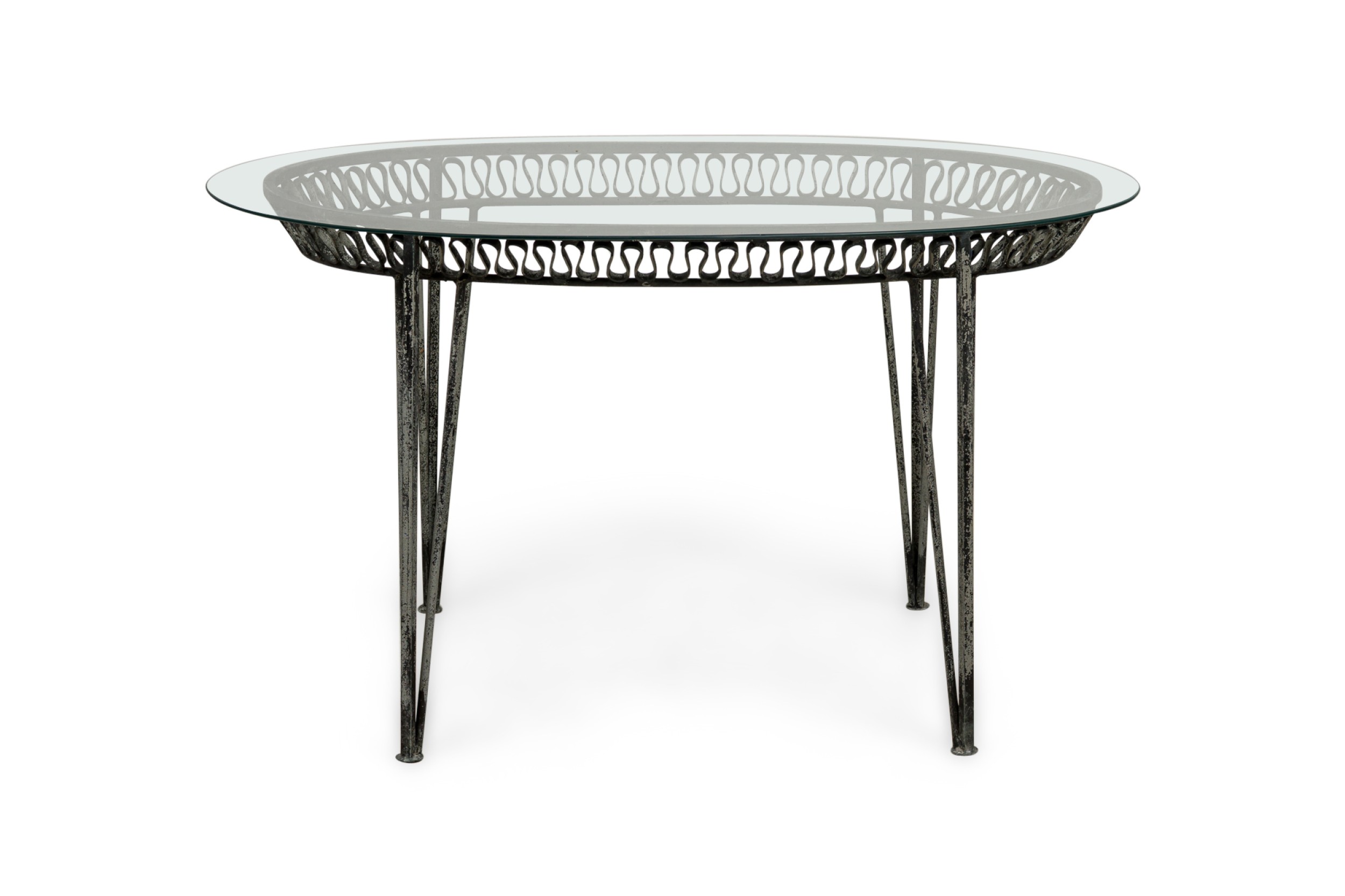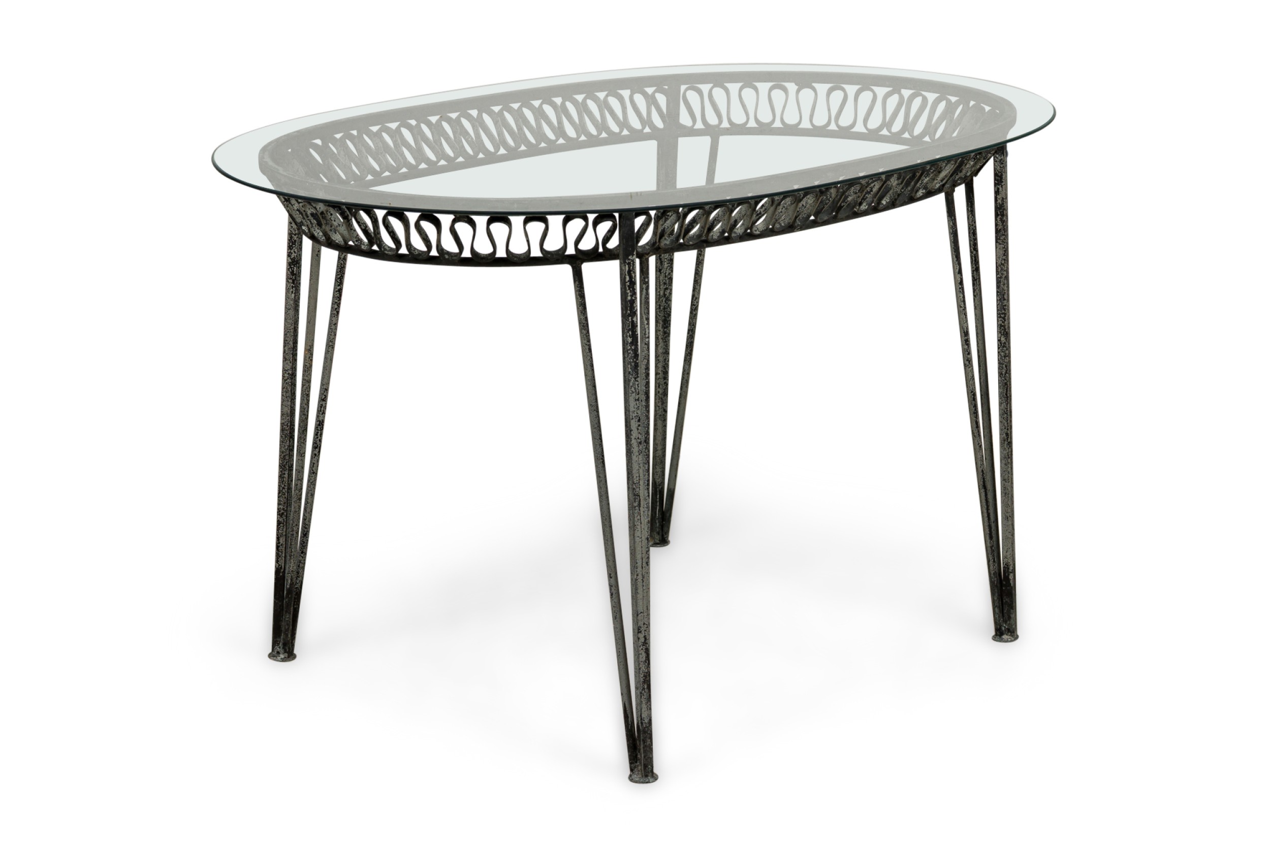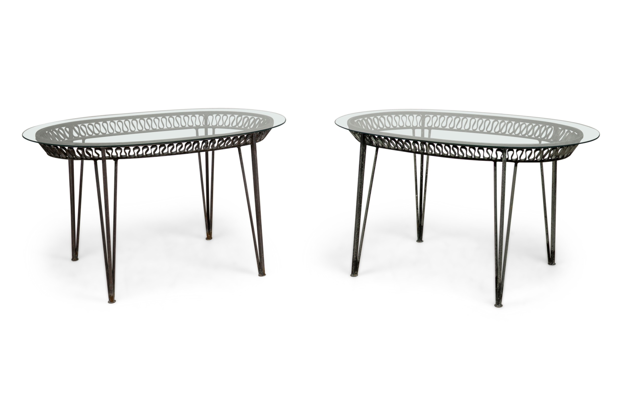 *DO NOT MARK IN UNTIL GLASS TOP IS DELIVERED*2 American Mid-Century iron outdoor dining tables with oval frames with decorative ribbon design between two support rail resting on four hairpin legs. (Missing glass tops.)(JOHN SALTERINI)(PRICED EACH)(Similar tables: DUF0164, DUF0168)