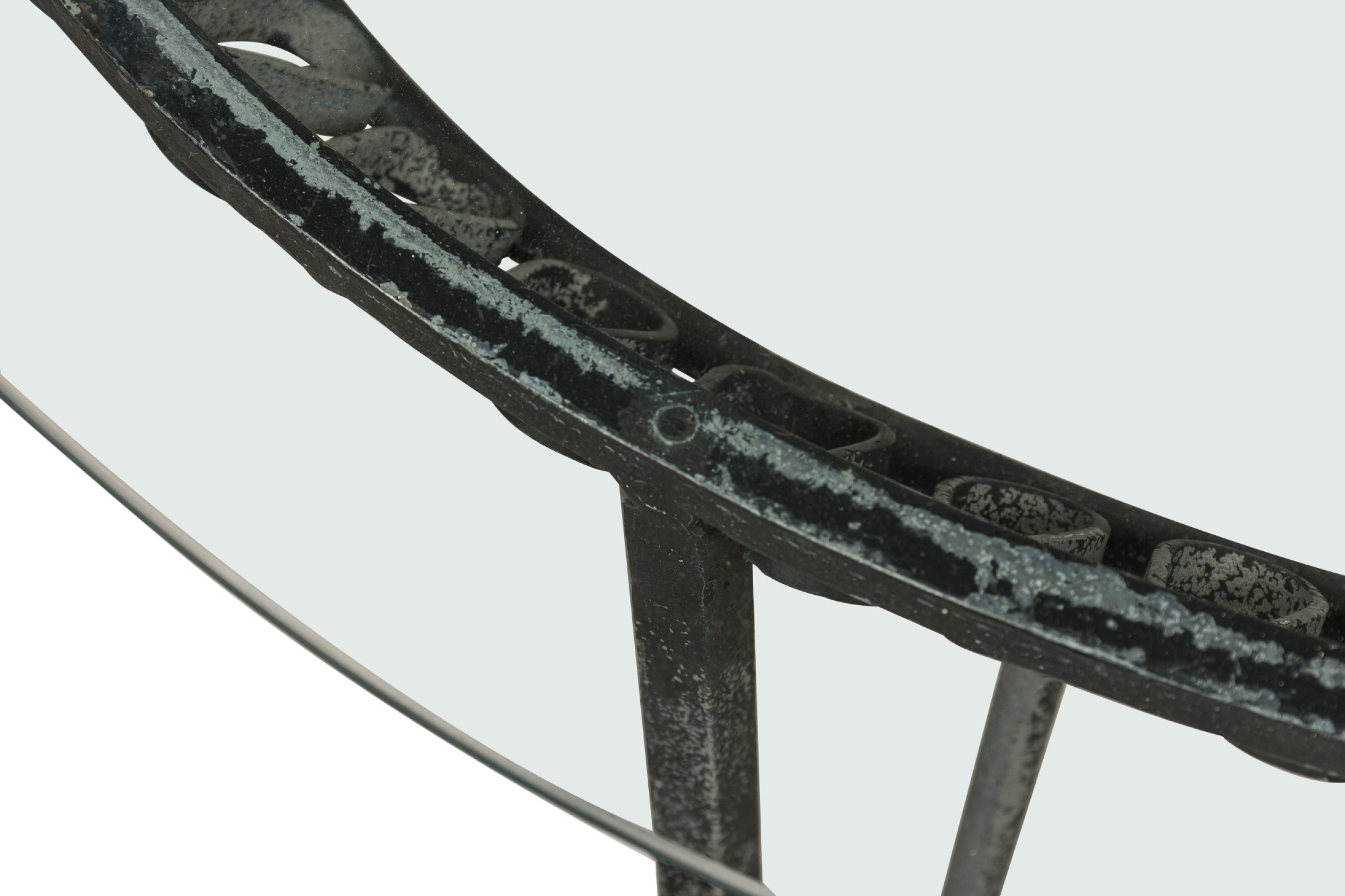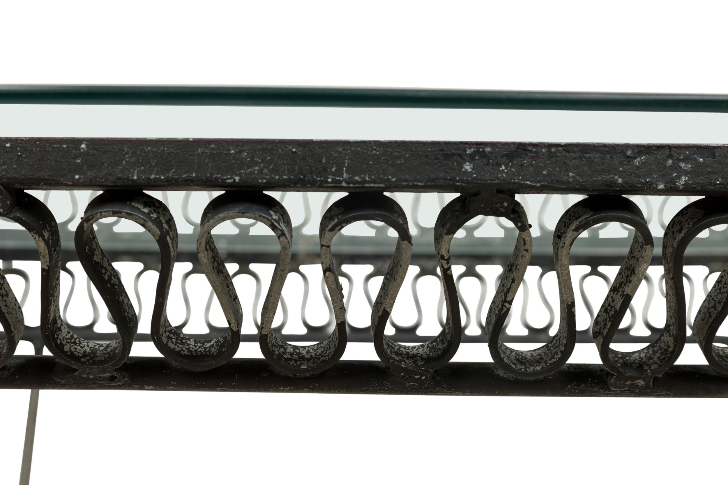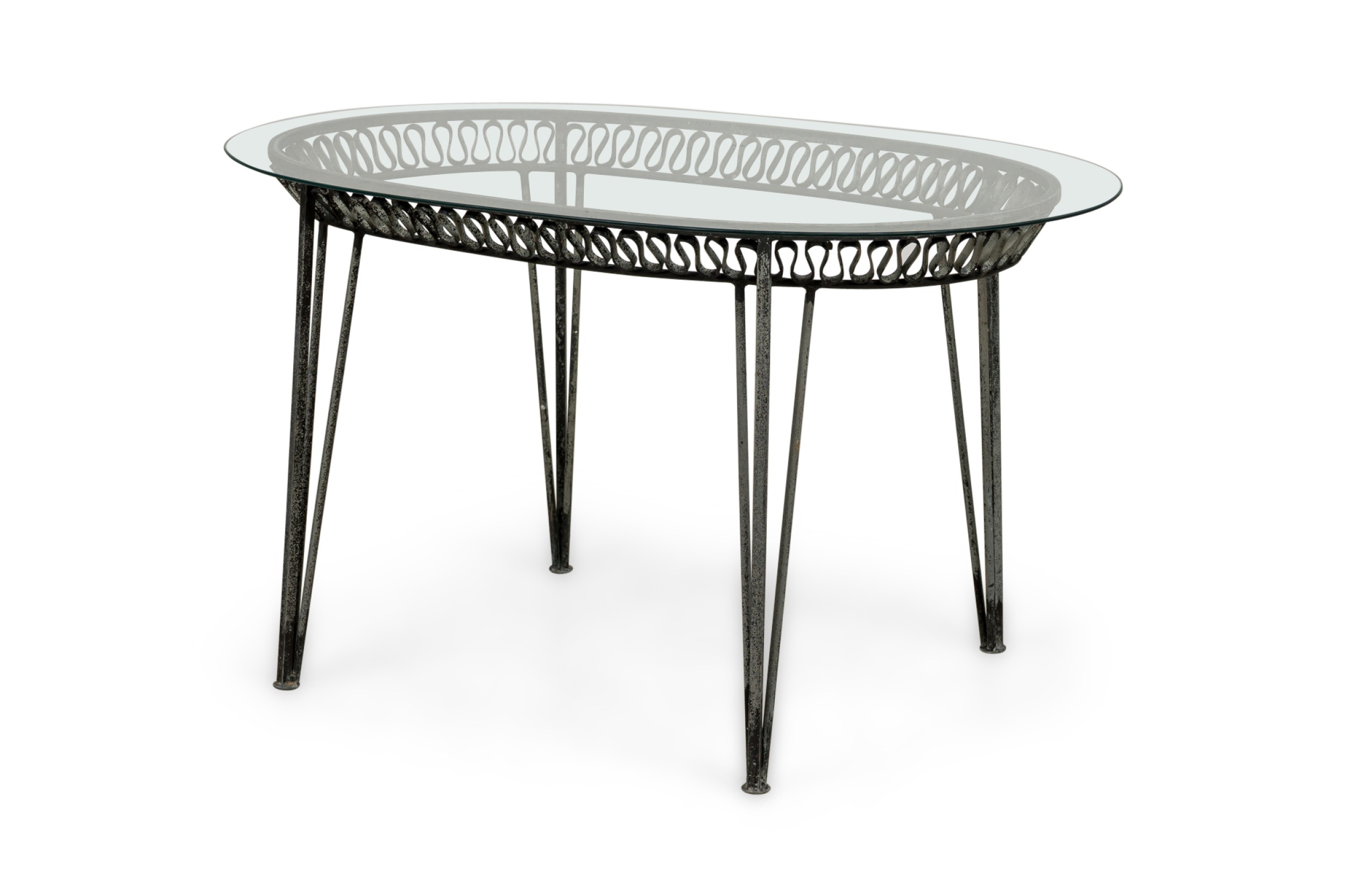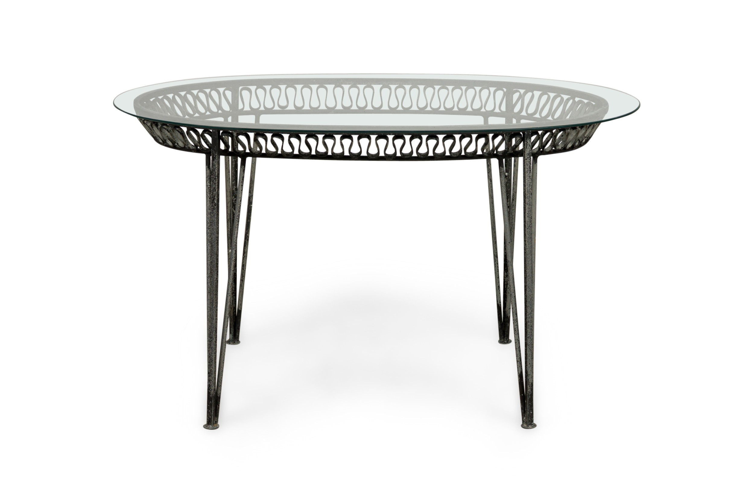 *DO NOT MARK IN UNTIL GLASS TOP IS DELIVERED*2 American Mid-Century iron outdoor dining tables with oval frames with decorative ribbon design between two support rail resting on four hairpin legs. (Missing glass tops.)(JOHN SALTERINI)(PRICED EACH)(Similar tables: DUF0164, DUF0168).