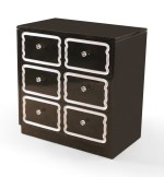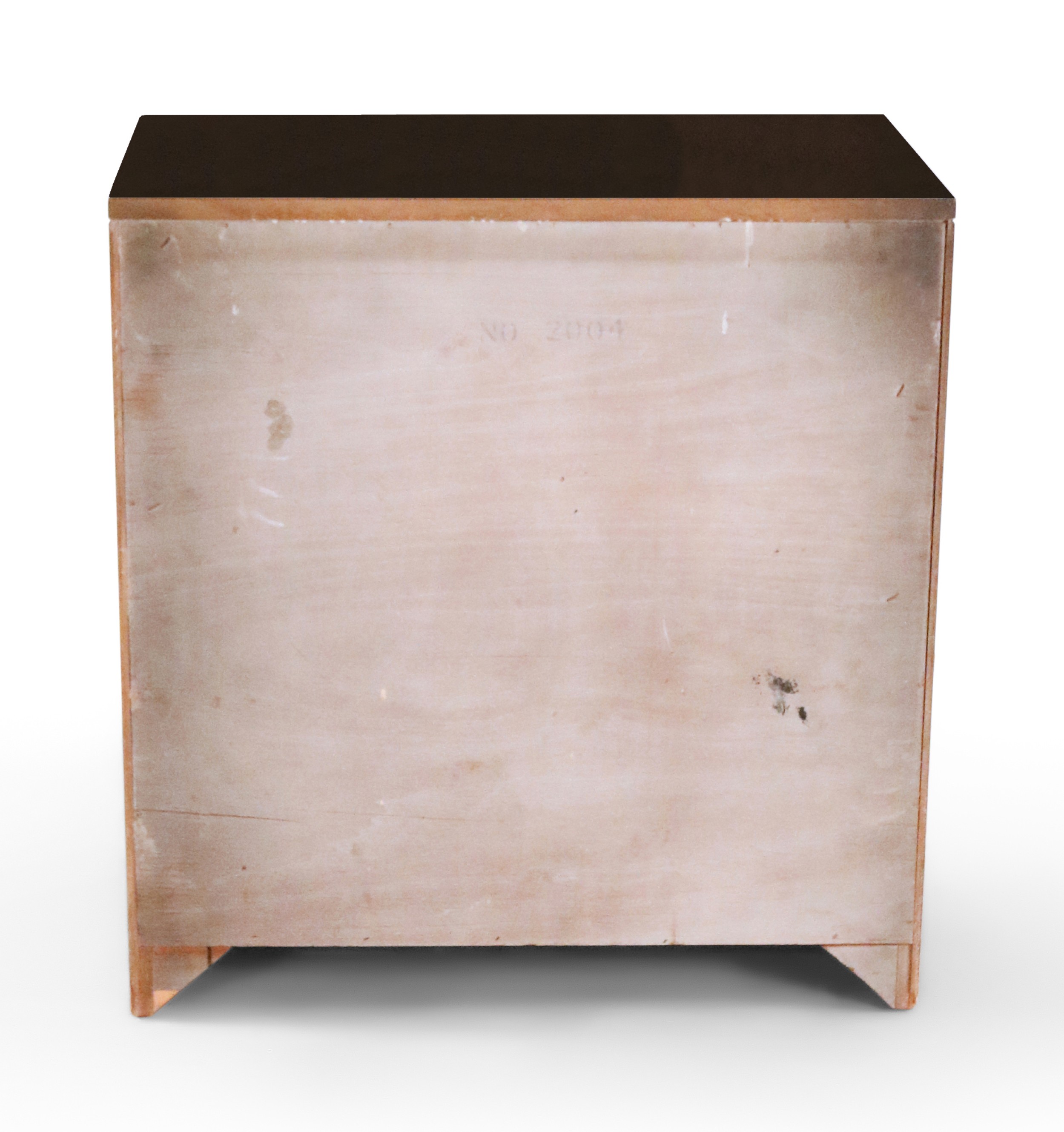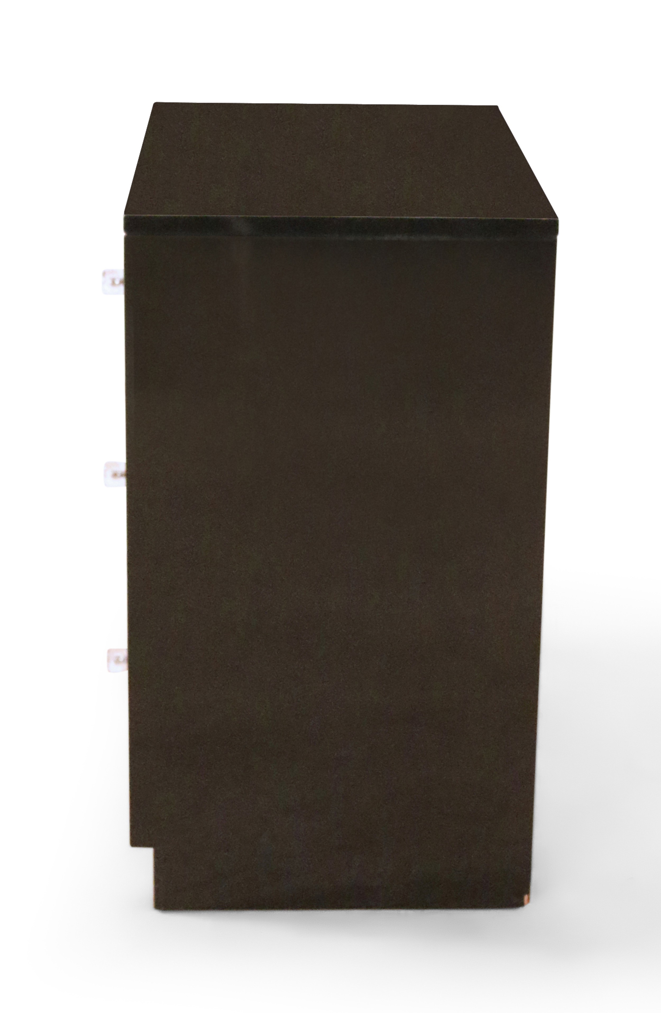PAIR of Mid-Century chest of drawers with a black lacquer finish, raised decorative lucite drawer details, lucite drawer pulls, and black glass tops. (PRICED AS PAIR).