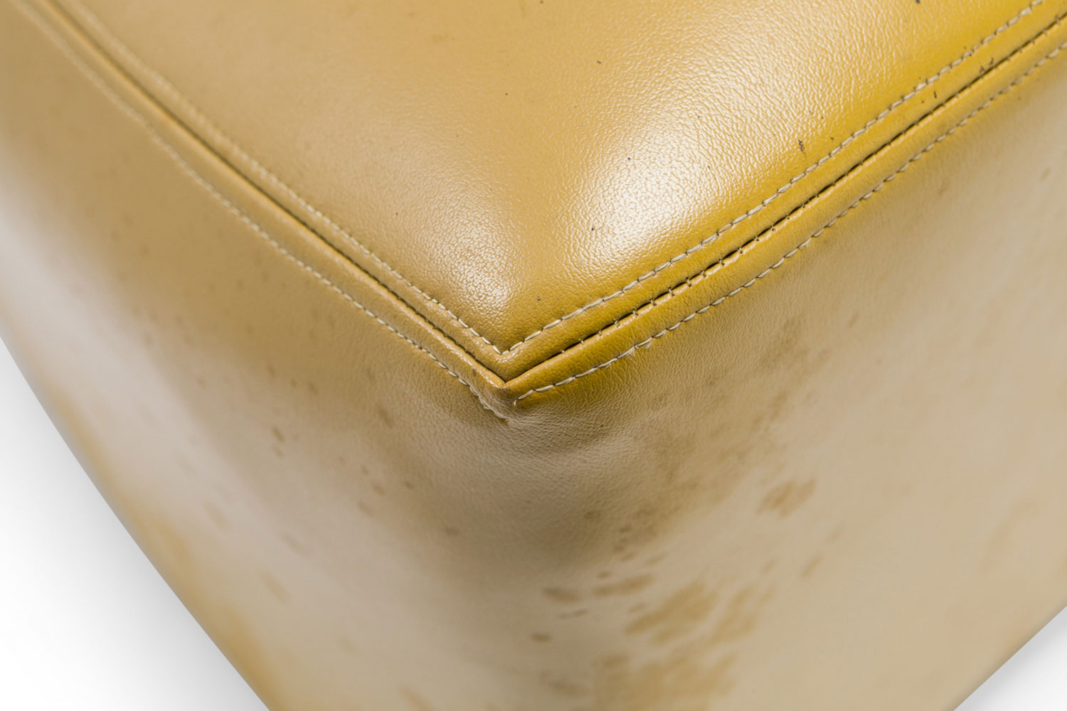 PAIR of American Mid-Century saddle ottomans with bright yellow leather upholstery. (PRICED AS PAIR)(Available in black upholstery: DUF0345).