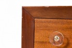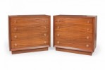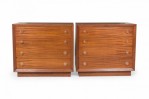 PAIR of Mid-Century ribbon mahogany four-drawer commodes with disk-shaped lucite drawer pulls. (MODERN AGE)(PRICED AS PAIR)