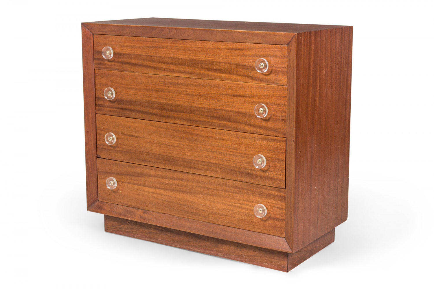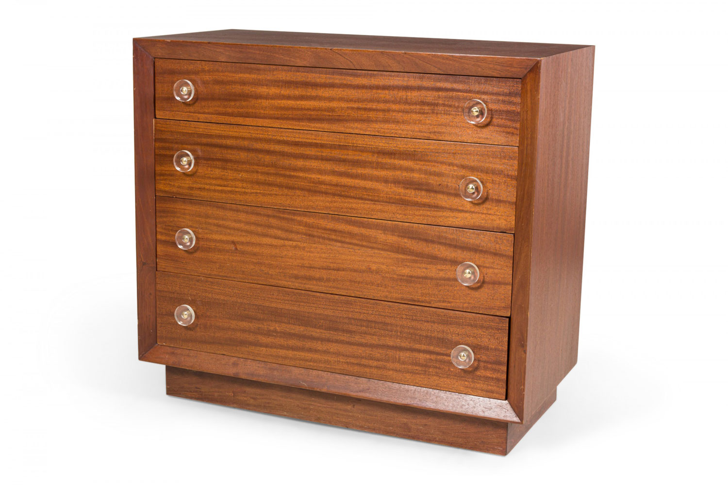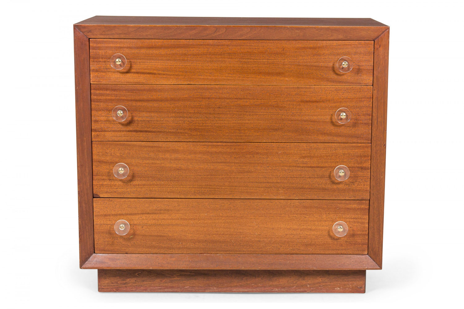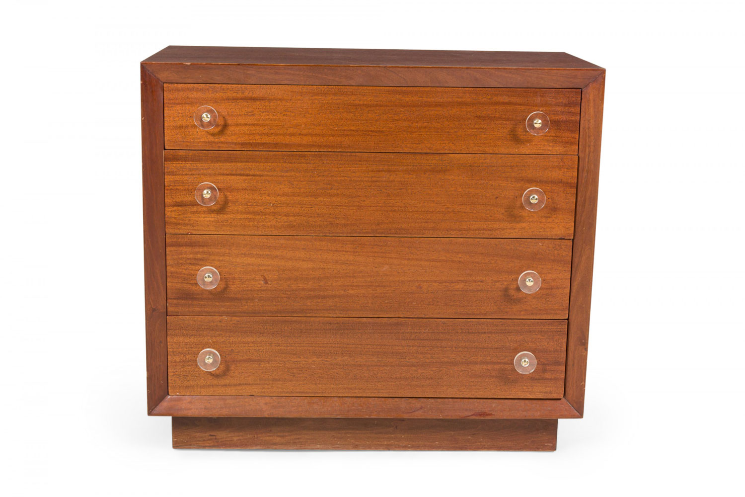Pair of Modern Age Mid-Century Ribbon Mahogany and Lucite Disk Drawer Pull Four-Drawer Commodes