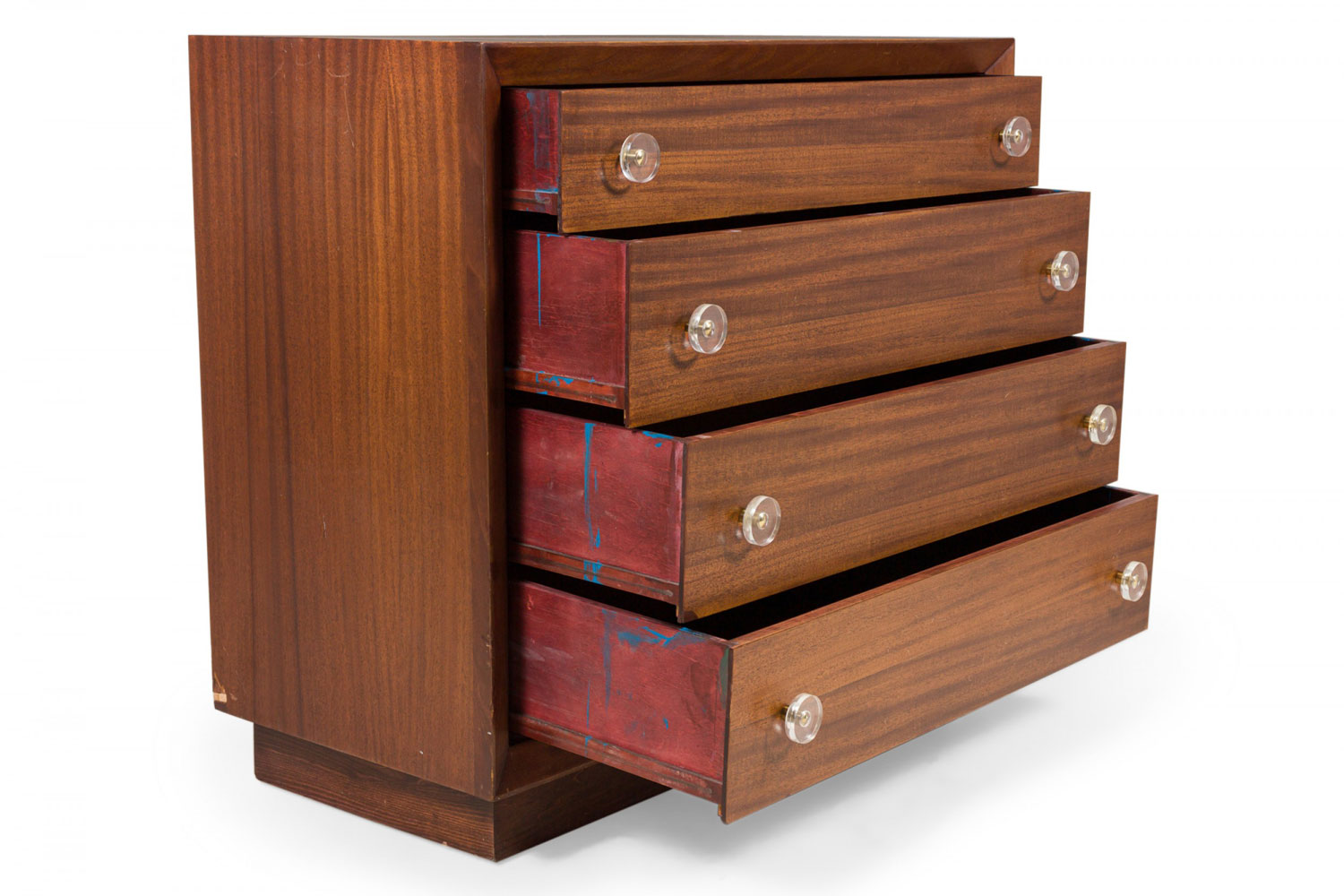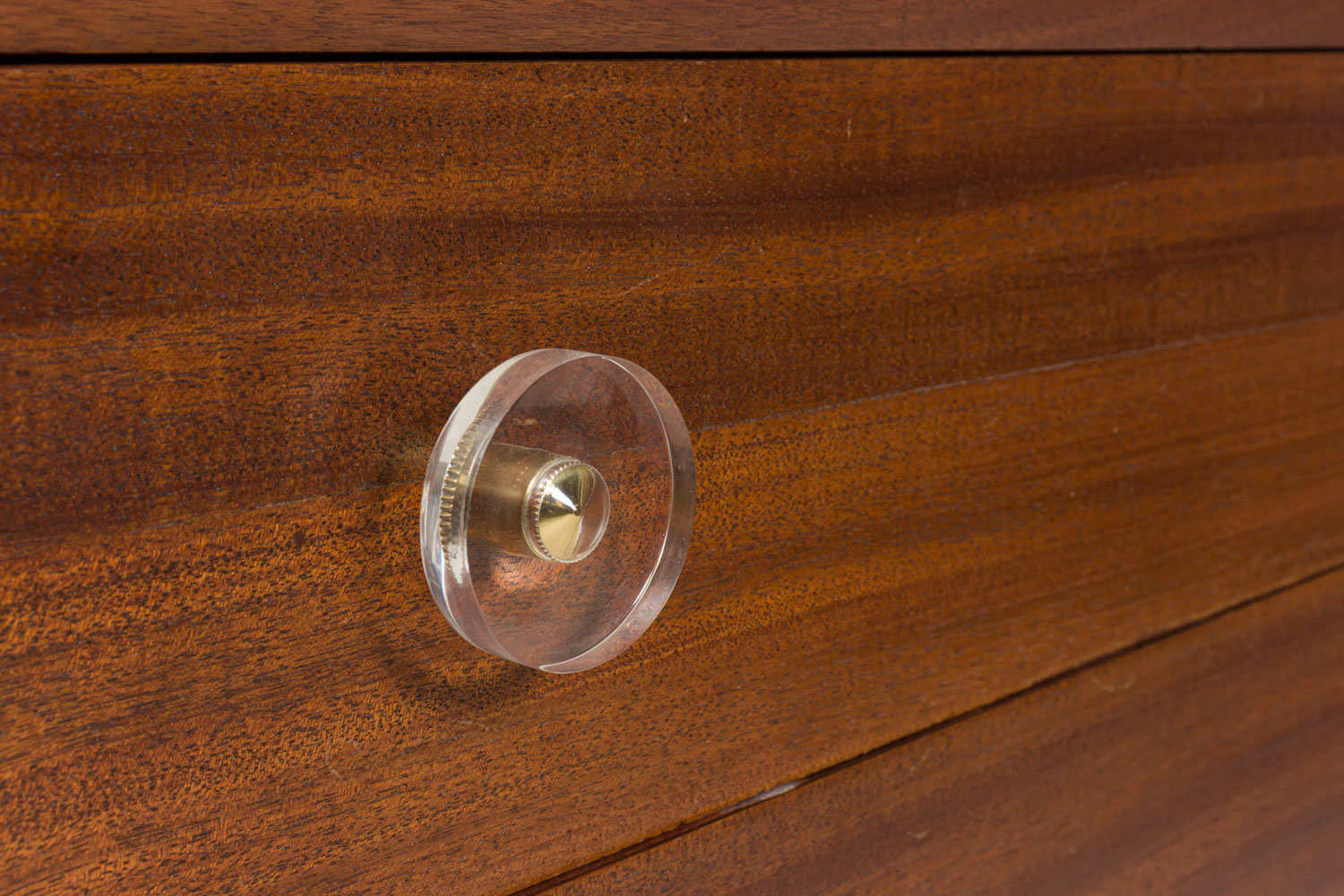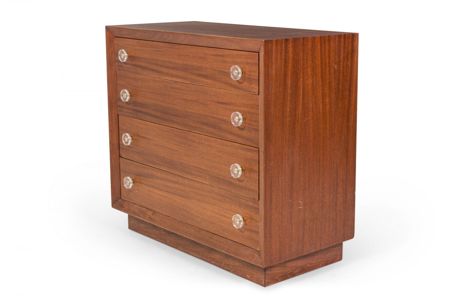 Pair of Modern Age Mid-Century Ribbon Mahogany and Lucite Disk Drawer Pull Four-Drawer Commodes