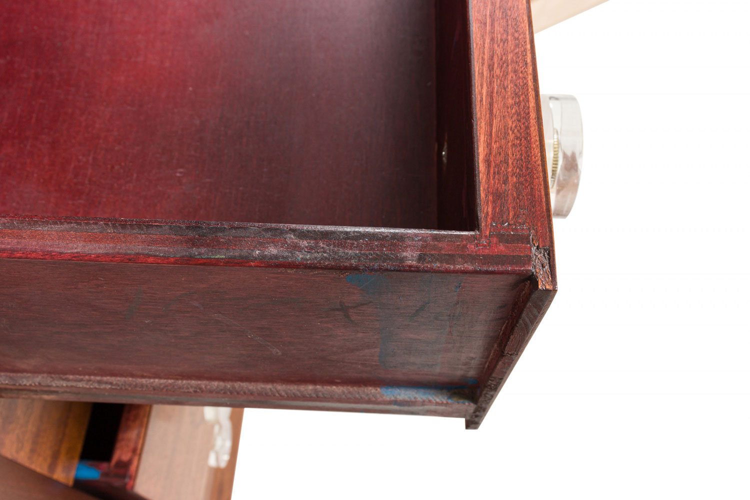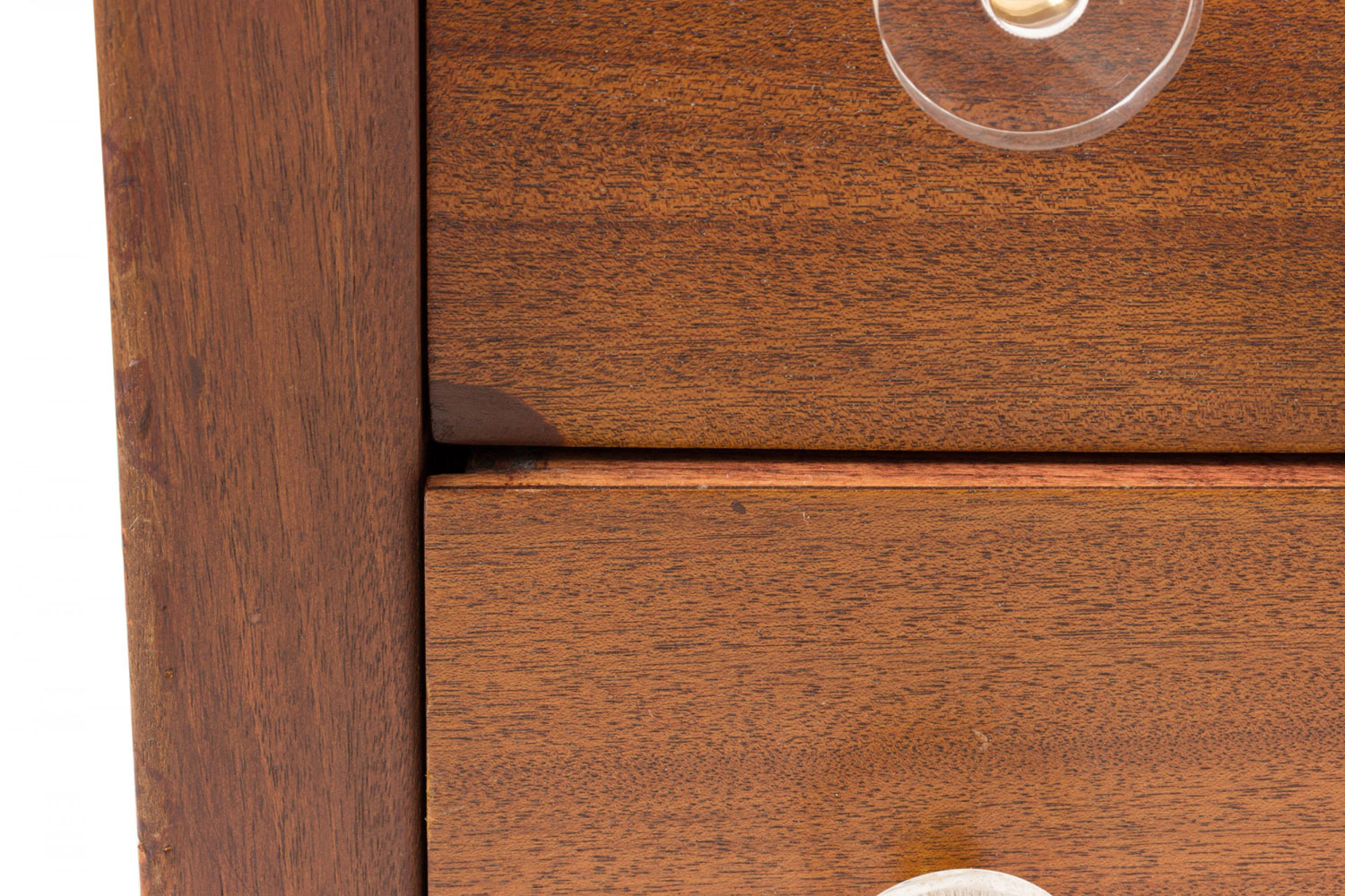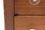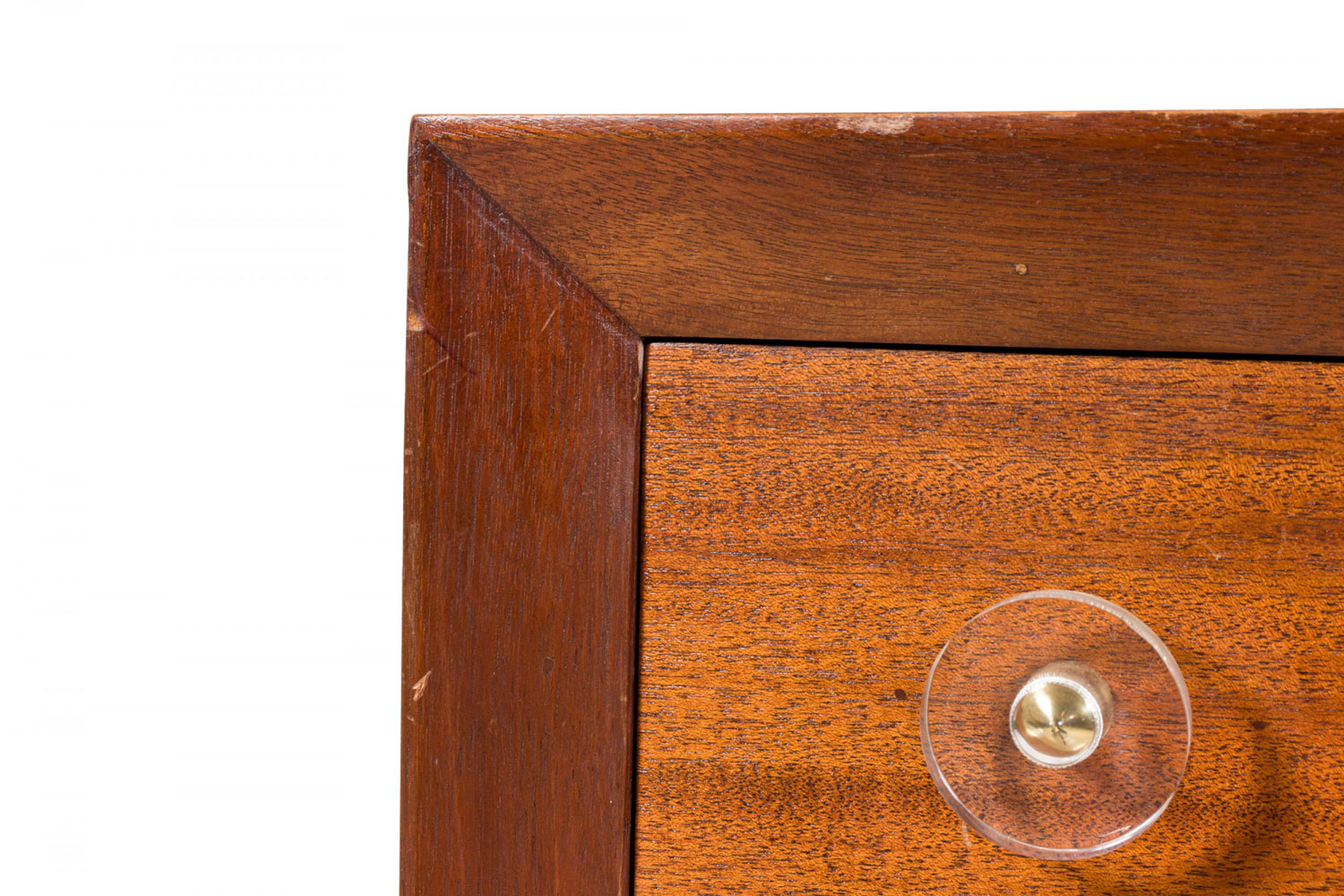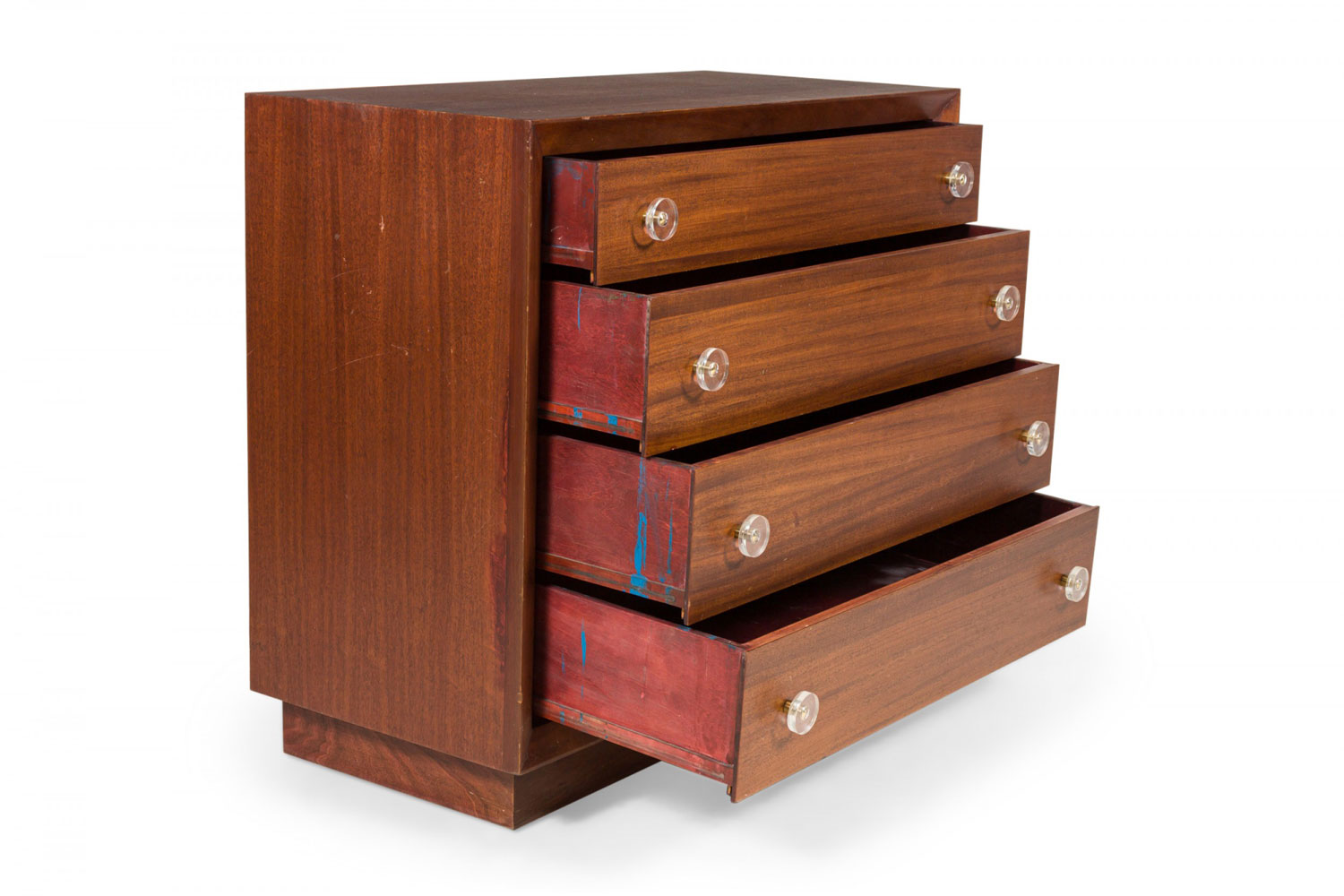 Pair of Modern Age Mid-Century Ribbon Mahogany and Lucite Disk Drawer Pull Four-Drawer Commodes
