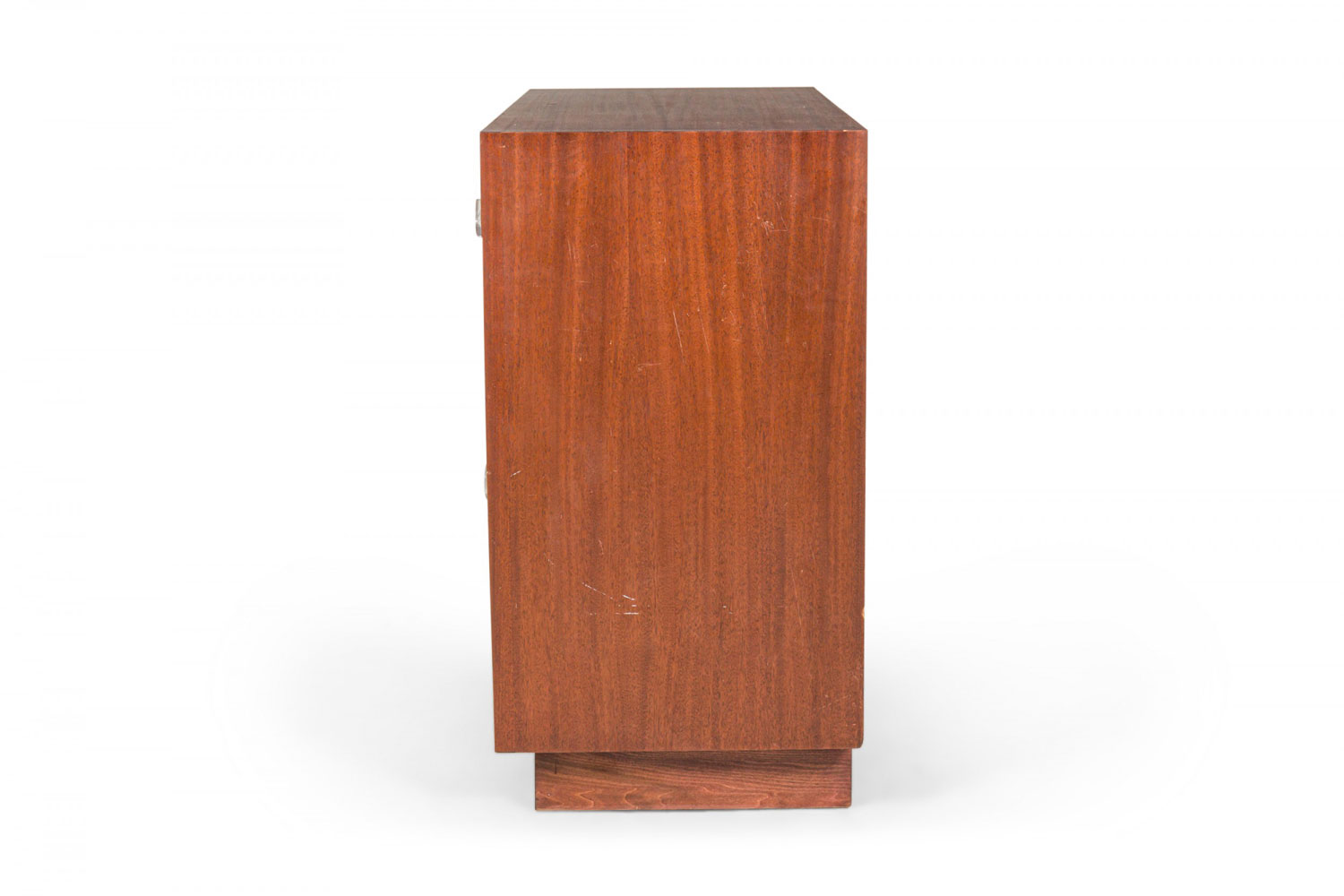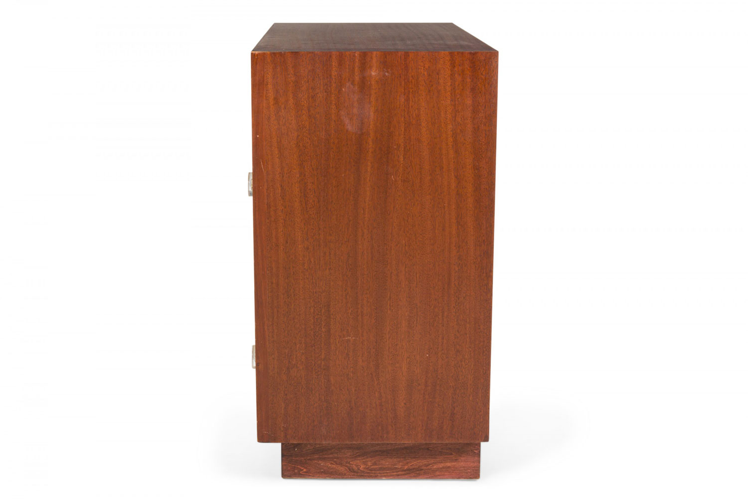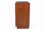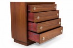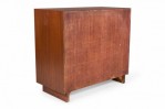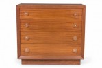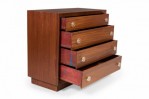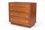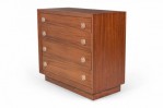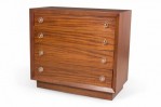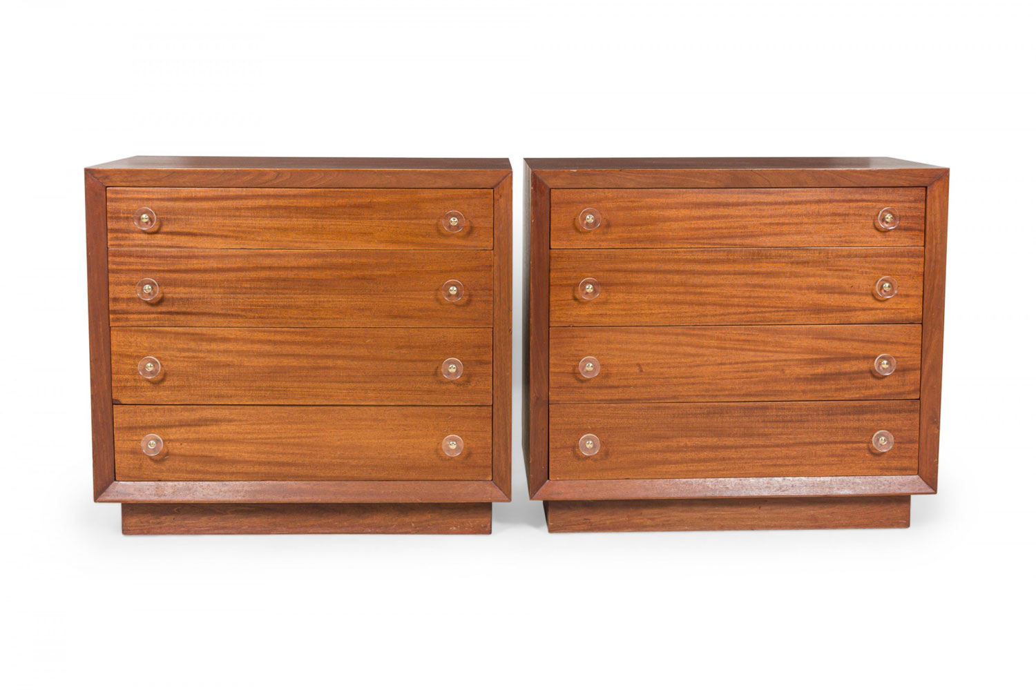 PAIR of Mid-Century ribbon mahogany four-drawer commodes with disk-shaped lucite drawer pulls. (MODERN AGE)(PRICED AS PAIR).
