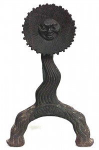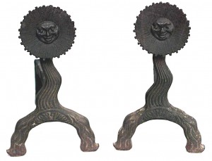 PAIR of American Country (19th Century) wrought iron andirons with sunburst and face design (BRADLEY & HUBBARD) (PRICED AS PAIR)