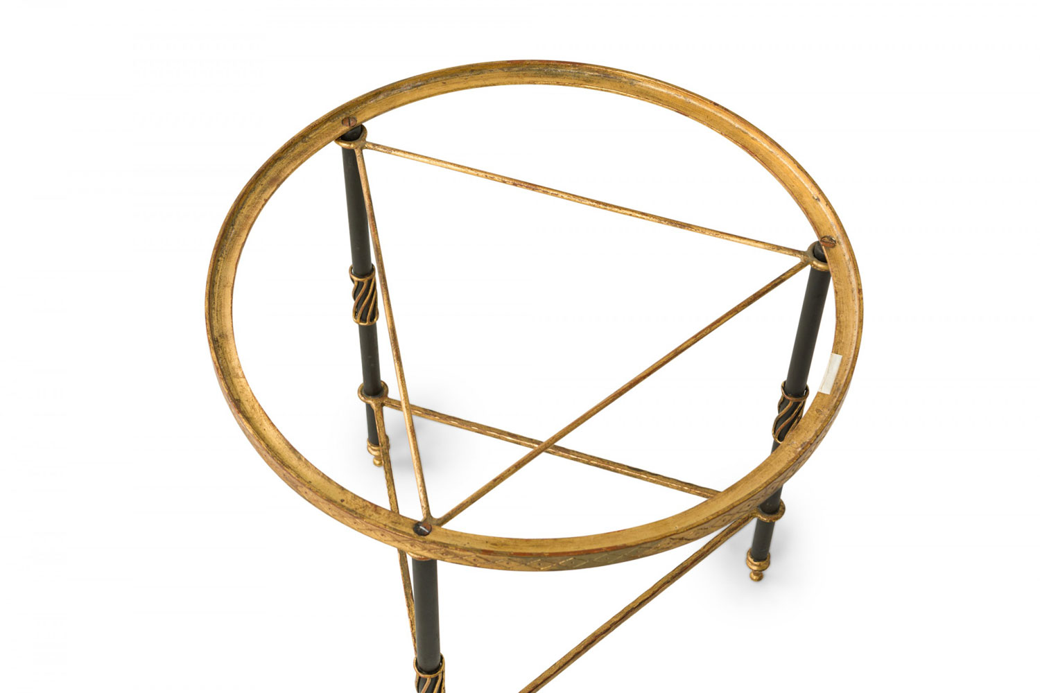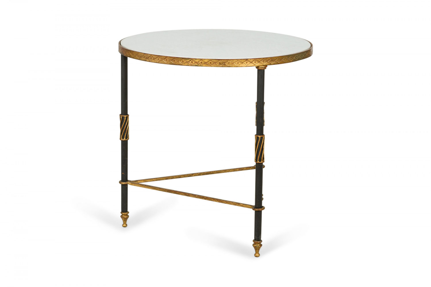 PAIR of Mid-Century circular end / side table with a white marble top supported by a 3-legged black iron frame with gilt iron trim and details. (PALLADIO)(PRICED AS PAIR)