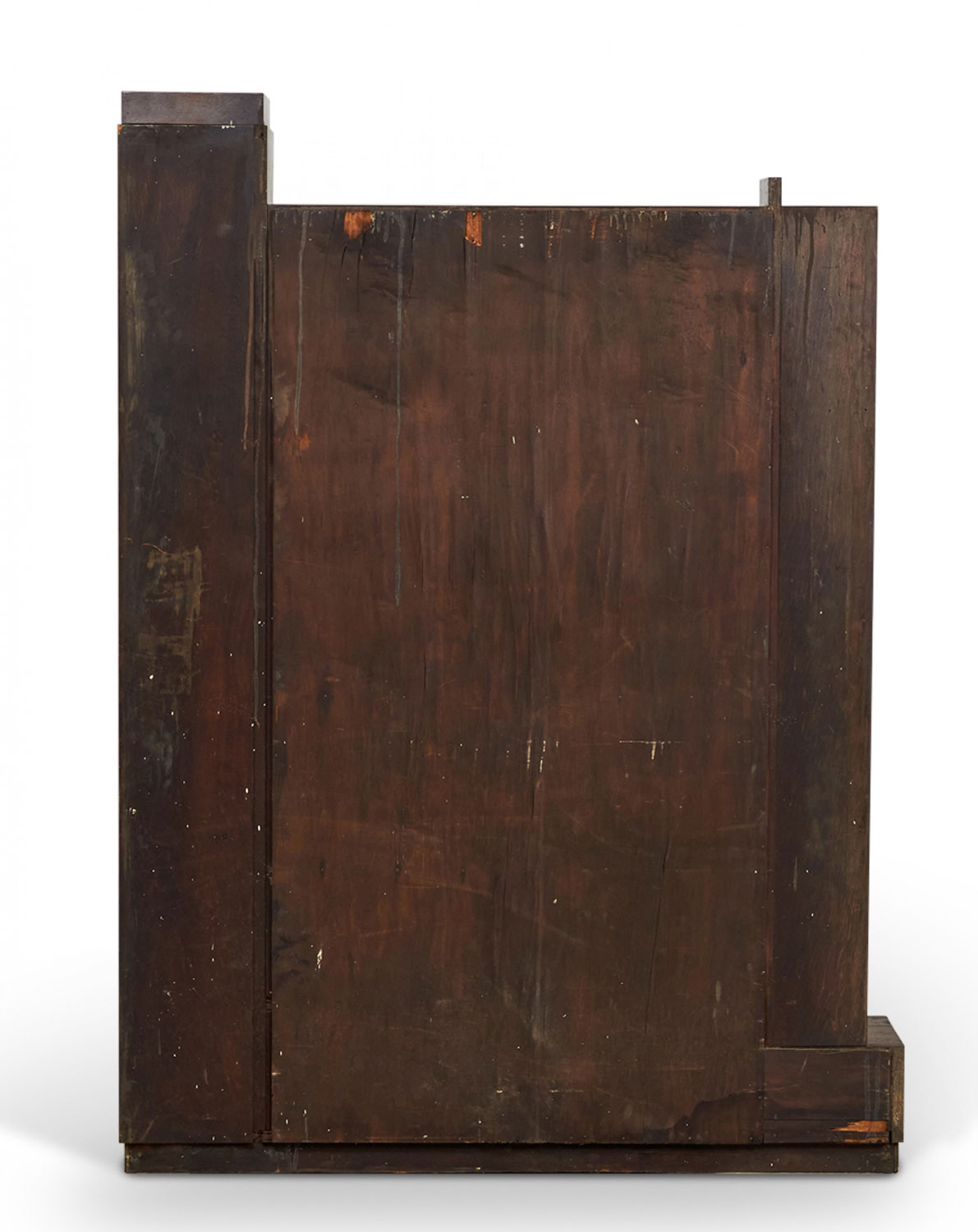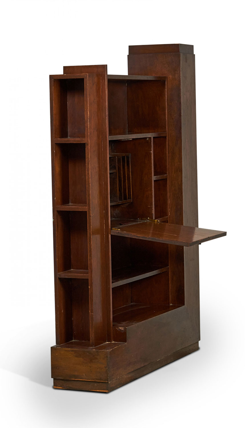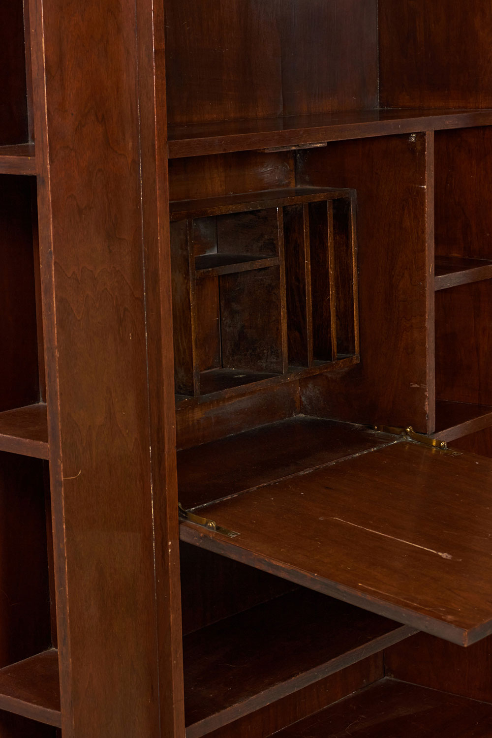 American Mid-Century walnut fall-front skyscraper desk with a main multi-shelved cabinet flanked on either side by additional shelving units with a central panel that falls forward to create a desktop. (PAUL FRANKL)