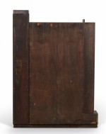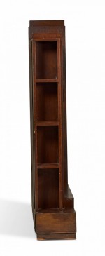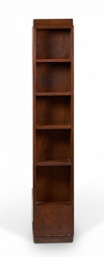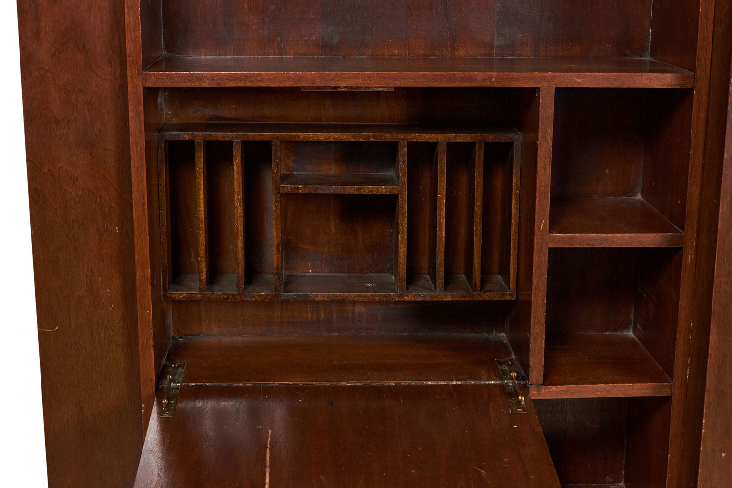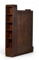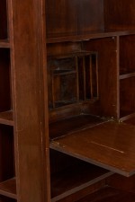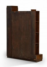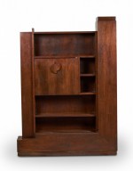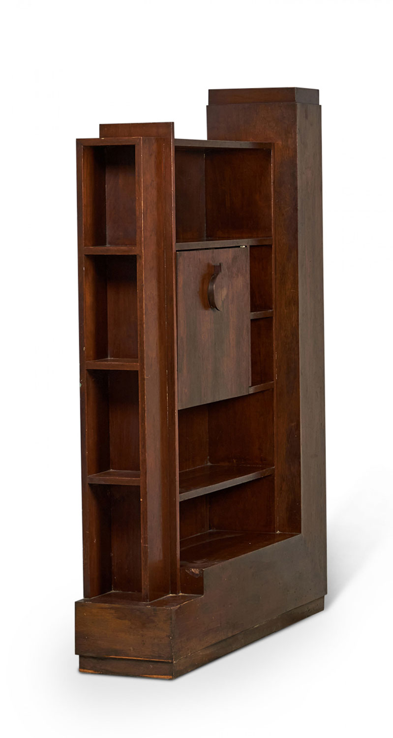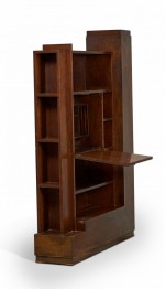 American Mid-Century walnut fall-front skyscraper desk with a main multi-shelved cabinet flanked on either side by additional shelving units with a central panel that falls forward to create a desktop. (PAUL FRANKL).
