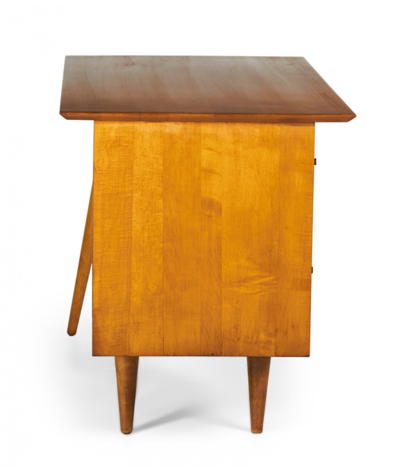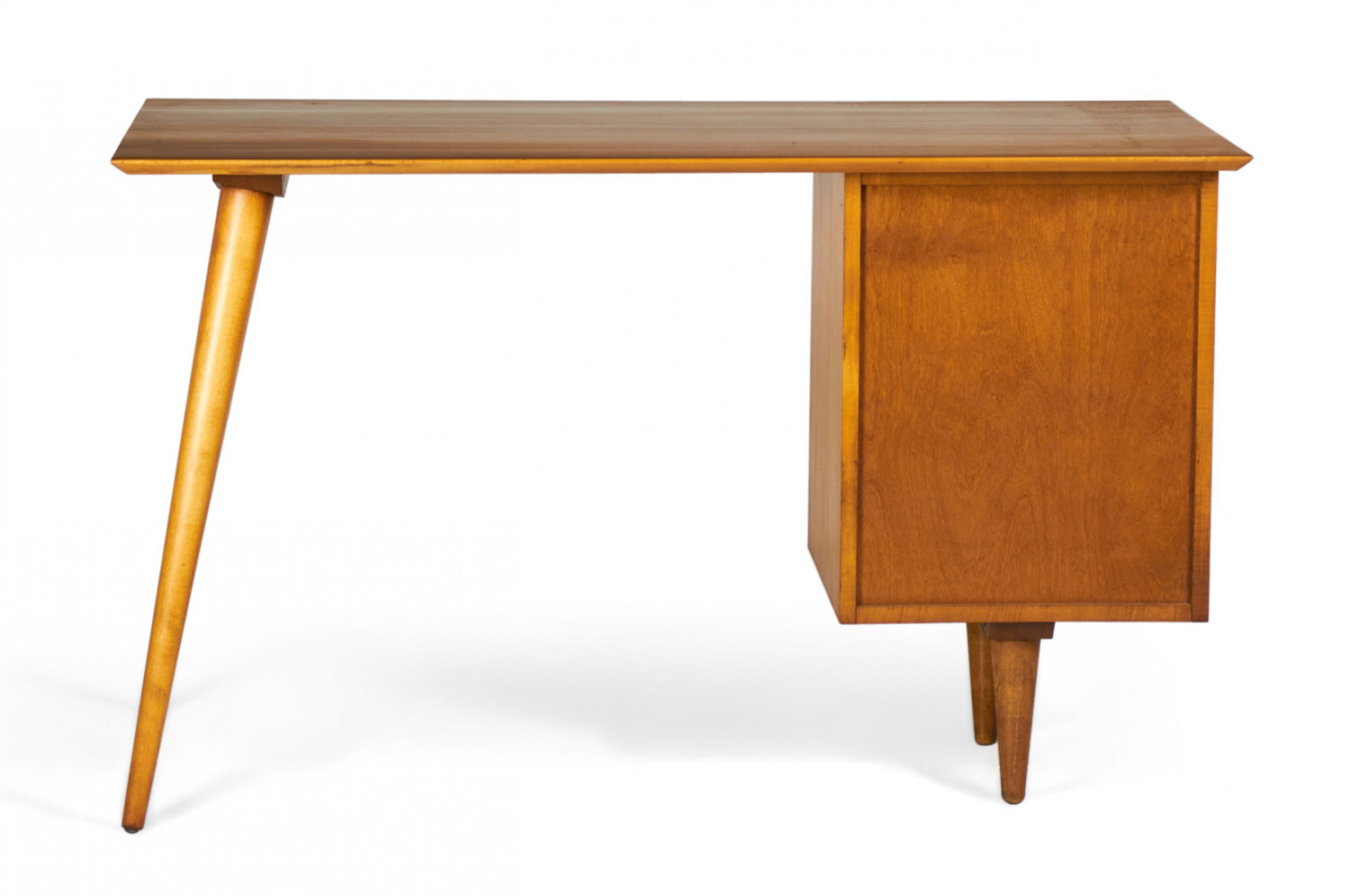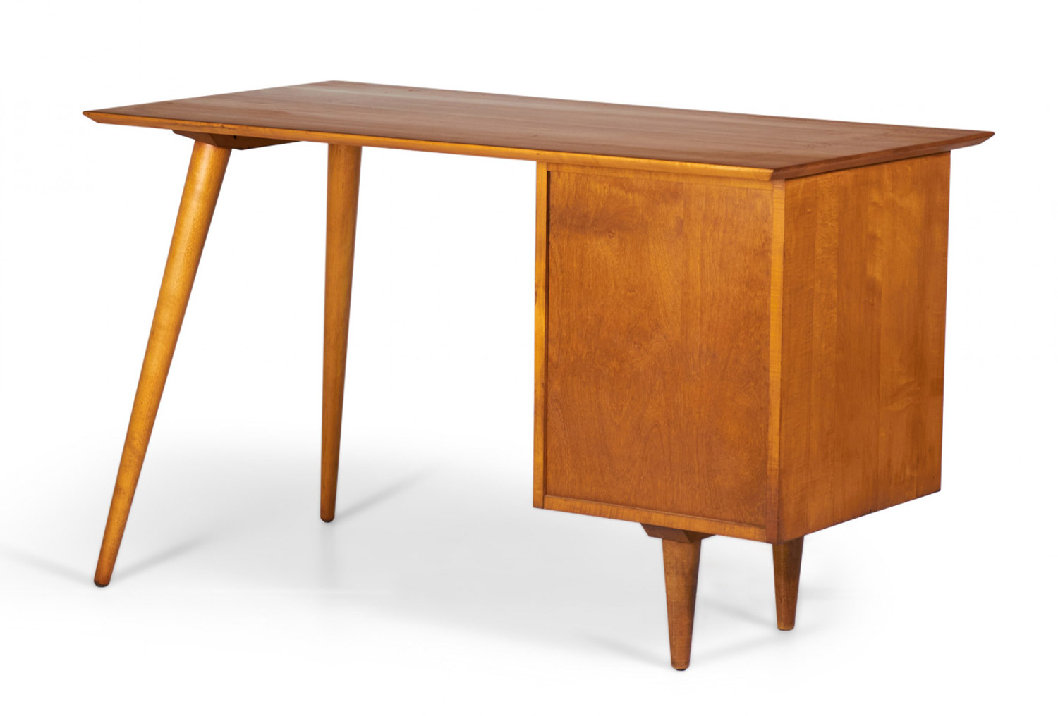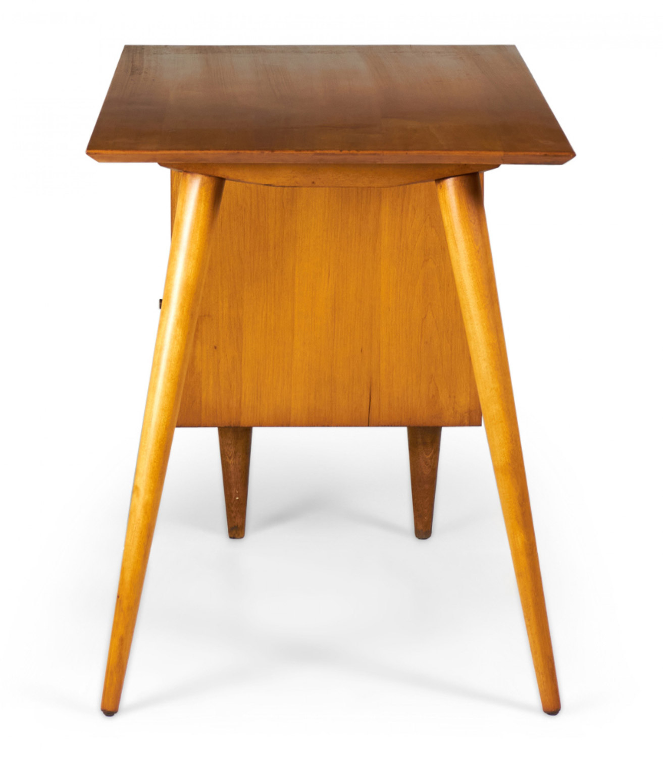 American Mid-Century blond maple student desk with a rectangular desktop supported on the left by two drawers with circular knob pulls resting on two short tapered legs, and on the right by two angled tapered legs. (PAUL MCCOBB, model 1560)(Same model in different finishes: DUF0069, DUF0070).