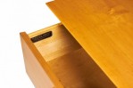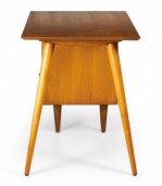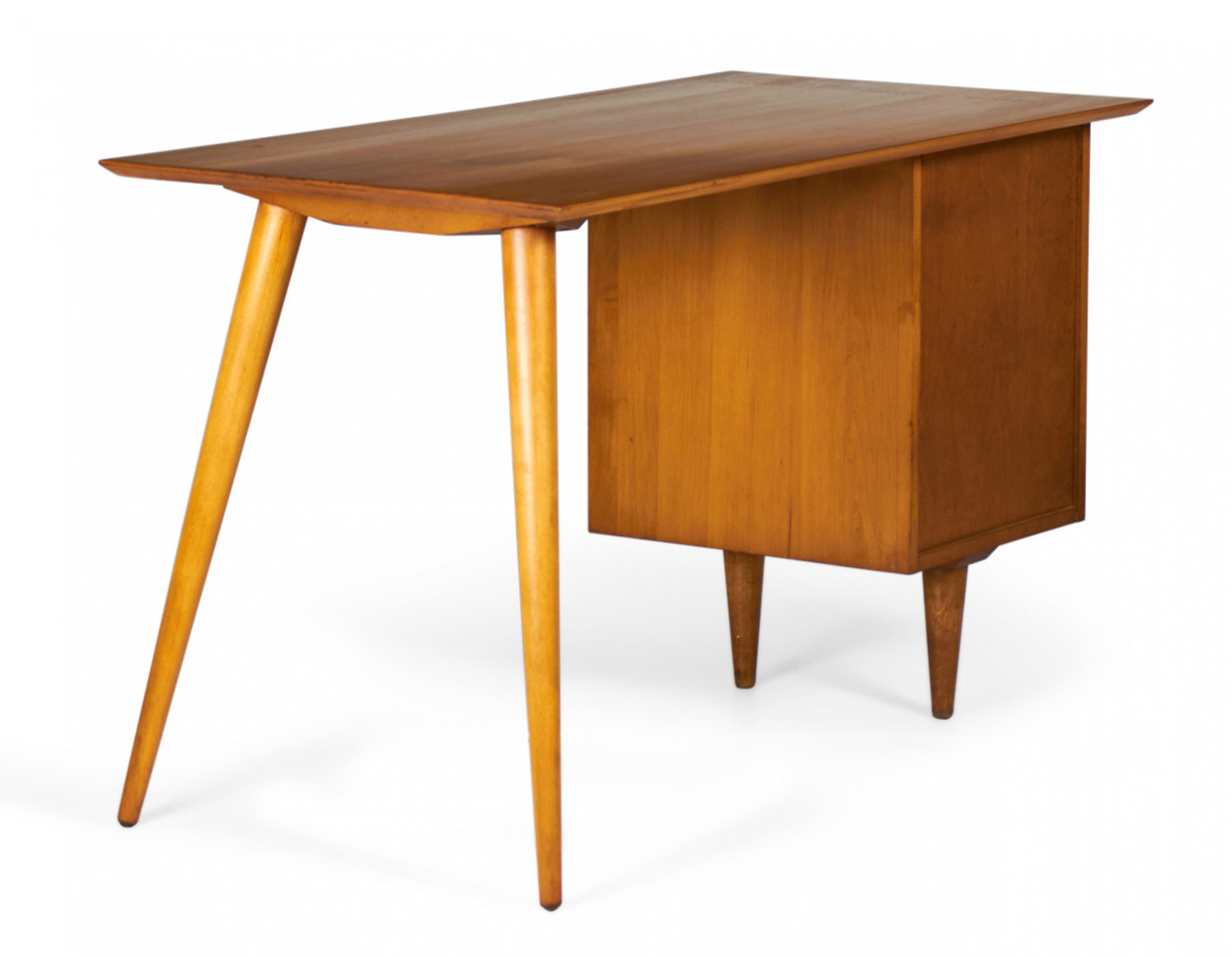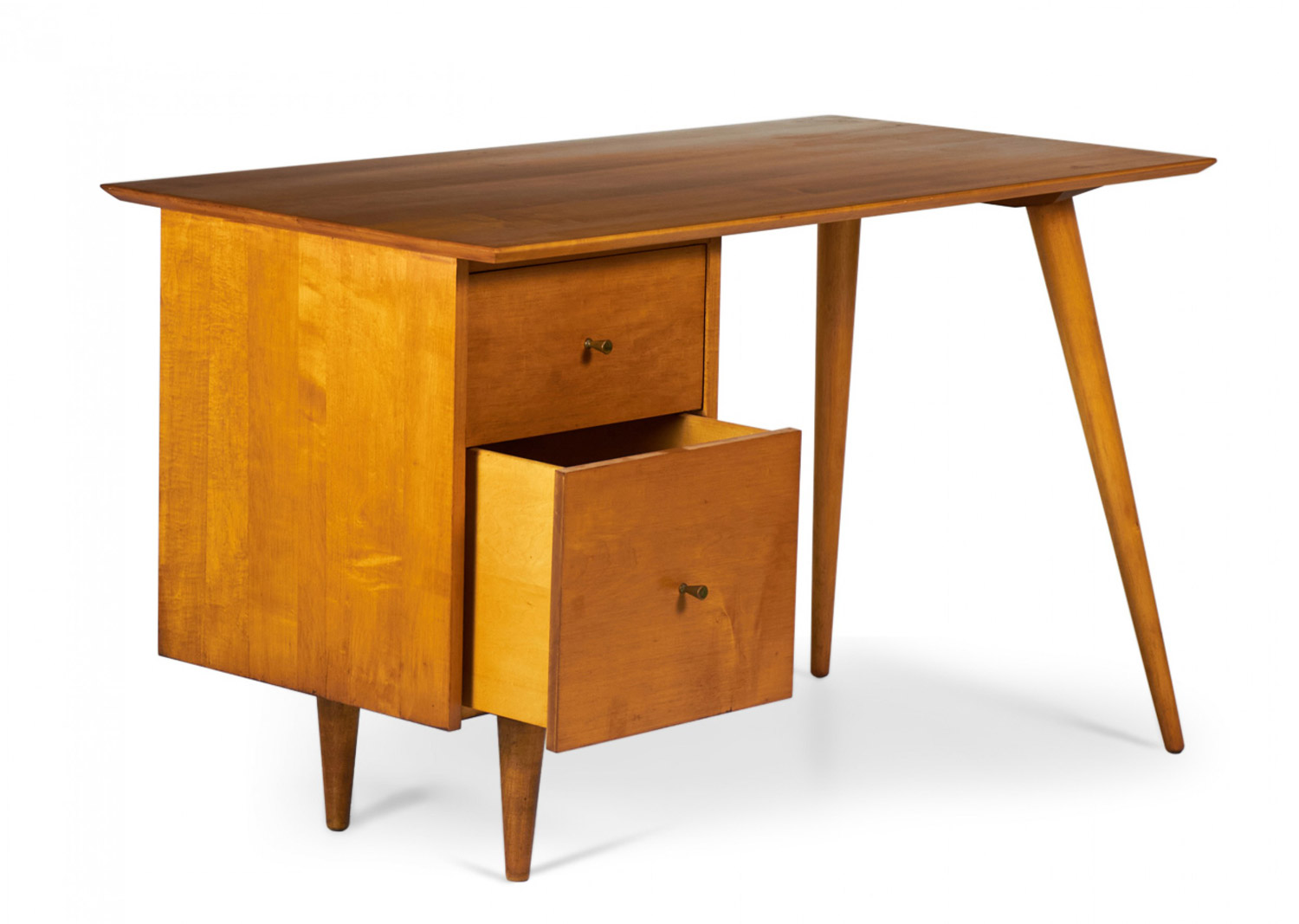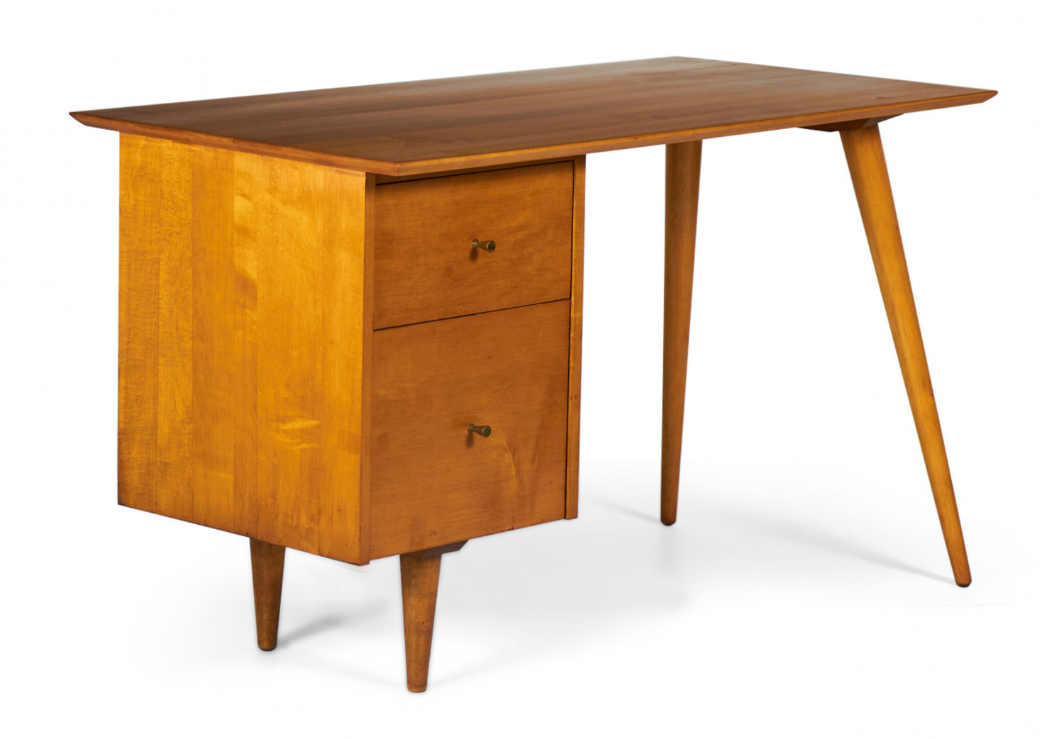 American Mid-Century blond maple student desk with a rectangular desktop supported on the left by two drawers with circular knob pulls resting on two short tapered legs, and on the right by two angled tapered legs. (PAUL MCCOBB, model 1560)(Same model in different finishes: DUF0069, DUF0070).