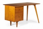 American Mid-Century blond maple student desk with a rectangular desktop supported on the left by two drawers with circular knob pulls resting on two short tapered legs, and on the right by two angled tapered legs. (PAUL MCCOBB, model 1560)(Same model in different finishes: DUF0069, DUF0070)