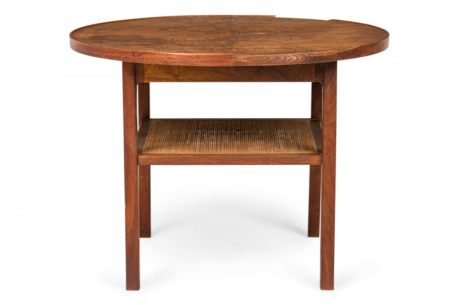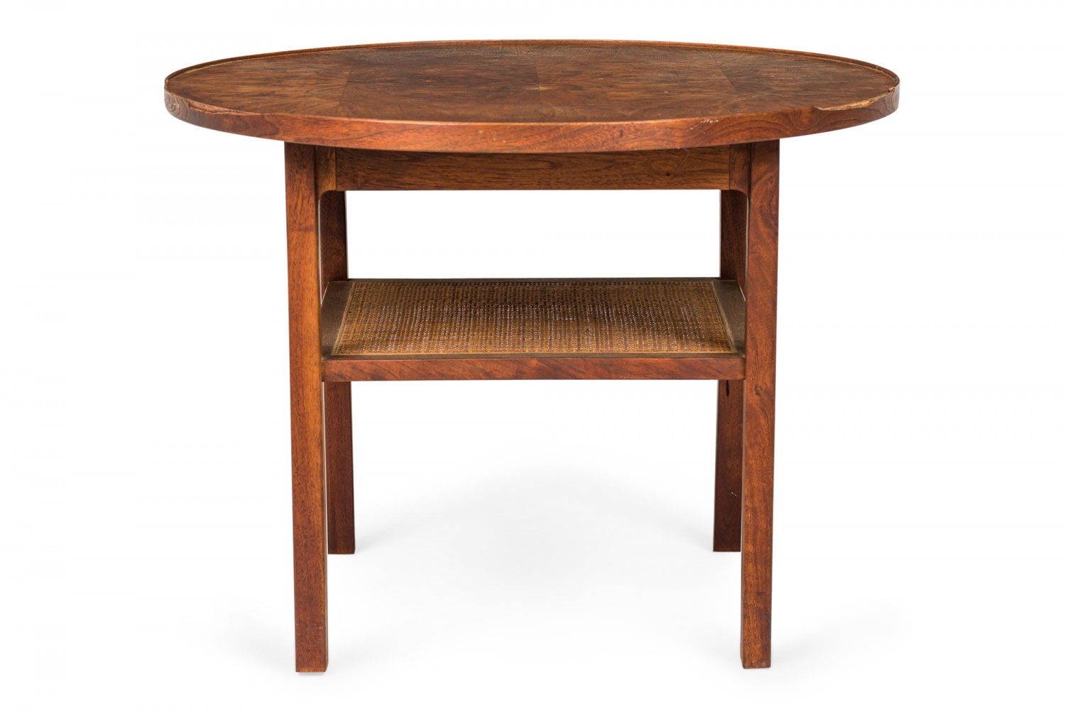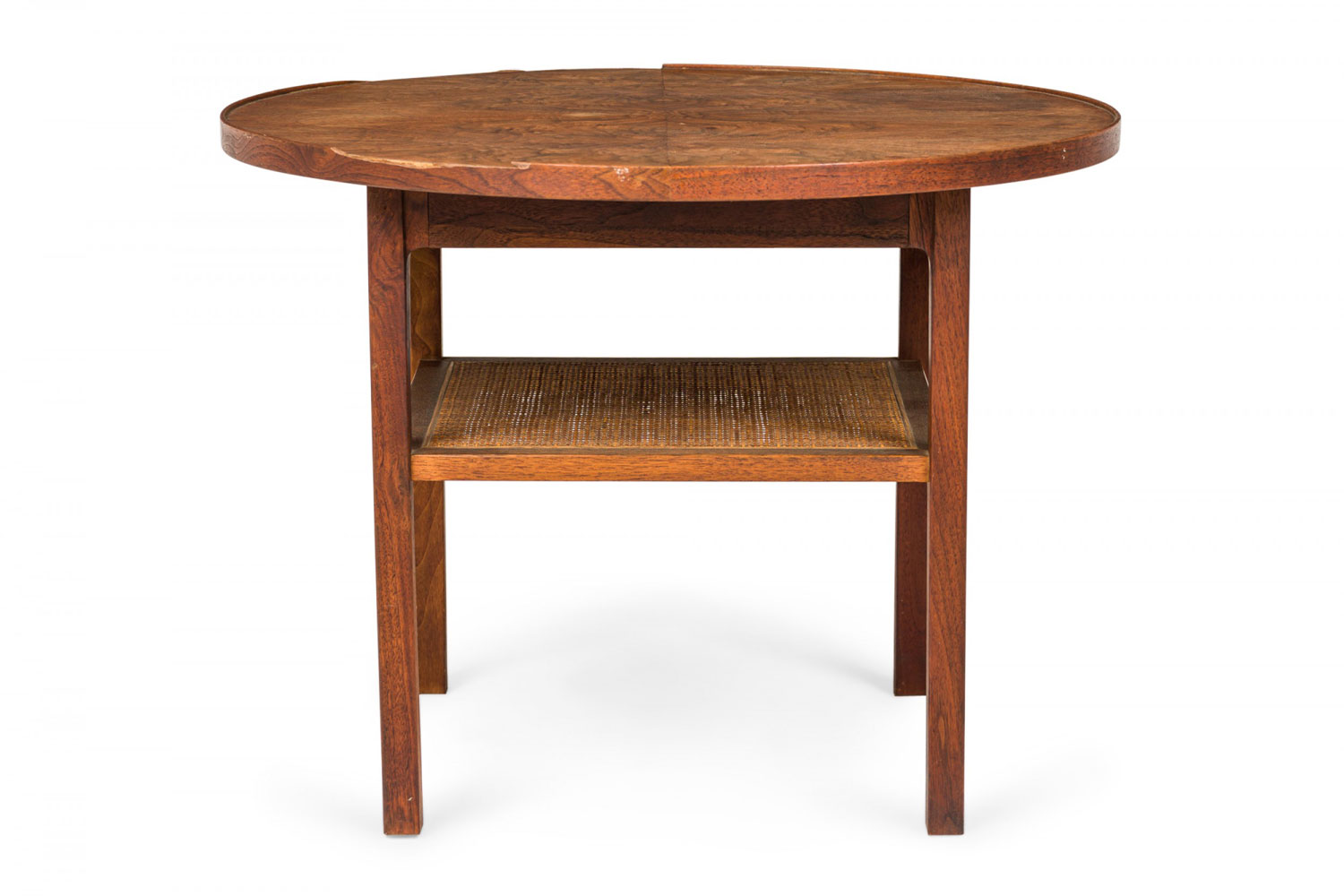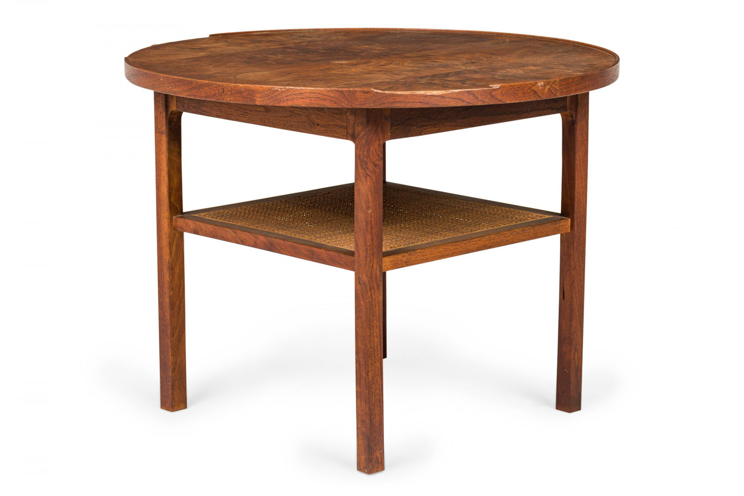 Style: Mid-Century Materials & Techniques: Caning, walnut, wood Category: Tables Condition: Edge veneer loss in two long upper sections, minor finish damage to tabletop. Good; Minor losses