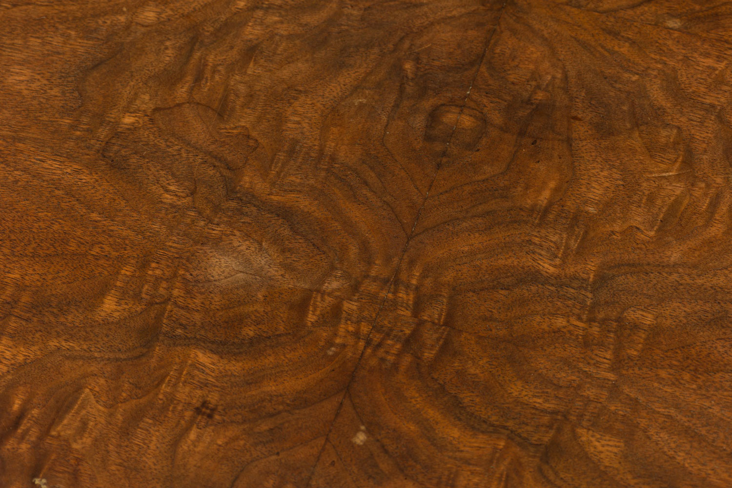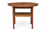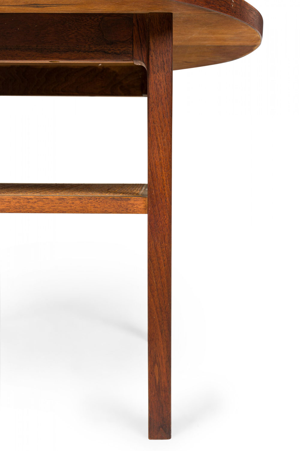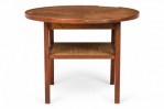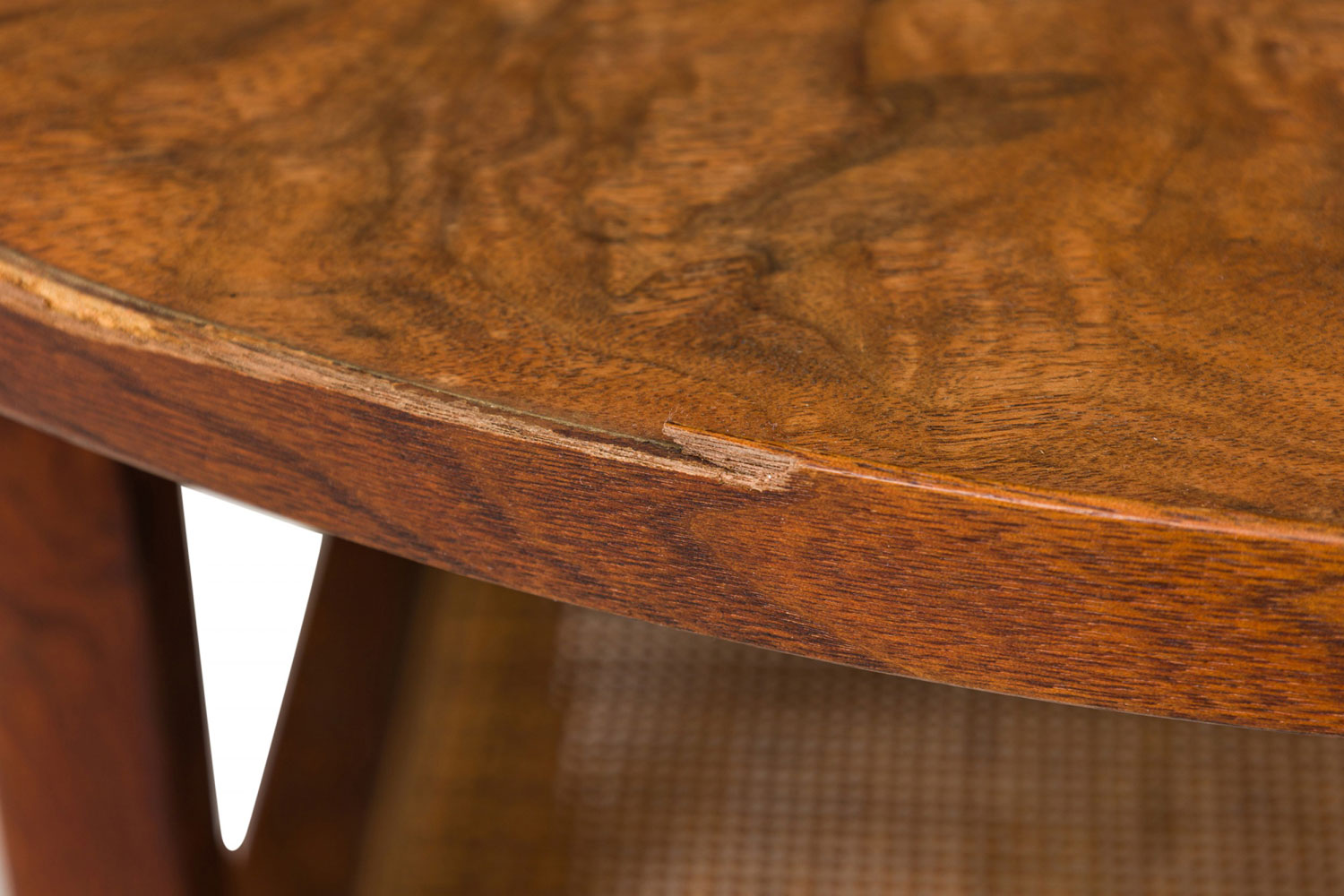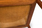 Style: Mid-Century Materials & Techniques: Caning, walnut, wood Category: Tables Condition: Edge veneer loss in two long upper sections, minor finish damage to tabletop. Good; Minor losses