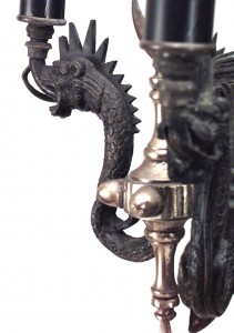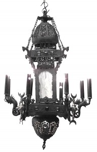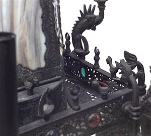 Middle Eastern Persian (19th Century) iron filigree and brass trimmed chandelier with 6 dragon design arms with glass jewels and stained glass panels