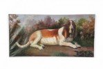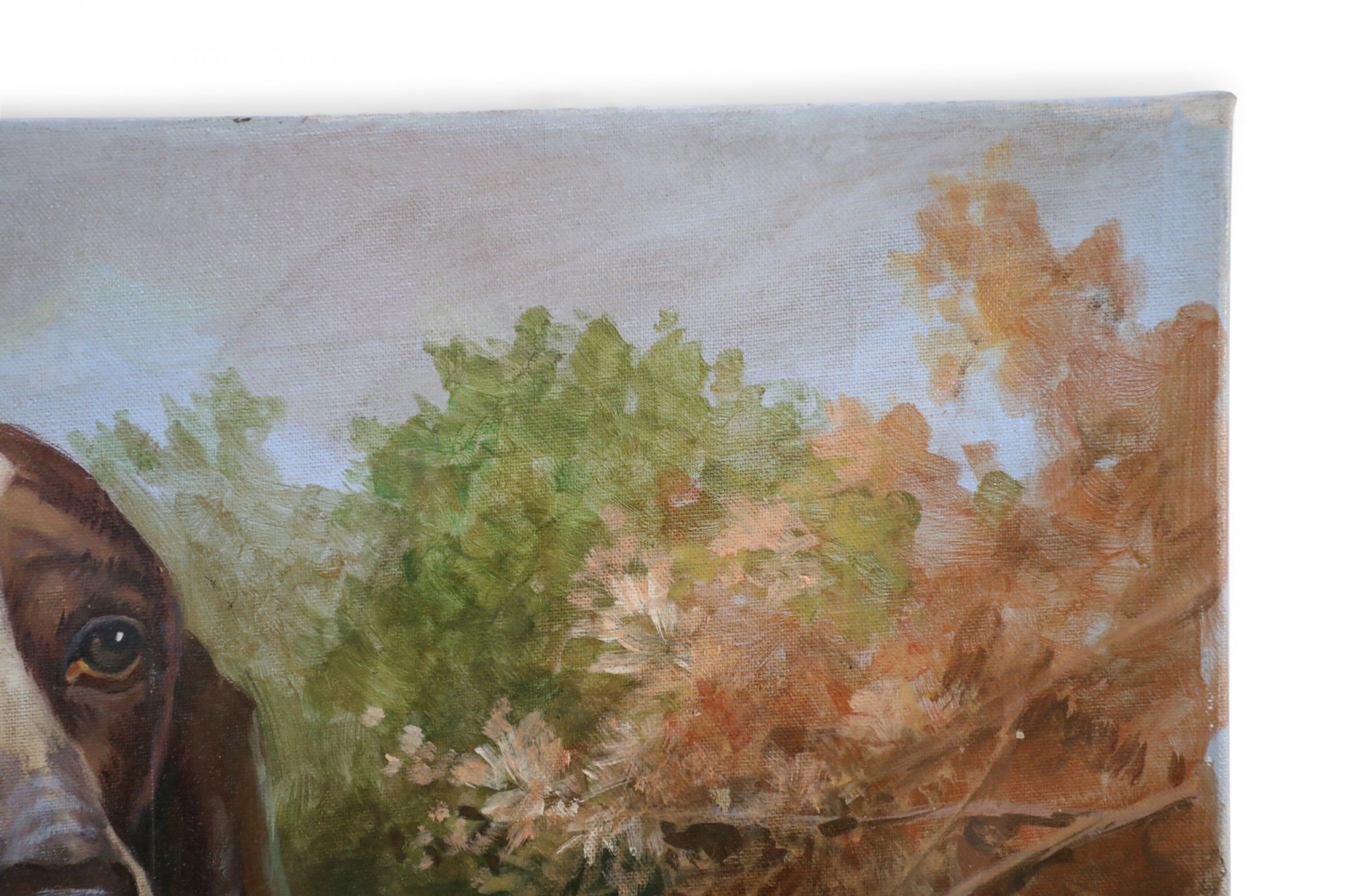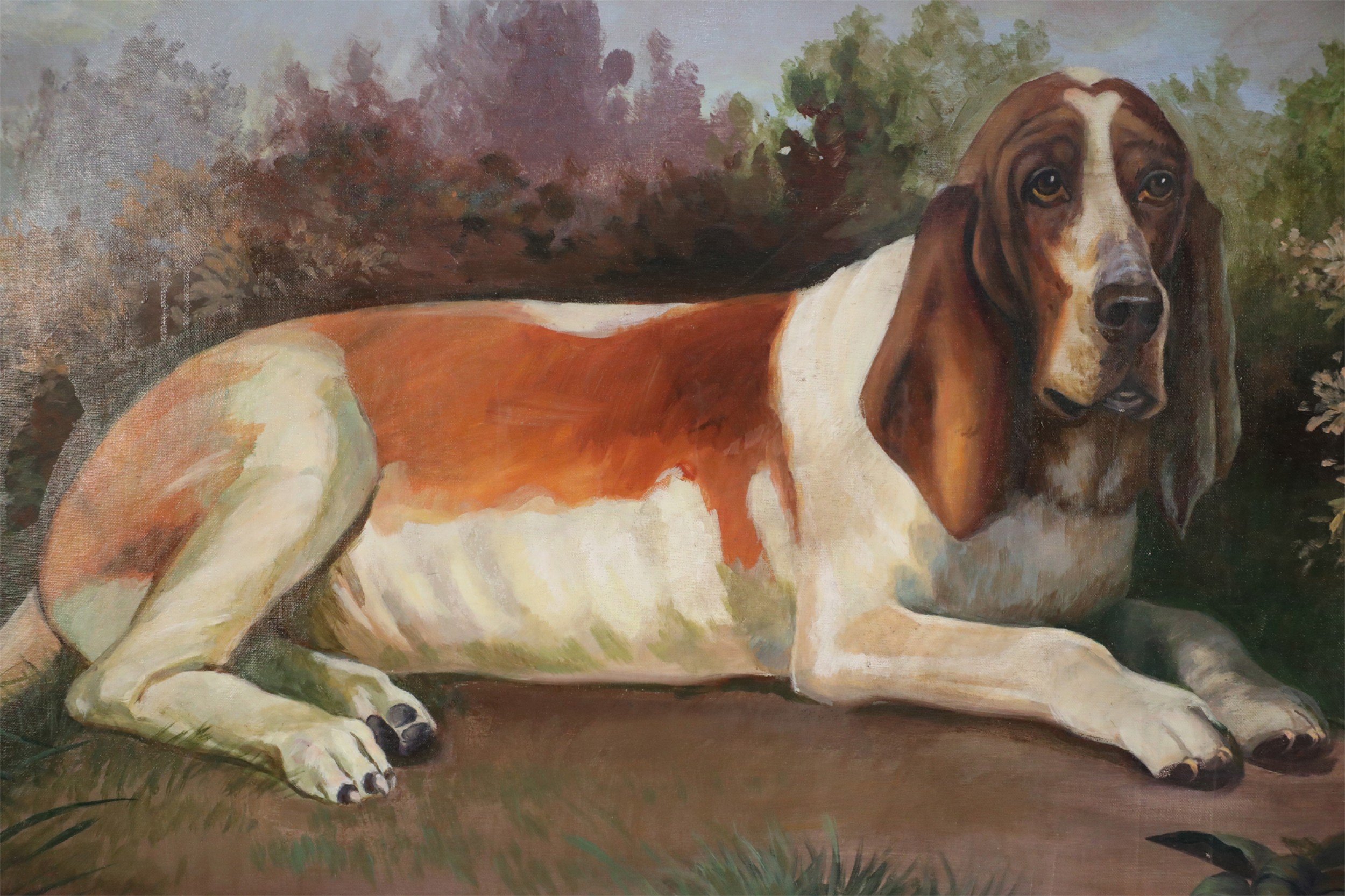 English Victorian style (20th Century) portrait of a brown and white basset hound captured on a path amid grasses and autumnal plants and trees, on a large rectangular unframed canvas (Similar copies with slight variations: NWL2274B, NWL2274C)..