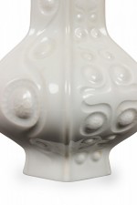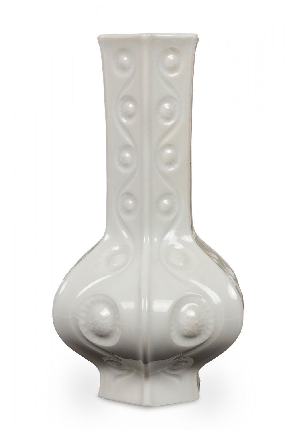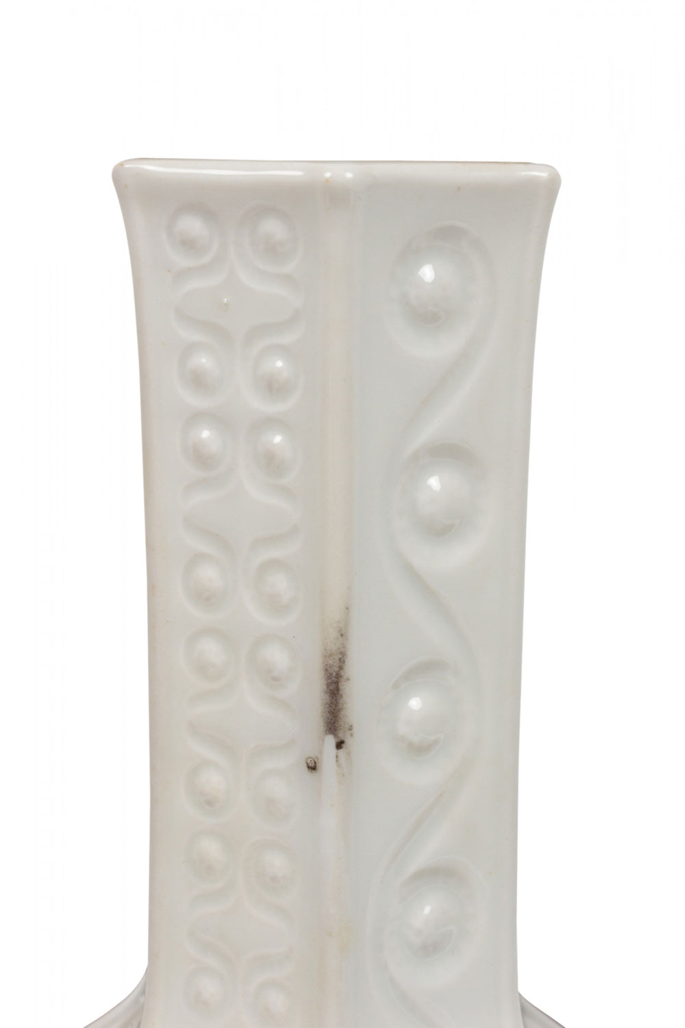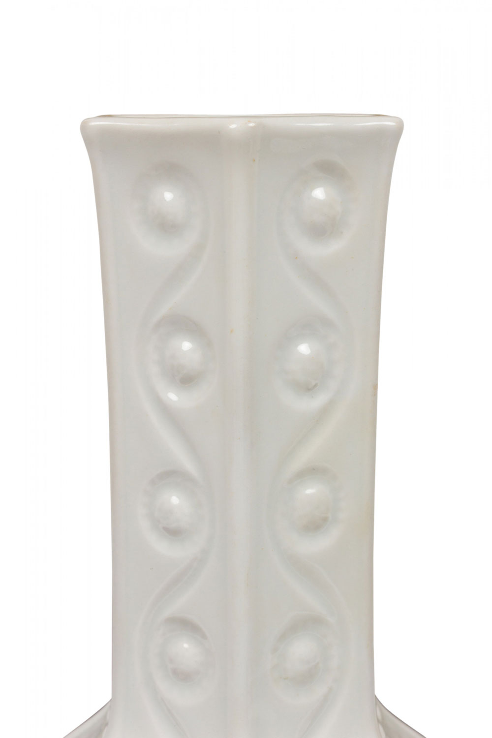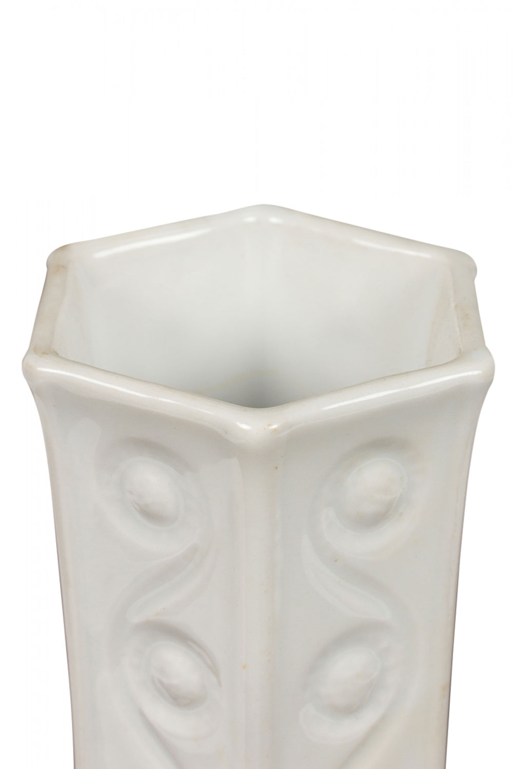 Bavarian German Mid-Century white porcelain vase with a square vase and a bulbous bottom extending to a narrow square neck with an incised spiral pattern. (mark on bottom, BAVARIA SCHUMAN ARZBERG GERMANY)