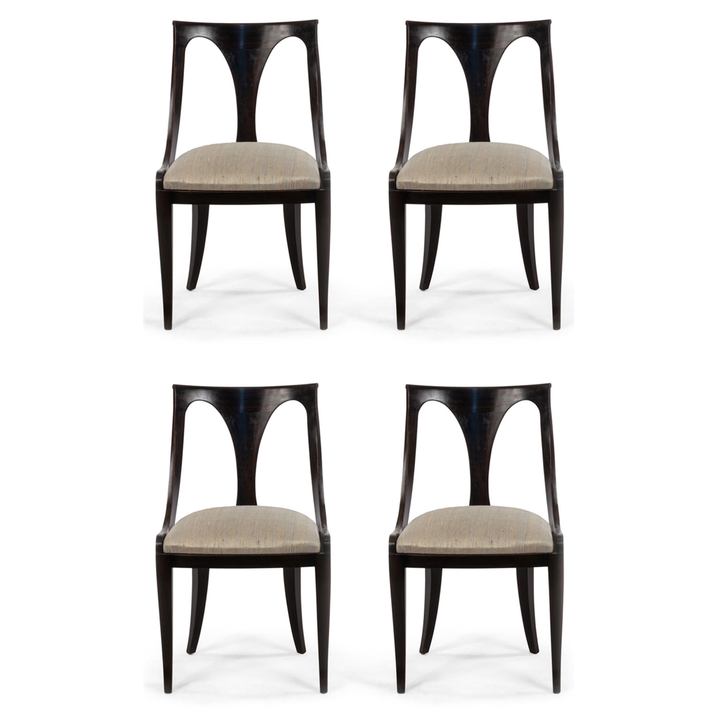 SET of 4 Contemporary Empire-style black lacquer dining chairs with a sleigh design open back with a cream & blue shot raw silk upholstered seats..