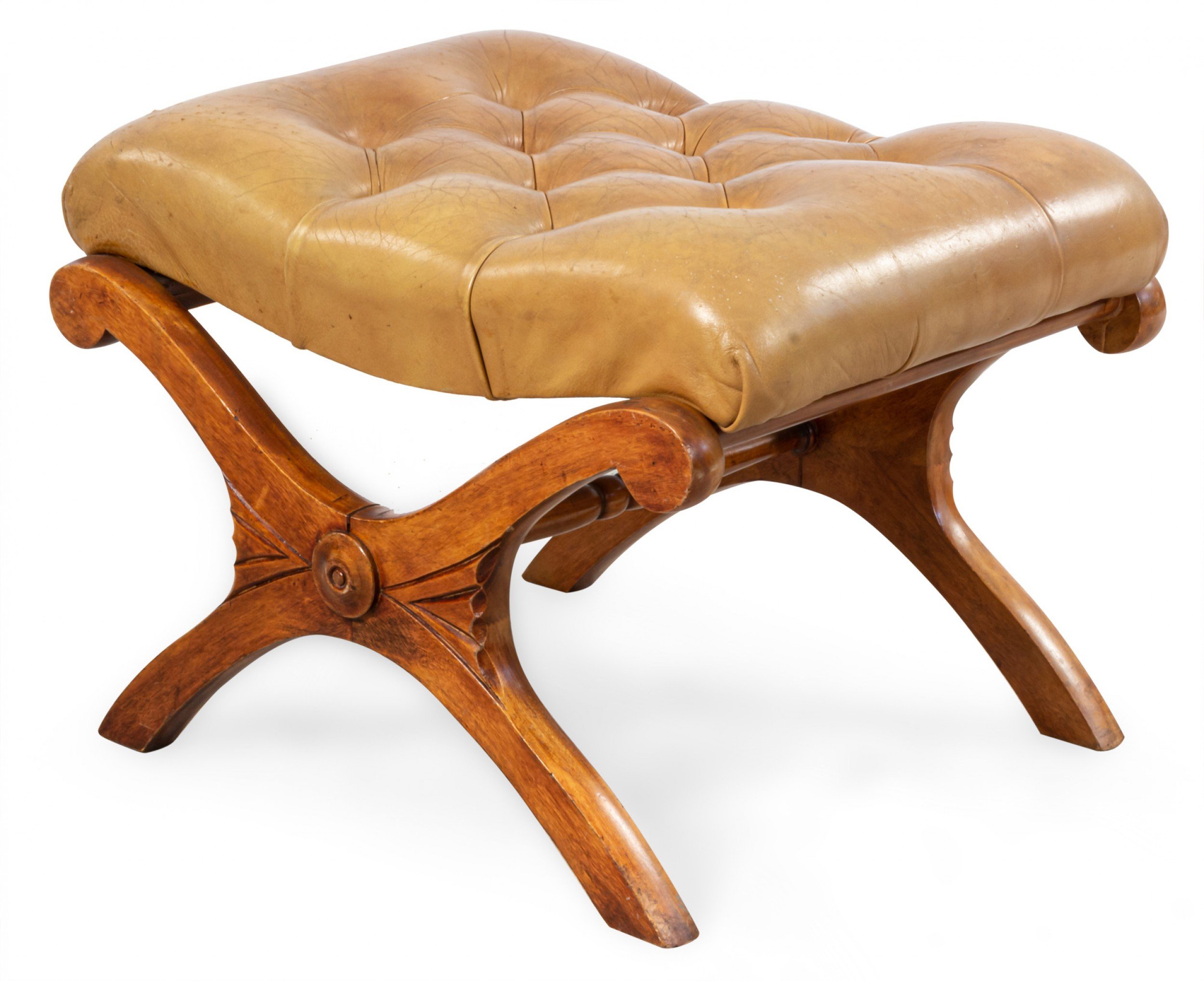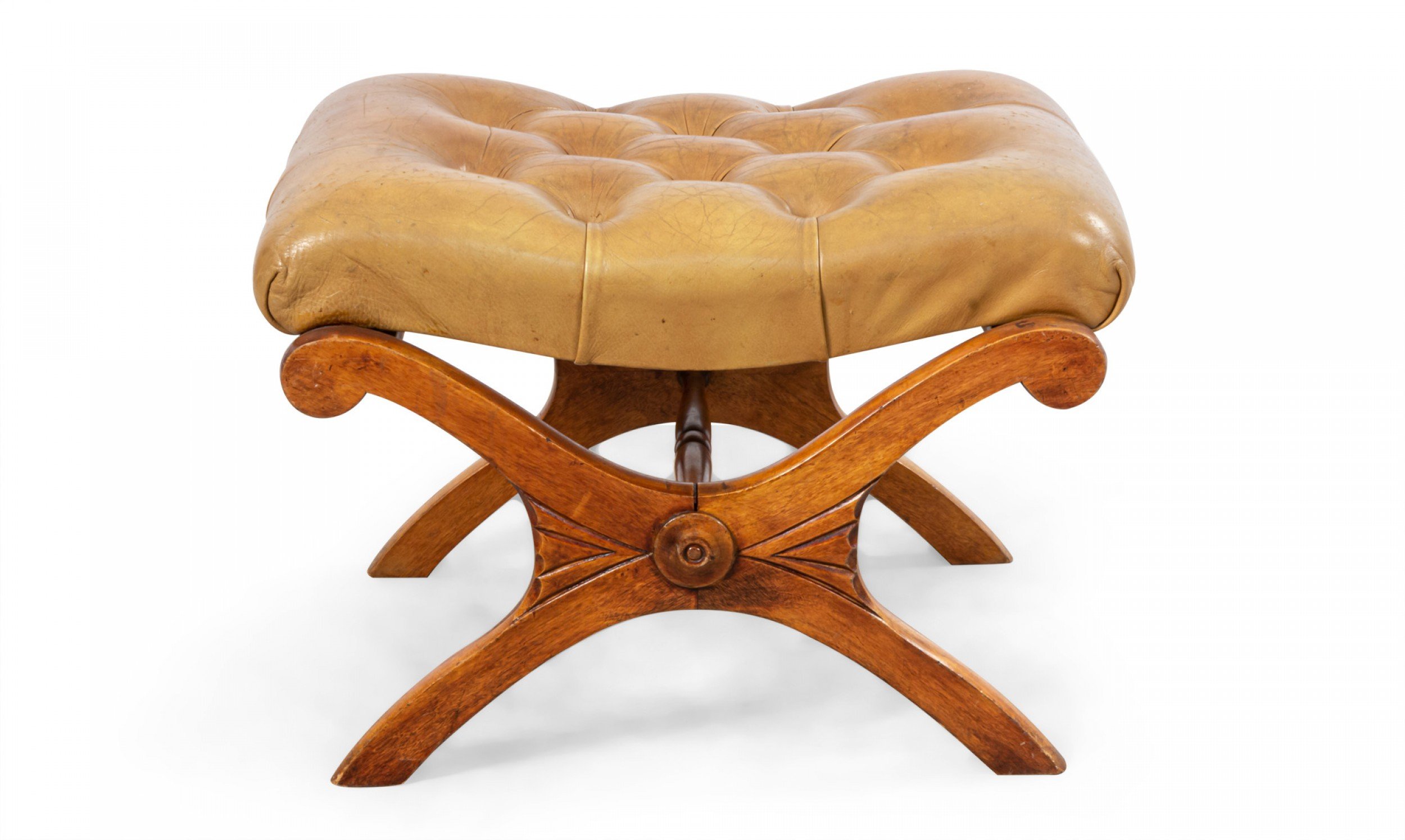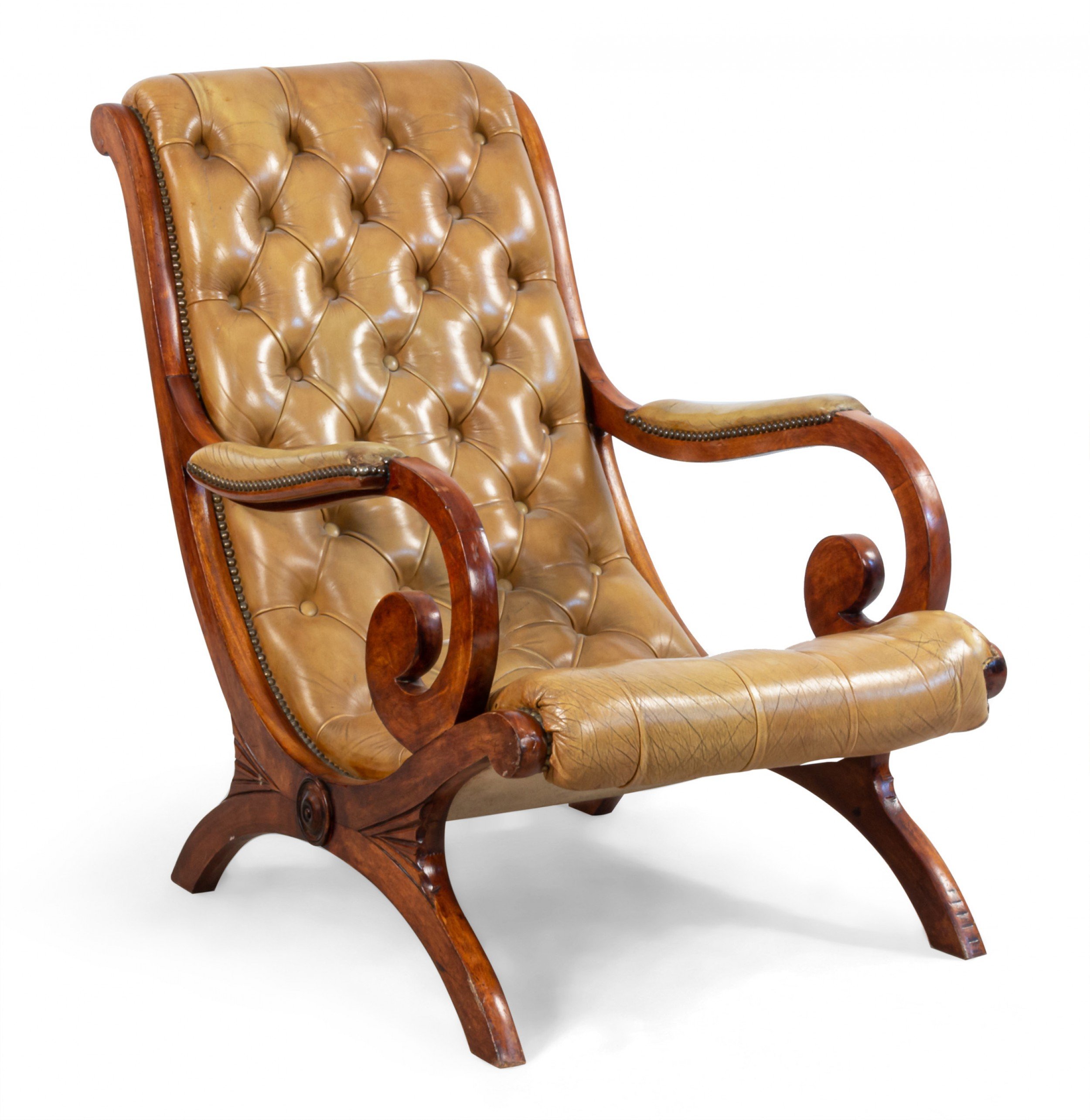 SET of French Campaign style mahogany lounge armchairs and matching ottoman with button tufted tan leather upholstery (PRICED AS SET)
