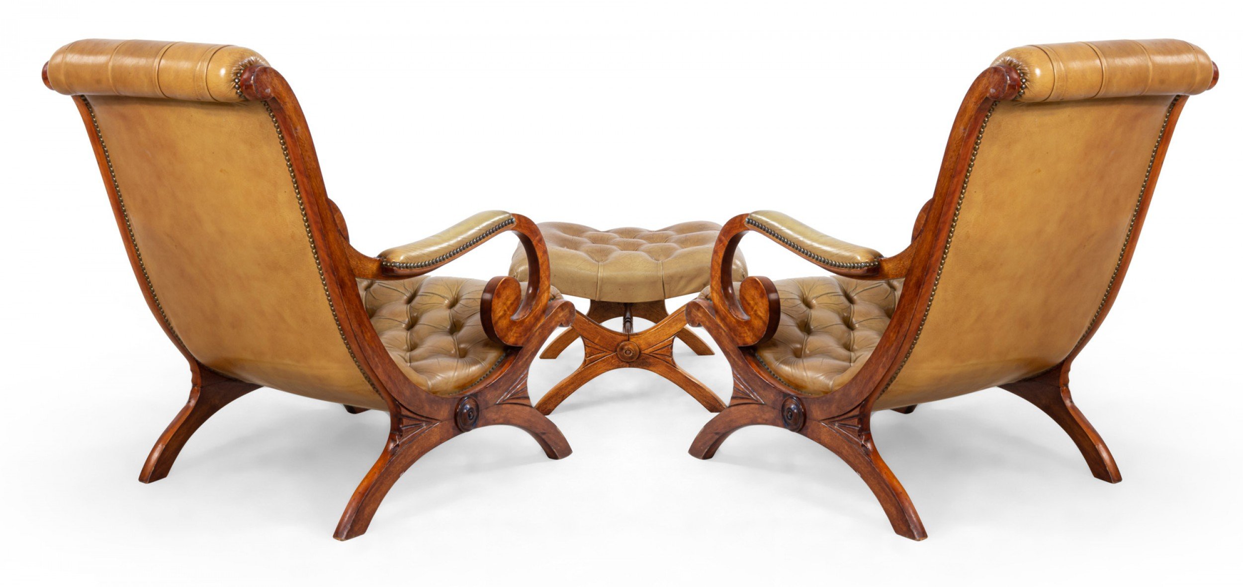 SET of French Campaign style mahogany lounge armchairs and matching ottoman with button tufted tan leather upholstery (PRICED AS SET).