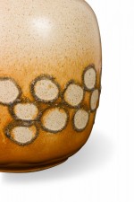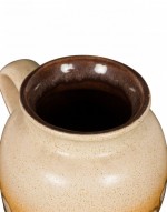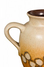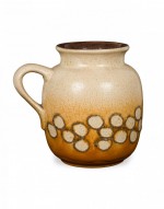 East German Mid-Century ceramic pitcher with an abstract band of brown circles around the base against a variagated glaze that travels from rusty brown at the base to beige towards the top of the vessel. (mark on bottom, STREHLA GDR 2040)