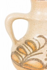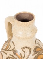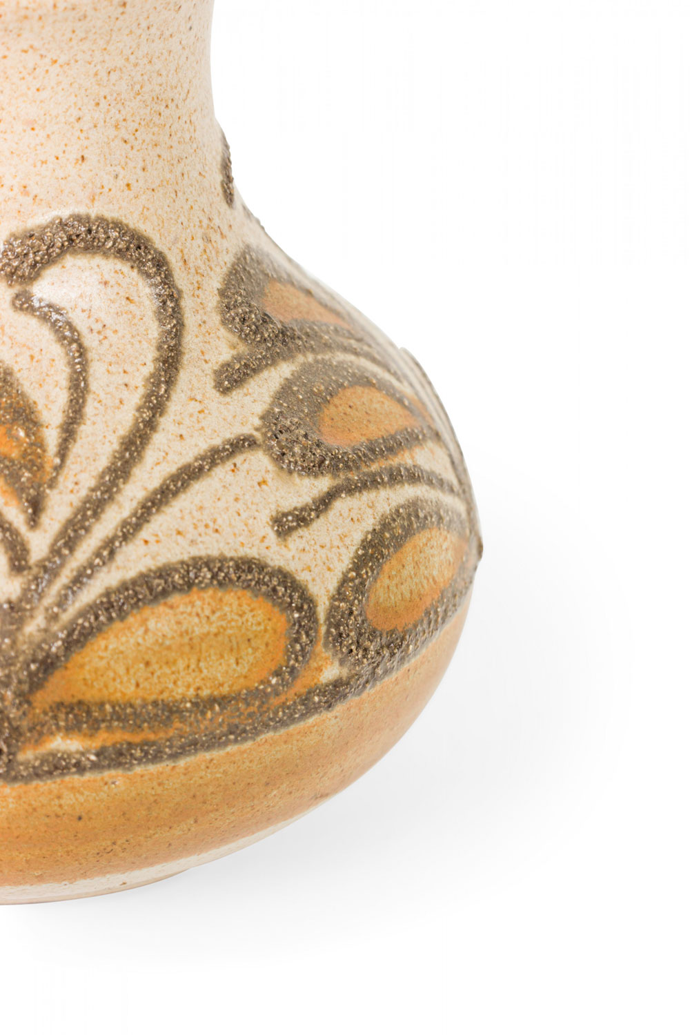 East German Mid-Century ceramic jug with a dark and light brown leaf and plant design around the bulbous bottom against a beige ground. (STREHLA KERAMIK, mark on bottom, STREHLA)(Similar piece: 063116)