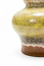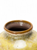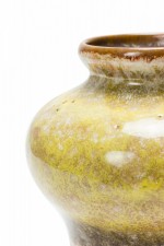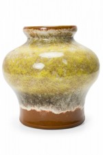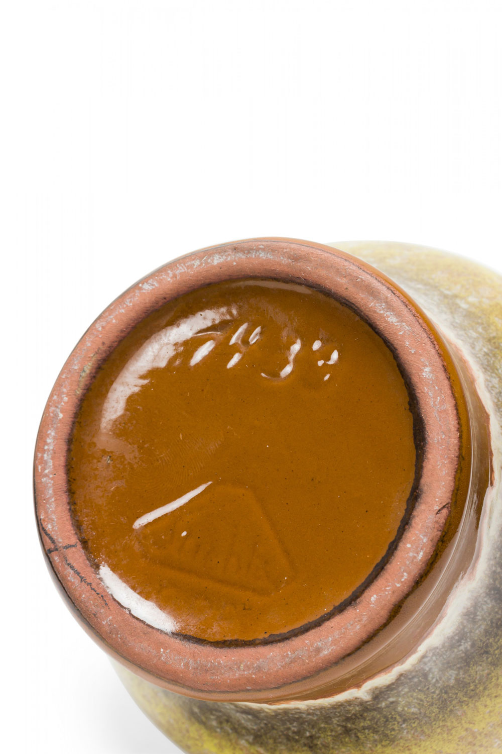 East German Mid-Century bulbous-form ceramic vase with a mottled yellow glaze with brown and gray stripes around the mouth and base. (mark on bottom, STREHLA GDR 1933)