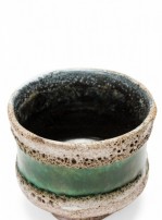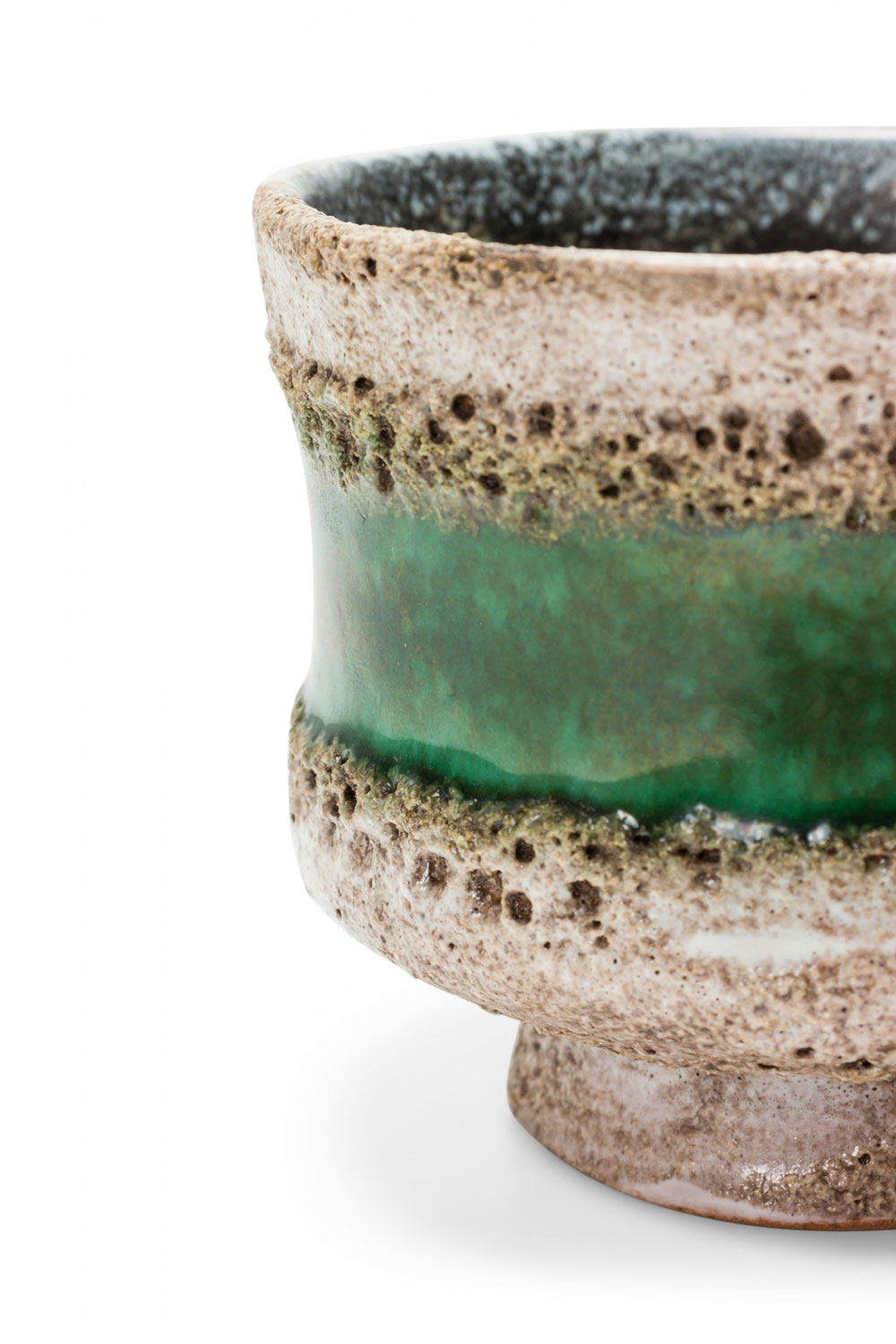 East German Mid-Century ceramic pot with a pitted fat lava brown and beige glaze with a central green band. (mark on bottom, STREHLA KERAMIK MADE IN GDR).