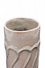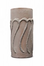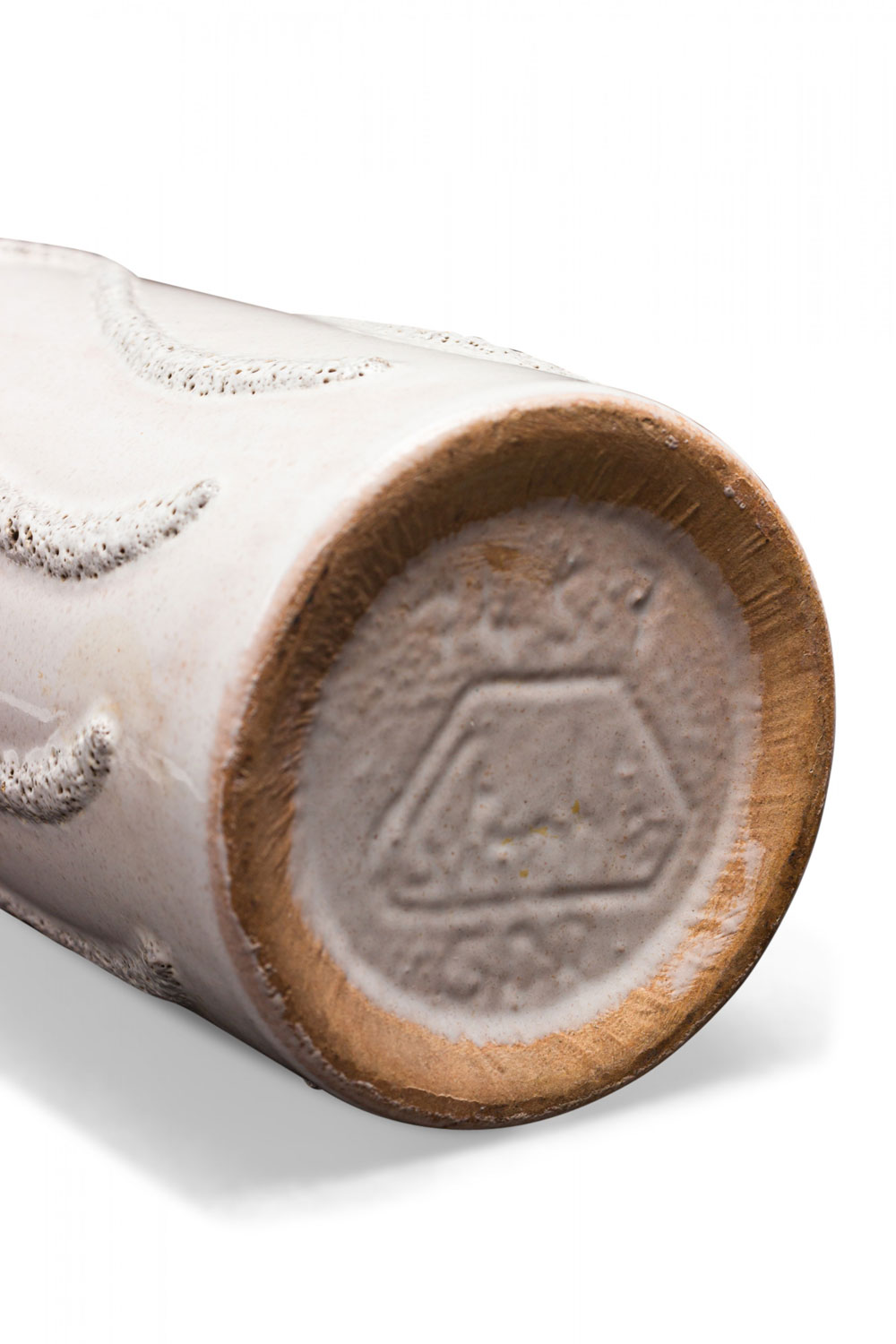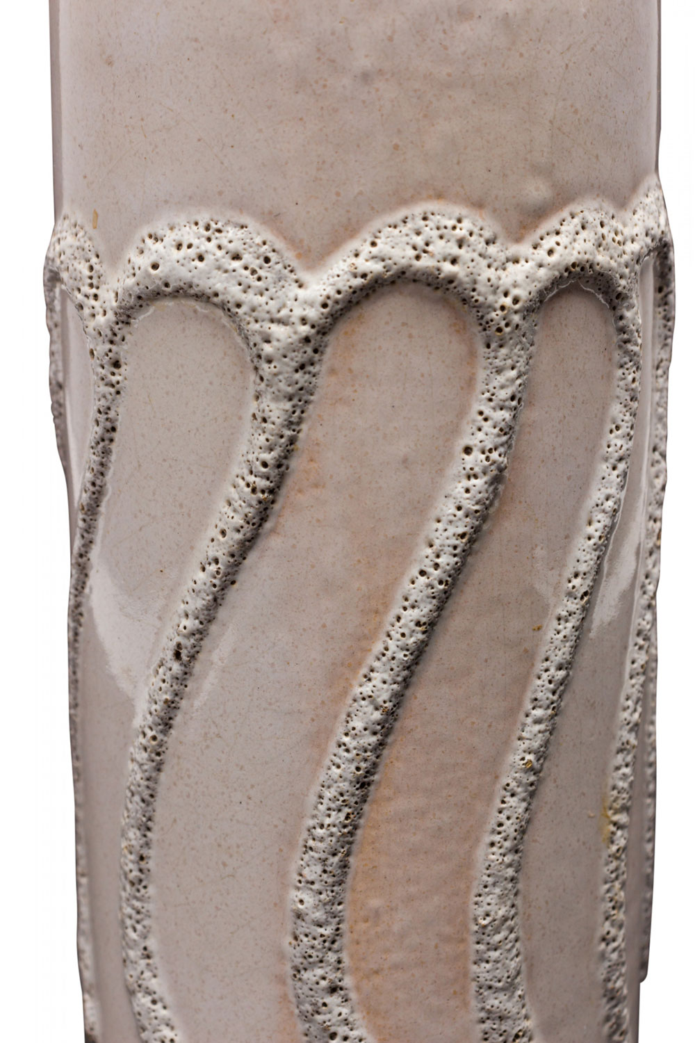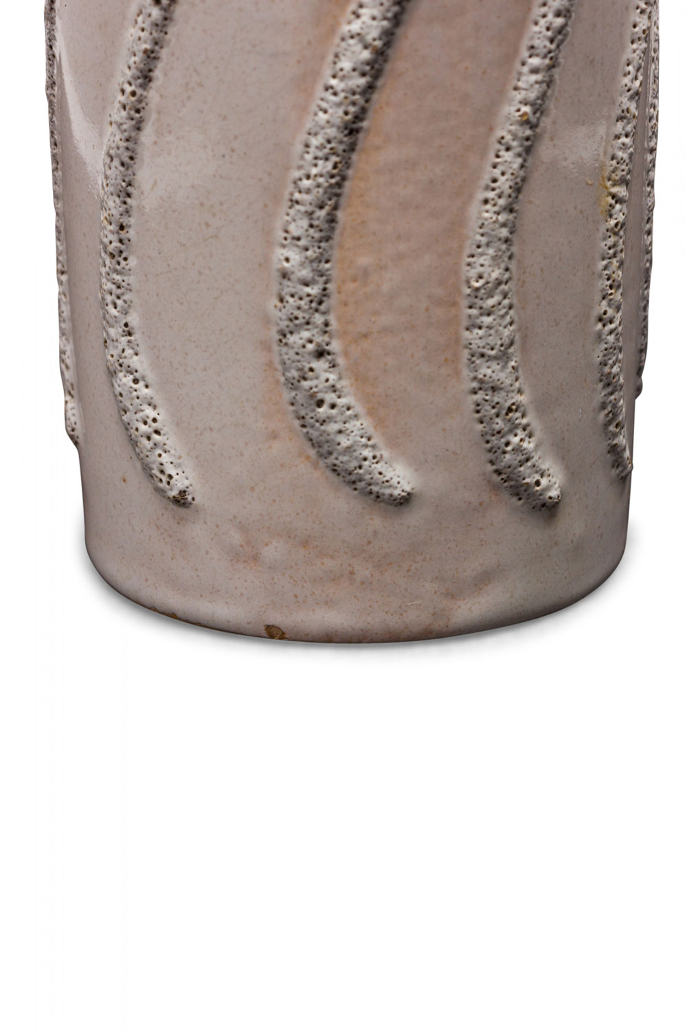 East German Mid-Century cylindrical ceramic vase with a raised pitted gray wave design against a beige glazed ground. (STREHA KERAMIK, mark on bottom, STREHLA GDR)