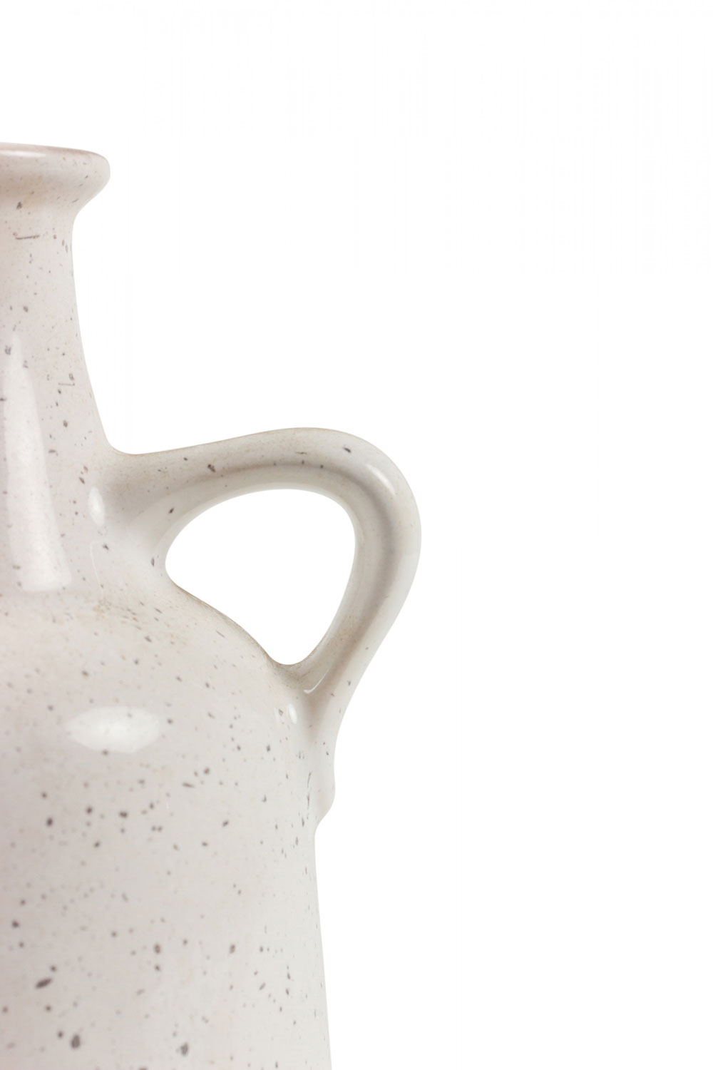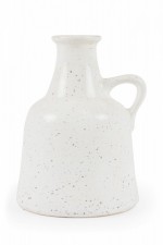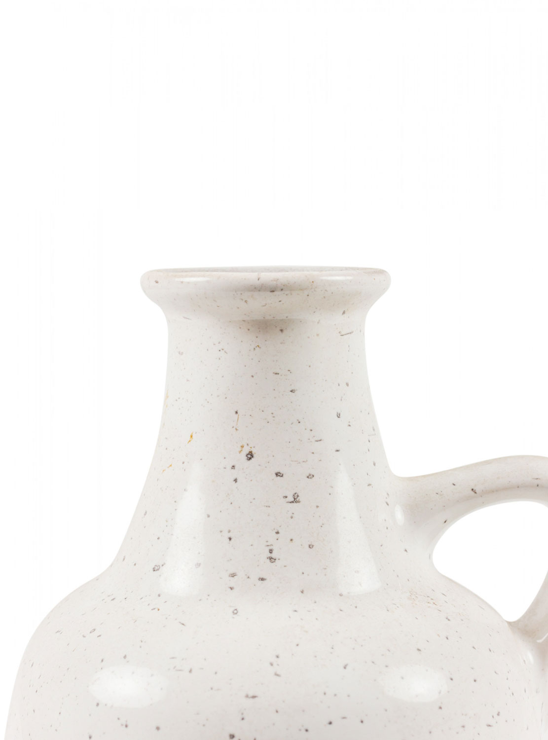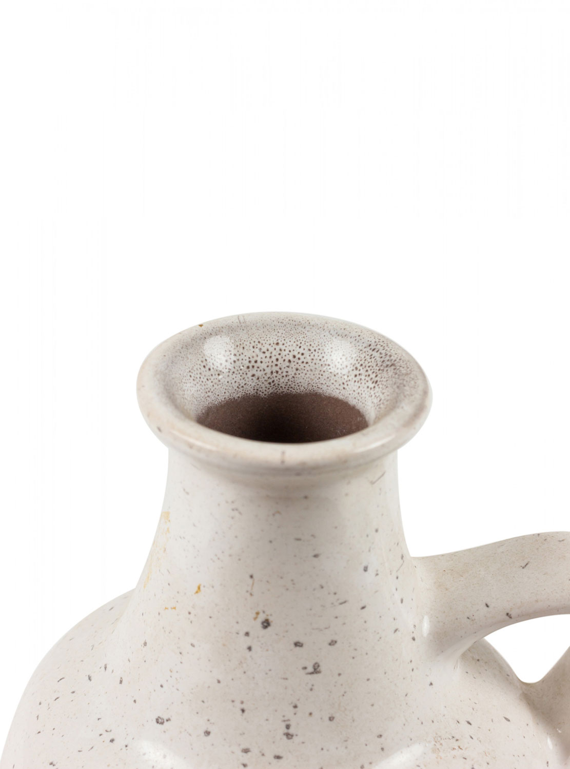 East German Mid-Century ceramic jug with a speckled white glaze and small round handle nestled between the body and the tapered neck. (stamped on bottom, STREHLA GDR)
